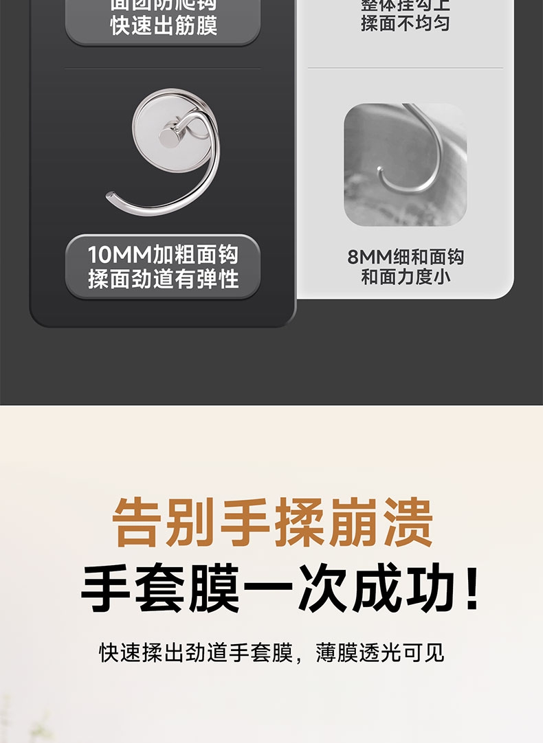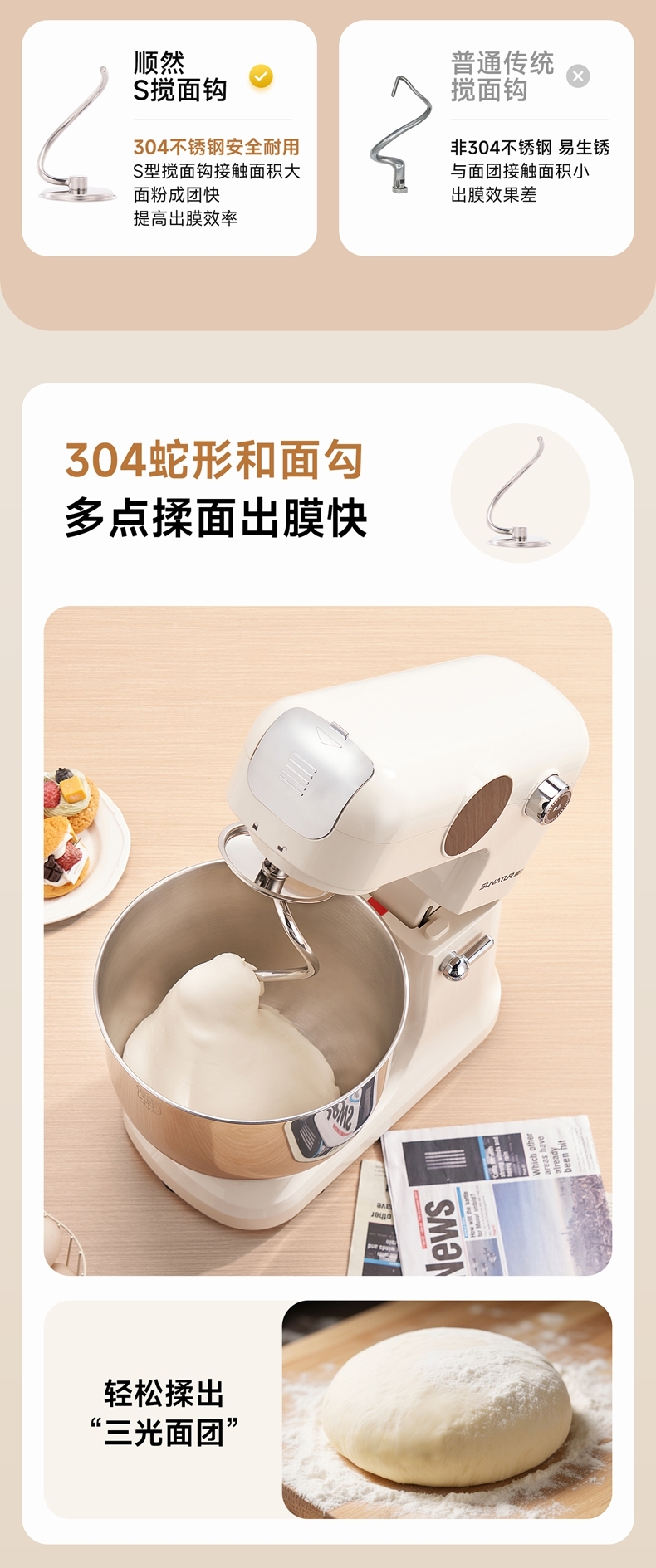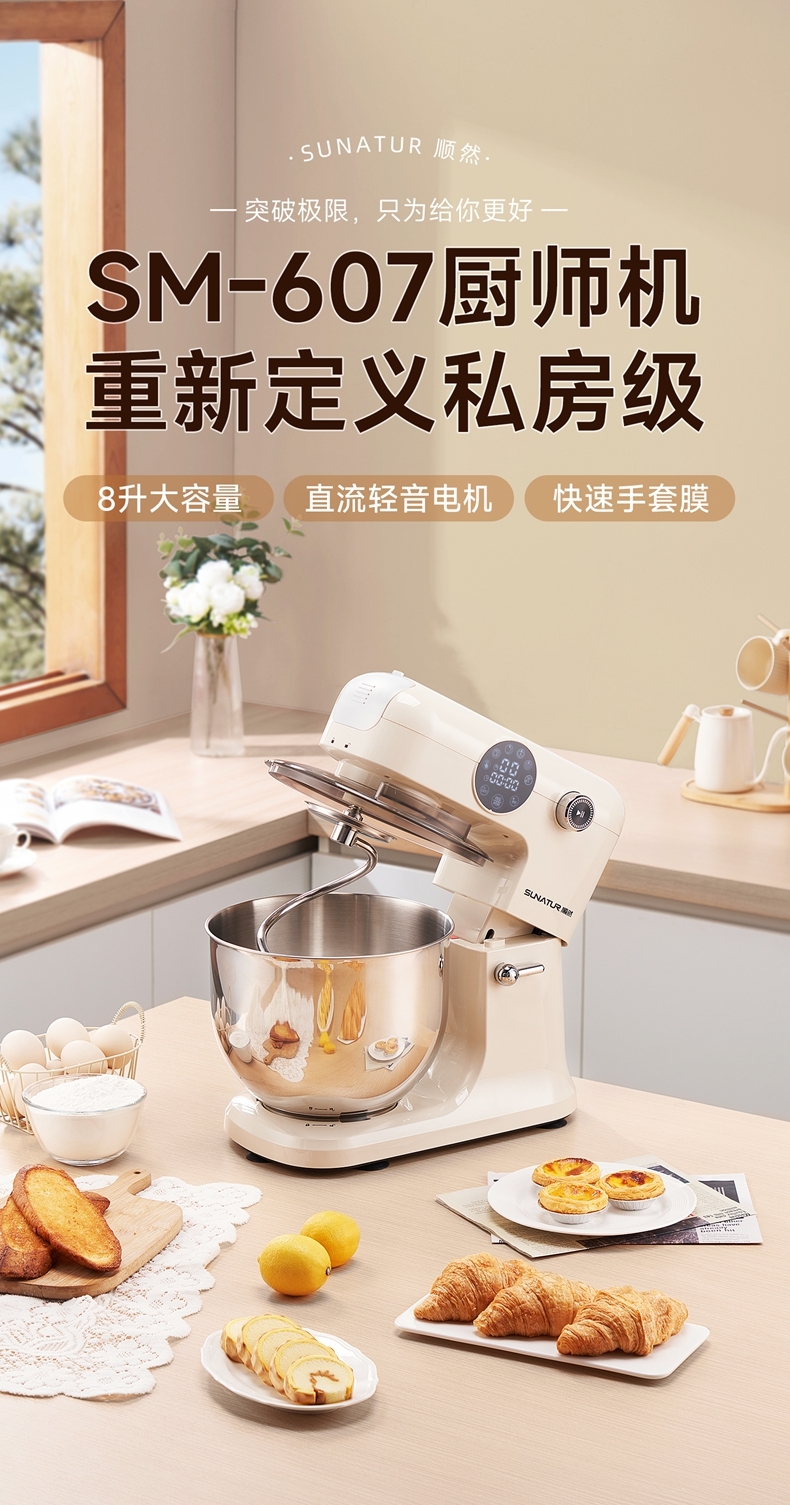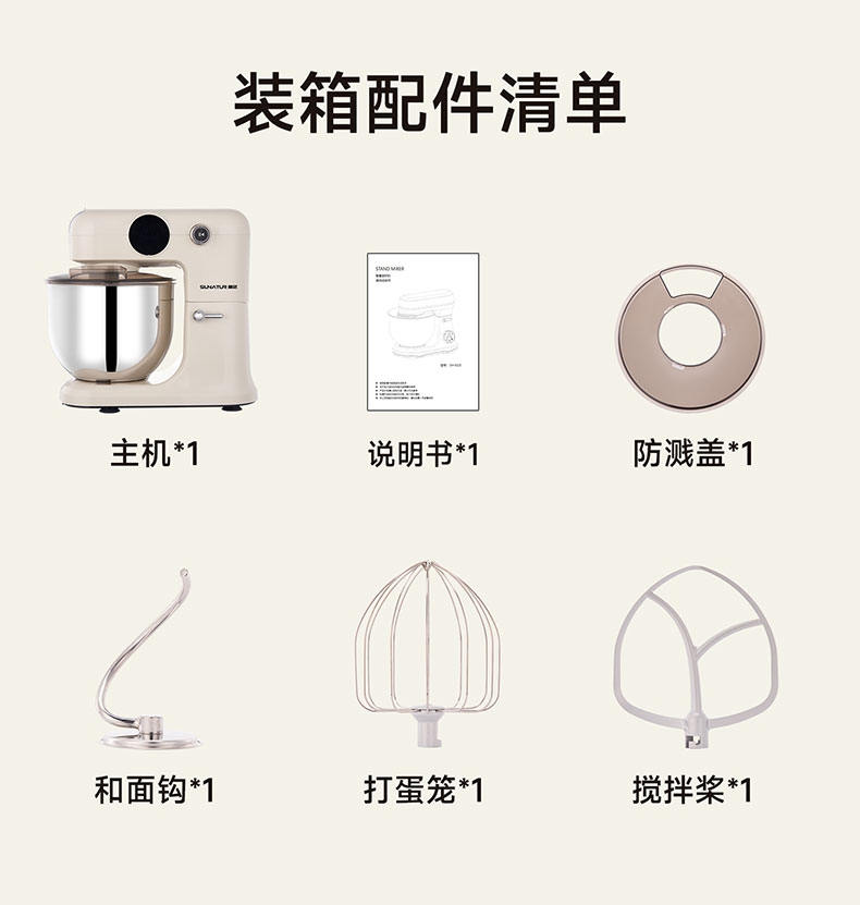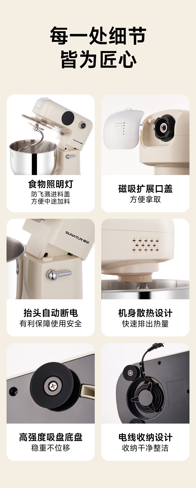 配置清单:1000w直流电机高效轻音运行,成团快,轻松出手套膜 8升家用大容量 11档精准调速,满足不同需求,30分钟定时免看管 3大预设功能,304和面钩,304打蛋笼,搅拌桨配件 金属传动齿轮,高强度高精度使用寿命长 触控屏+旋钮交叉控制 支持扩展配件,需另购;