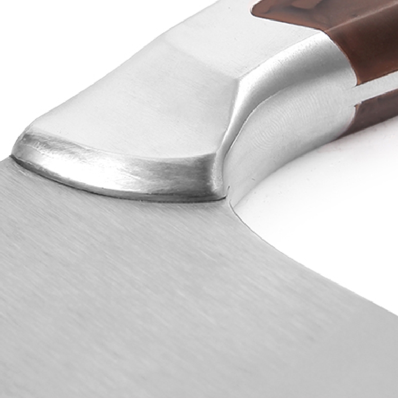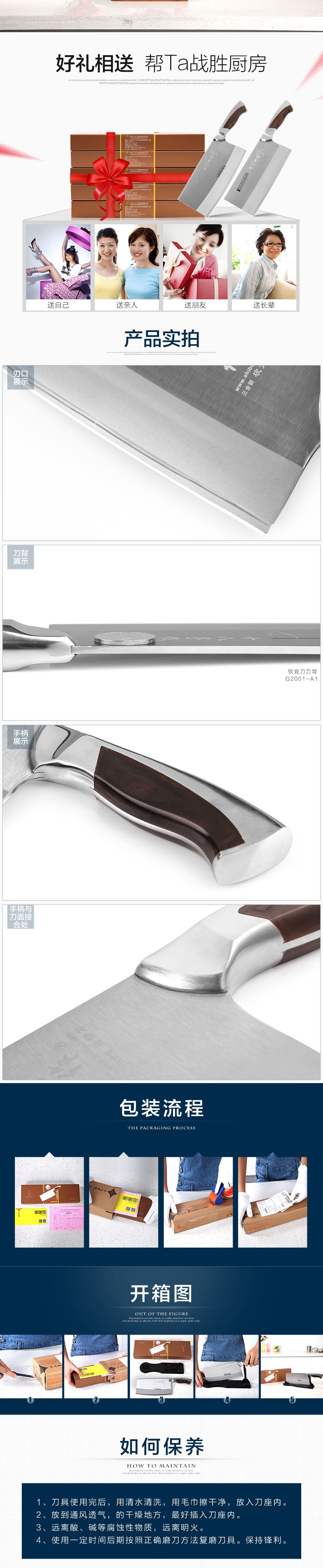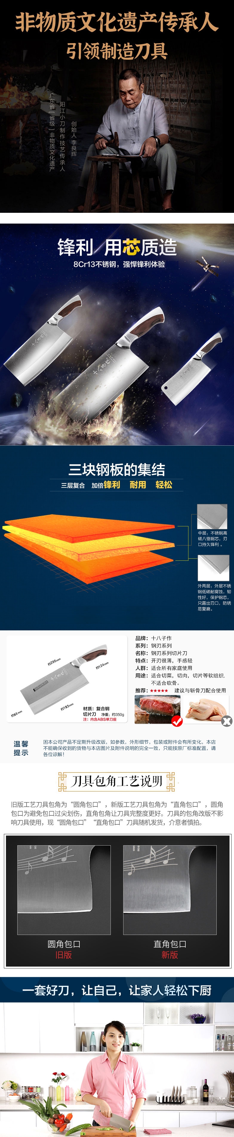 刃口偏向切片功能,适用于蔬菜、鲜肉的切片、切丝;超薄开刃,锋利升级,切割顺畅;采用三层复合不锈钢80Cr13,具有防腐蚀、易复磨
