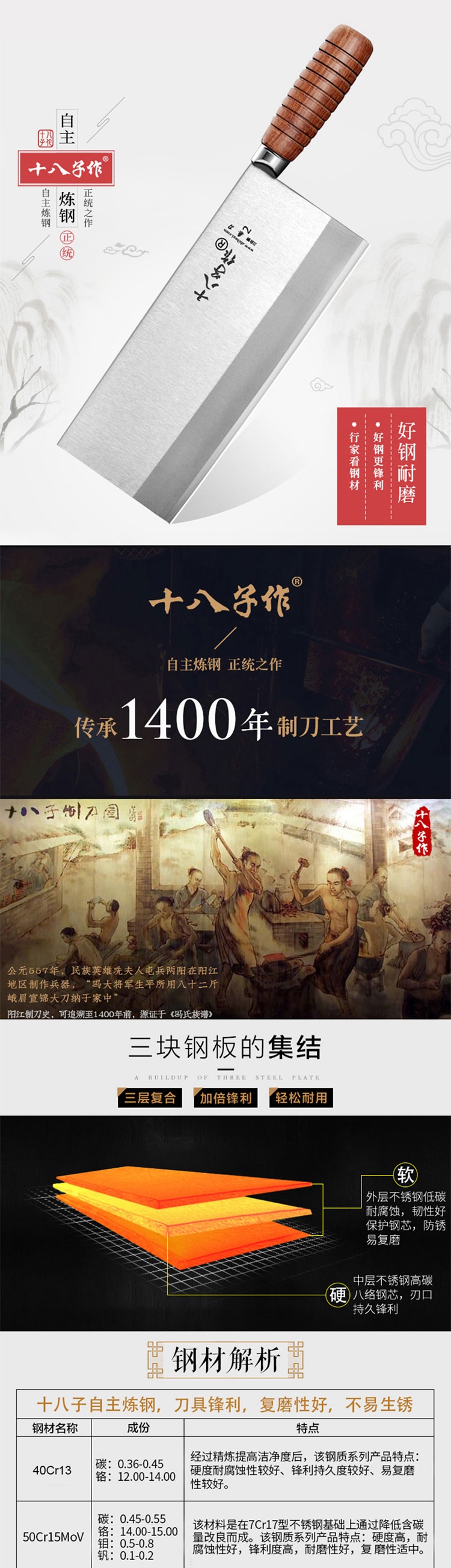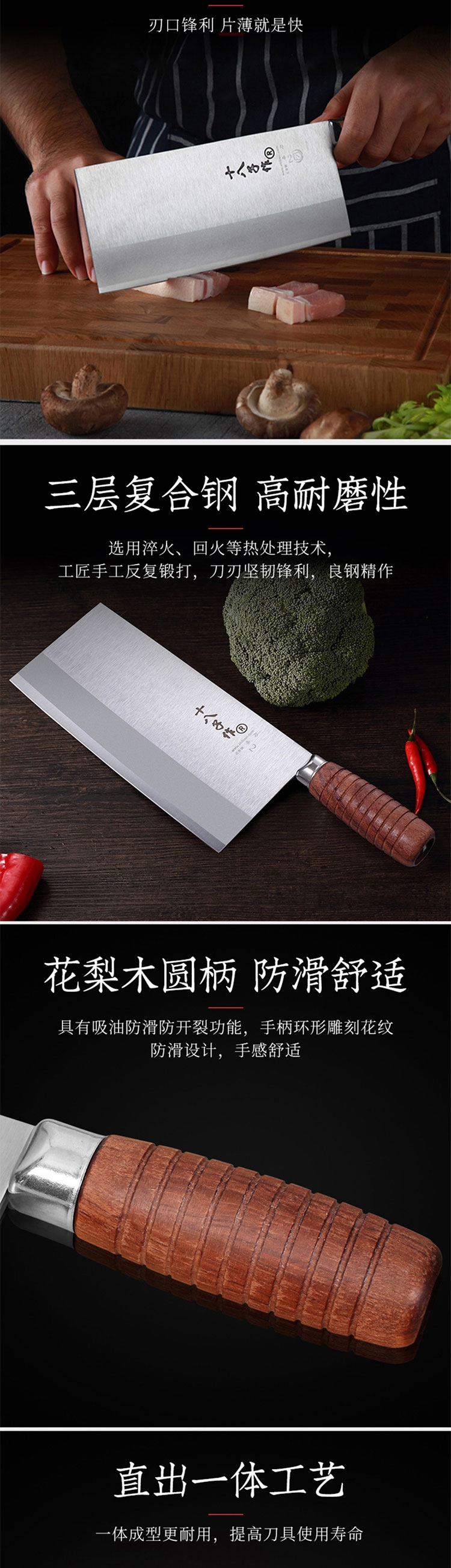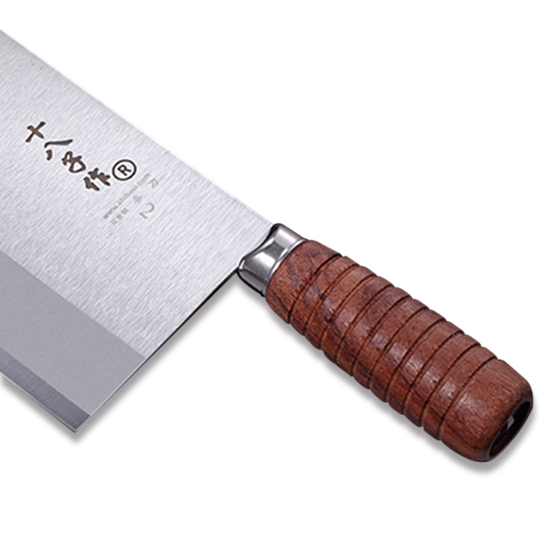 采用复合不锈钢80Cr13,具有防腐蚀、易复磨;手柄采用古朴的花梨原木加工;刃口偏向于切片功能,适用于蔬菜、鲜肉等软组织食品
