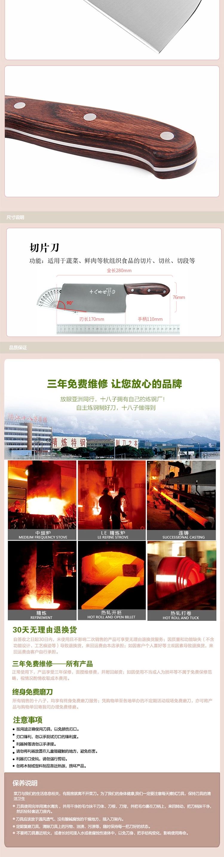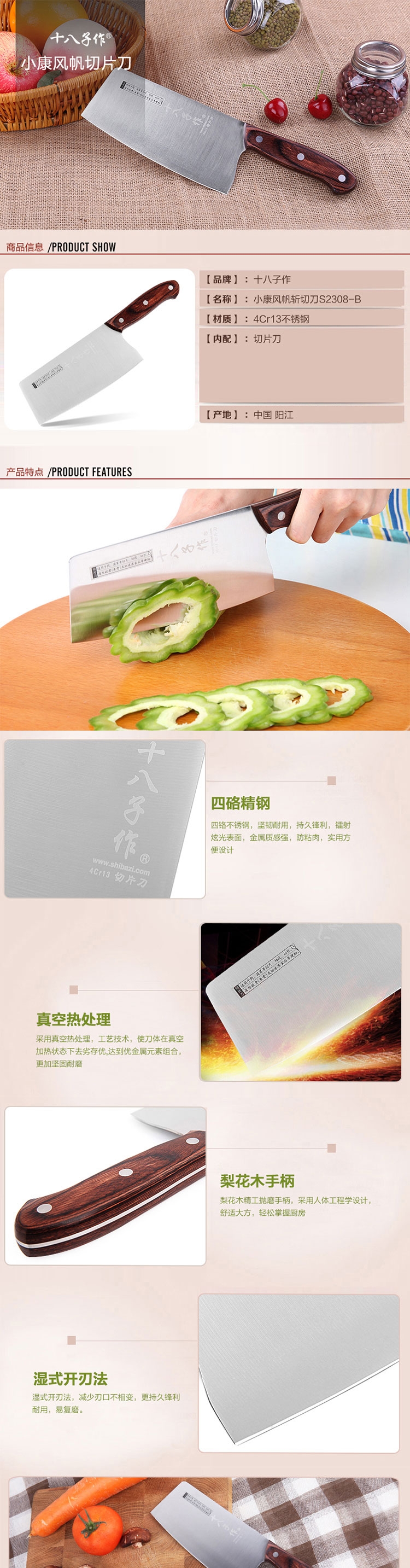 为女性度身打造的刀体,重量分布适中,长用不累;适用于蔬菜、鲜肉等软组织食品的切片、切丝、切段等;22层原木压制表面精抛光密度高不易渗水
