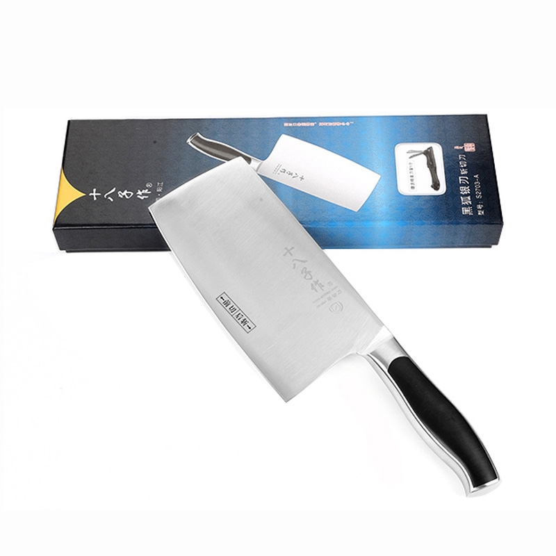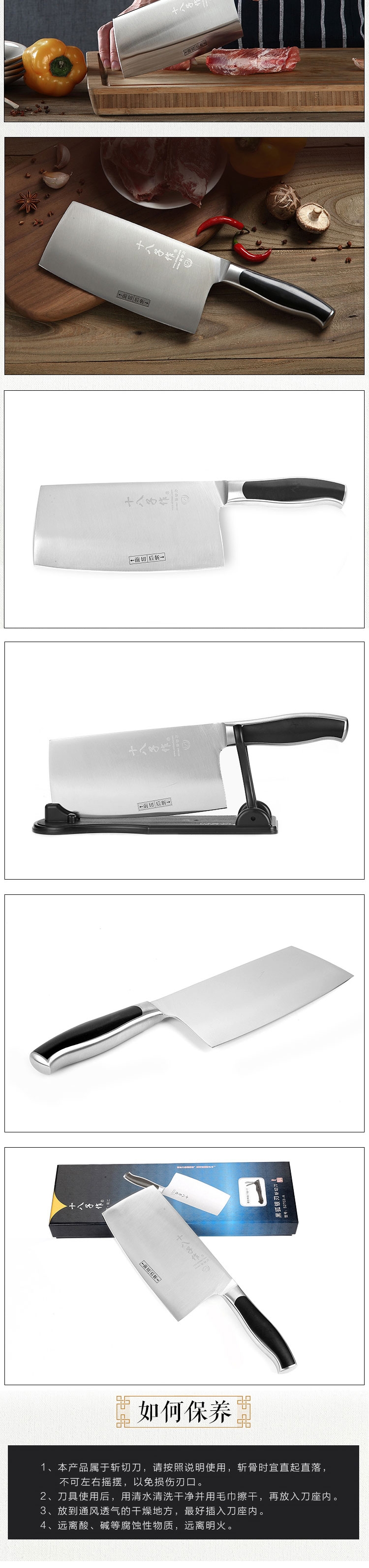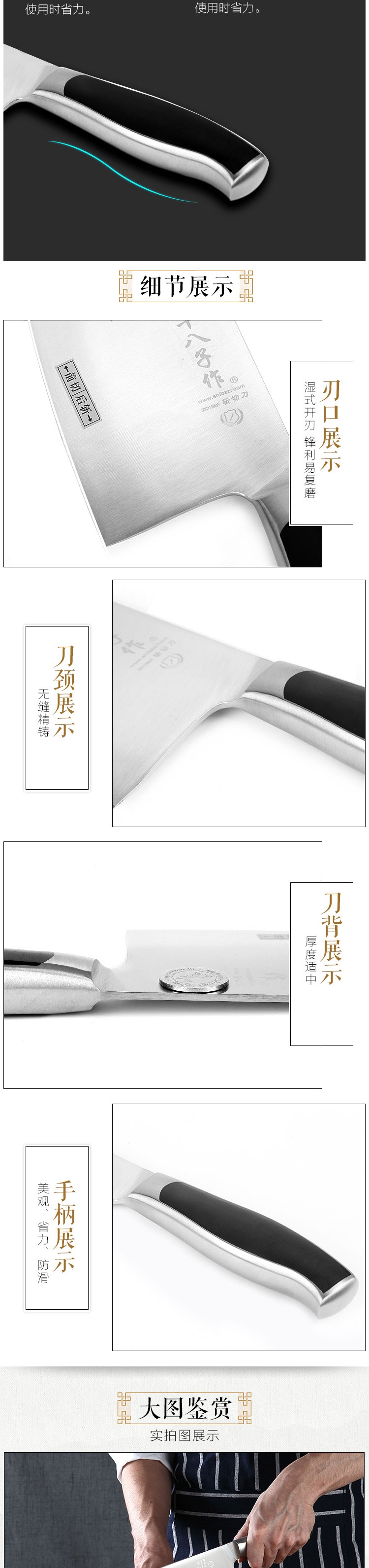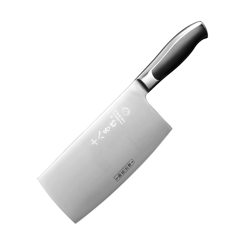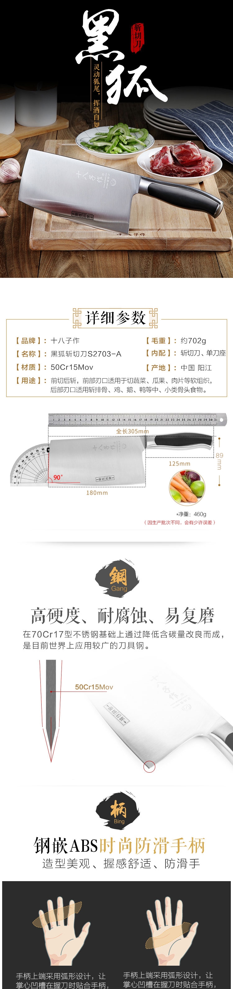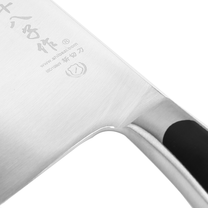 斩切刀,功能前切后斩,一刀两用;前部分刃口使用切蔬菜、瓜果、肉等软 组织;后补刃口适用斩剁排骨、鸡鸭鱼鹅等中、小类骨头实物;采用50Cr15MoV,硬度高、耐腐蚀性好;锋利度高,耐磨性好,复磨性适中。
