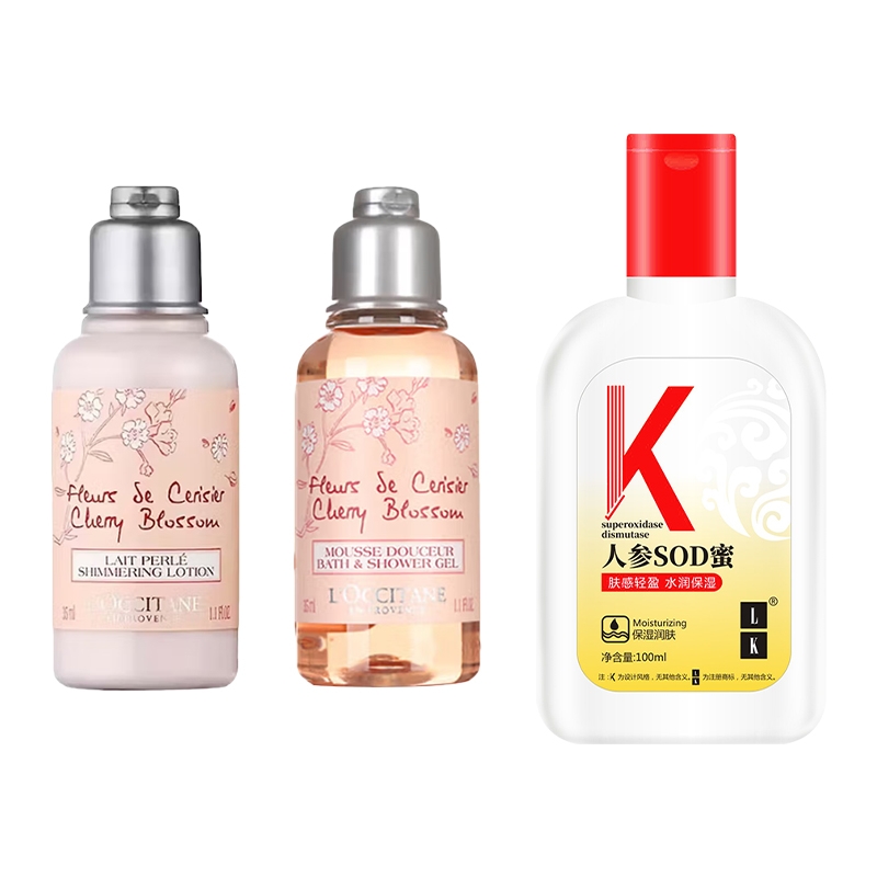 配置清单: 欧舒丹甜蜜樱花沐浴啫喱35ml 欧舒丹甜蜜樱花沐浴润肤露35ml LK 人参 SOD蜜100g LK 牛油果倍润护唇膏3.3g LK 凡士林深层滋润护手霜 80g 鸿运当头紫罗兰绿植养护卡片(赠) pu暖冬旅行包H0001(22*12*14cm)