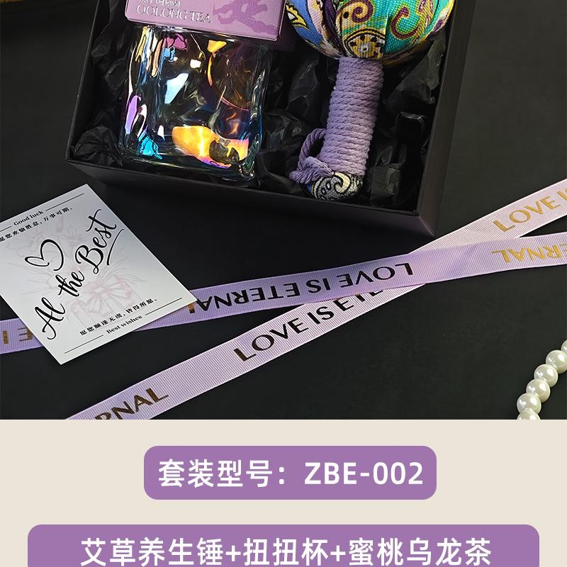 组合:扭扭玻璃杯、艾草养生锤、晚鲤蜜桃乌龙茶(3g*6袋)、紫色蝴蝶绑带礼盒+贺卡