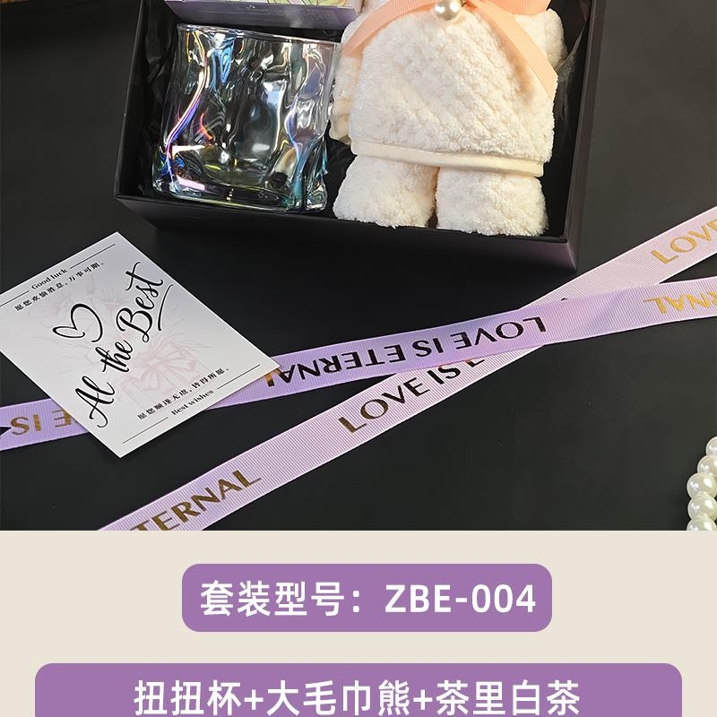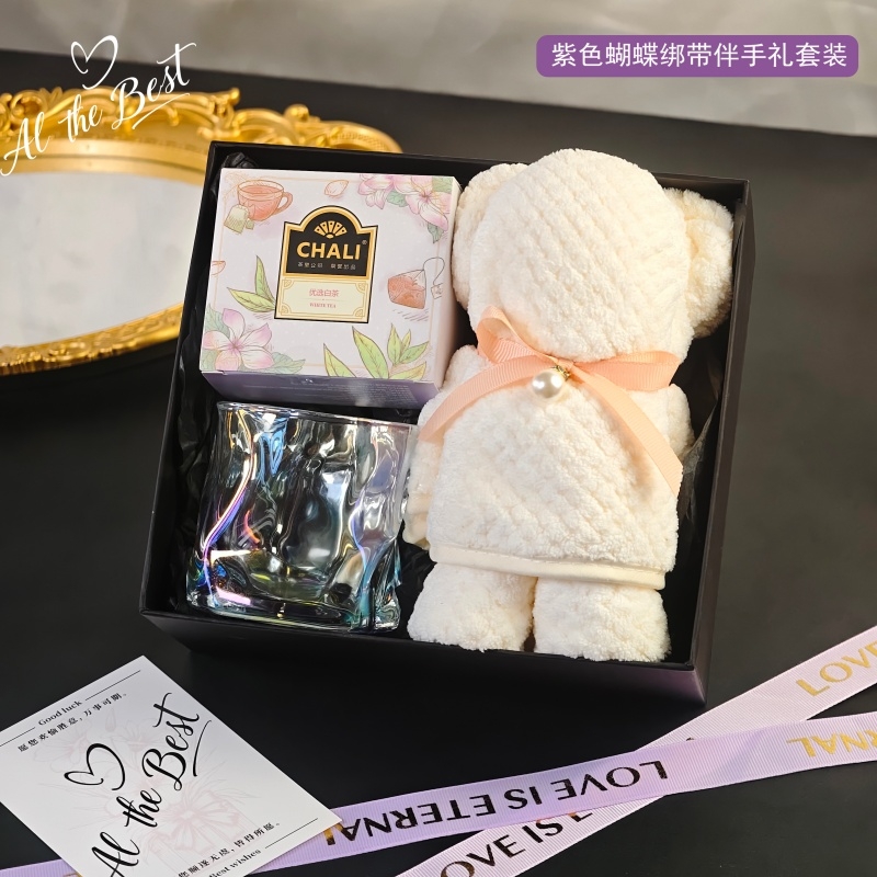 组合:扭扭玻璃杯、茶里白茶(2g*4袋)、大毛巾熊75*34cm、紫色蝴蝶绑带礼盒+贺卡