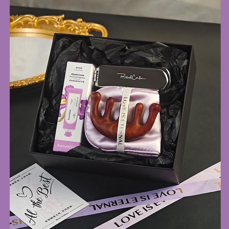 组合:镜子头梳、眼罩按摩梳、韩方莉护手霜35g、紫色蝴蝶绑带礼盒+贺卡