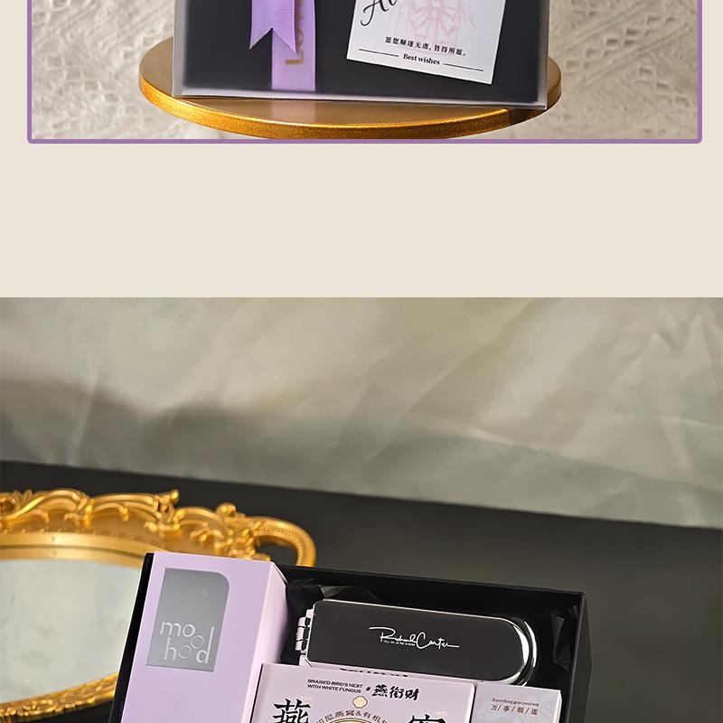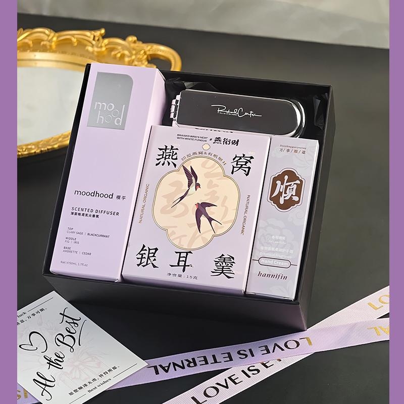 组合:镜子头梳、燕窝银耳羹15g、韩方莉护手霜35g、模乎无火香氛液50ml、紫色蝴蝶绑带礼盒+贺卡