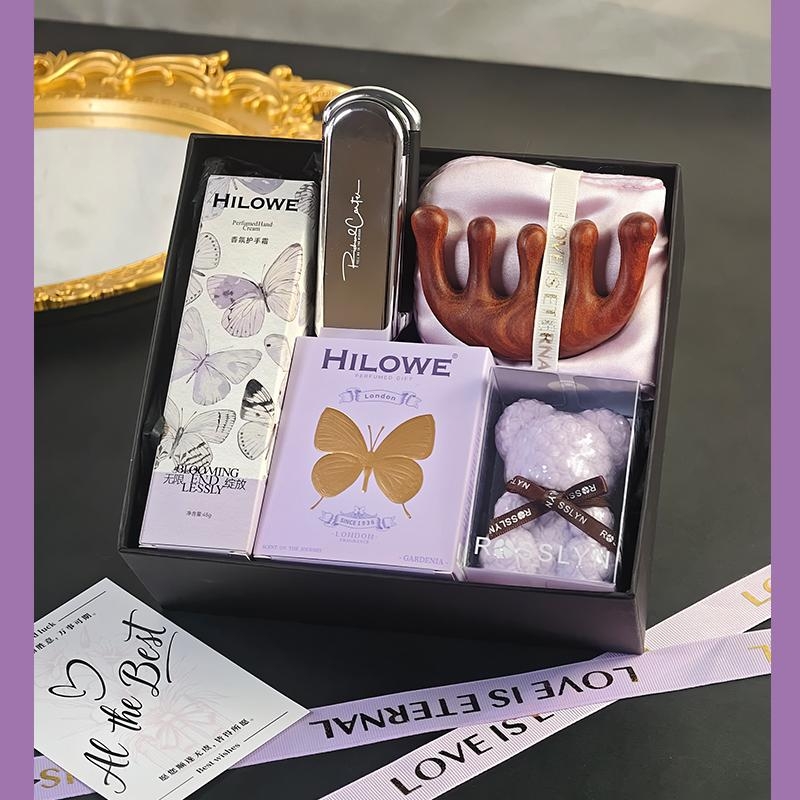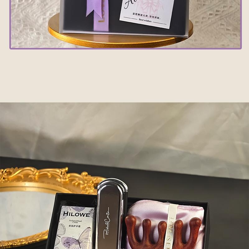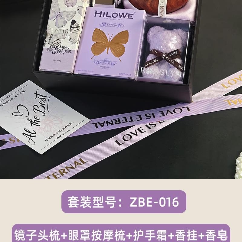 组合:镜子头梳、眼罩按摩梳、希罗韦石膏香挂、希罗韦护手霜45g 、罗斯琳小熊皂100g、紫色蝴蝶绑带礼盒+贺卡