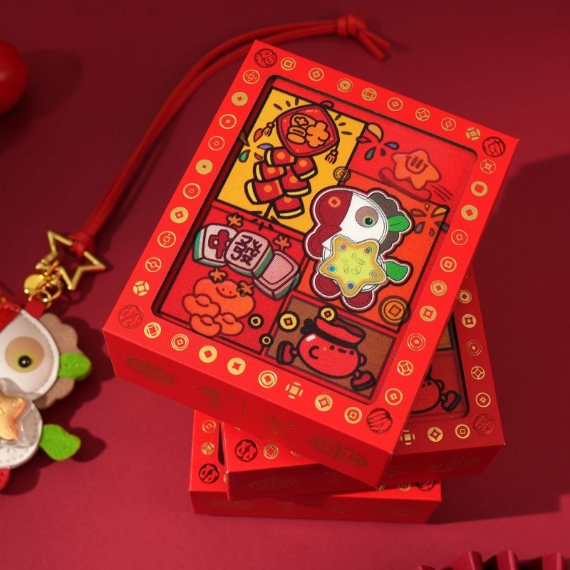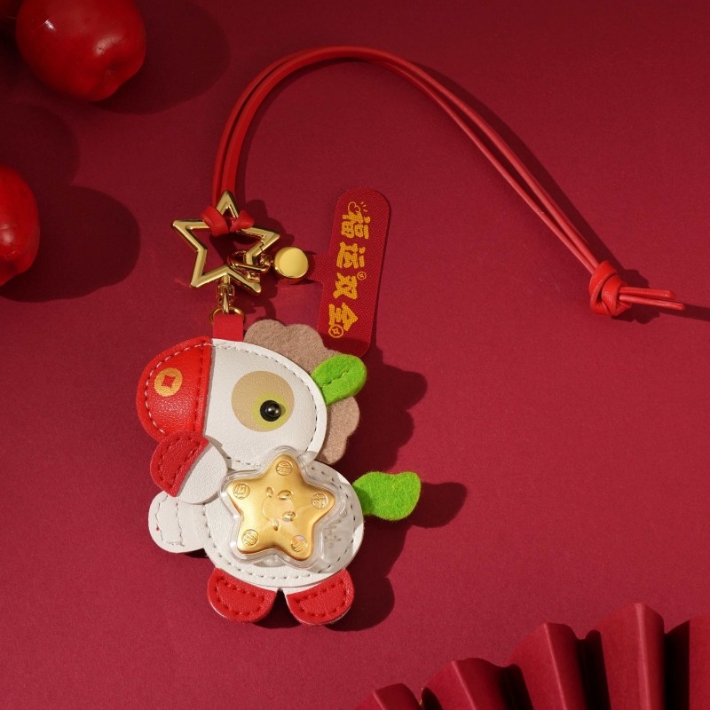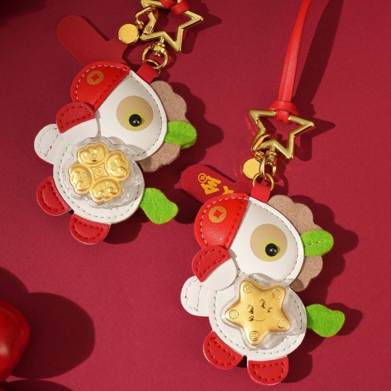 「赚元马」金挂件携祥瑞而来!以萌趣马驹为型;身披红白福纹,点缀璀璨金饰,绿翼跃动生机;胸前金色幸运花与四叶草闪耀,寓意财运与福气双丰收!;搭配传统喜庆礼盒,烫金“發”字与吉祥图案交织;佳节赠友,还是随身挂饰,都能将福运牢牢“赚”在手中
