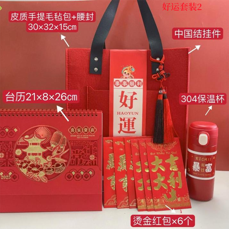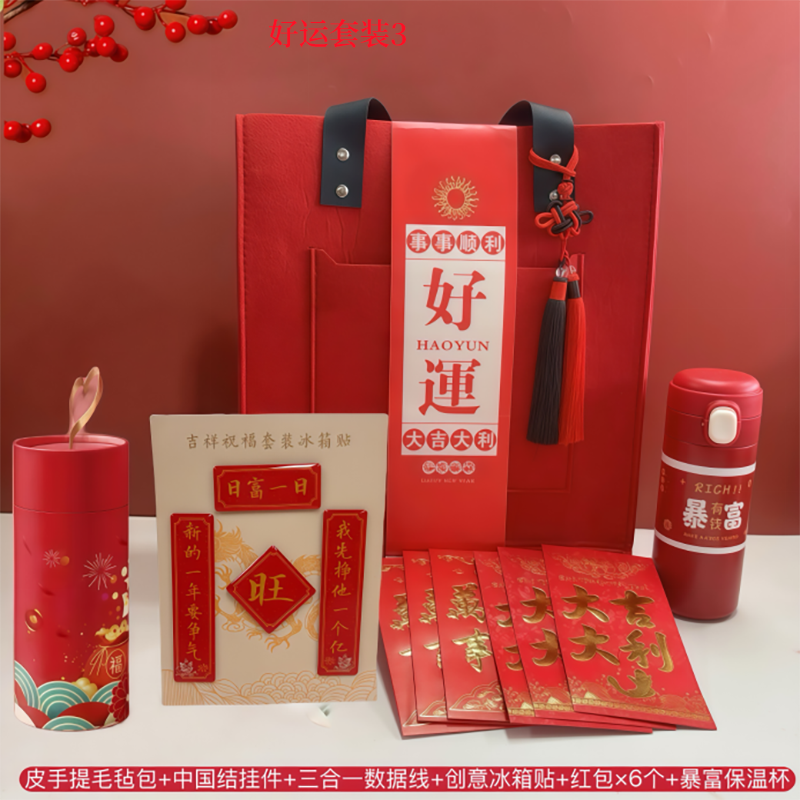 好运套装3:皮手提毛毡包 三合一数据线 创意冰箱贴 烫金红包×6个 真空保温杯