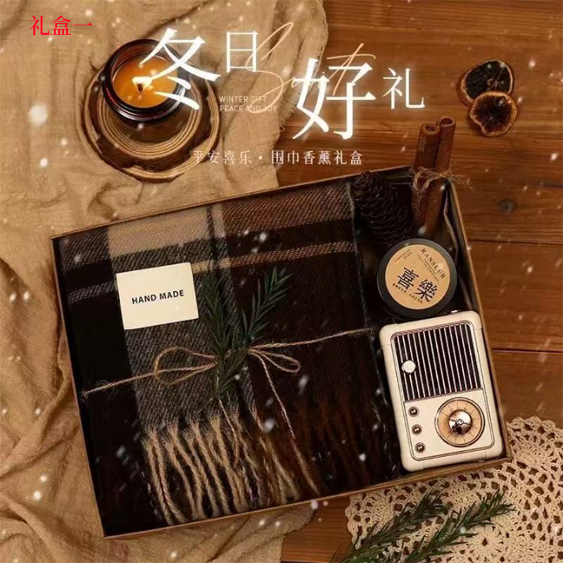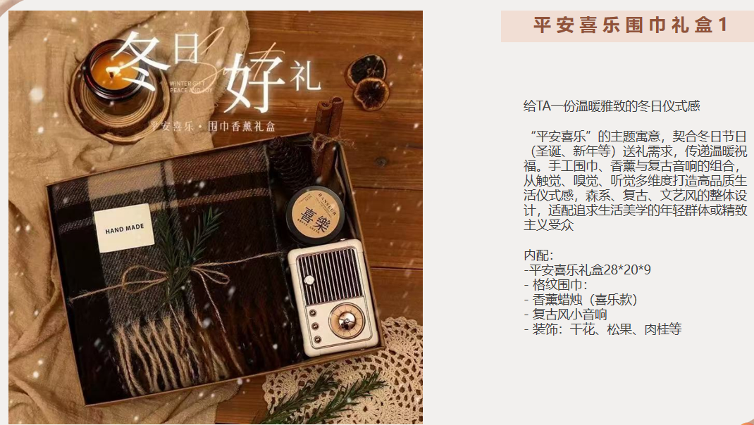礼盒1配置:平安喜乐礼盒28*20*9 - 格纹围巾: - 香薰蜡烛(喜乐款) - 复古风小音响 - 装饰:干花、松果、肉桂等