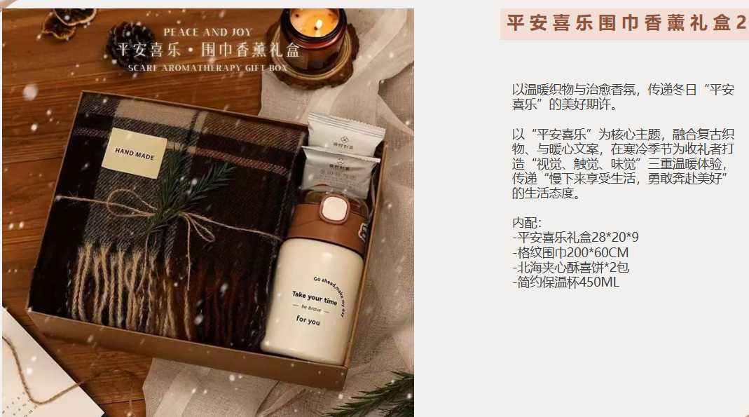 礼盒2配置:平安喜乐礼盒28*20*9 -格纹围巾200*60CM -北海夹心酥喜饼*2包 -简约保温杯450ML