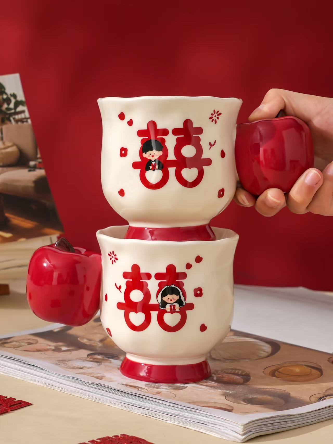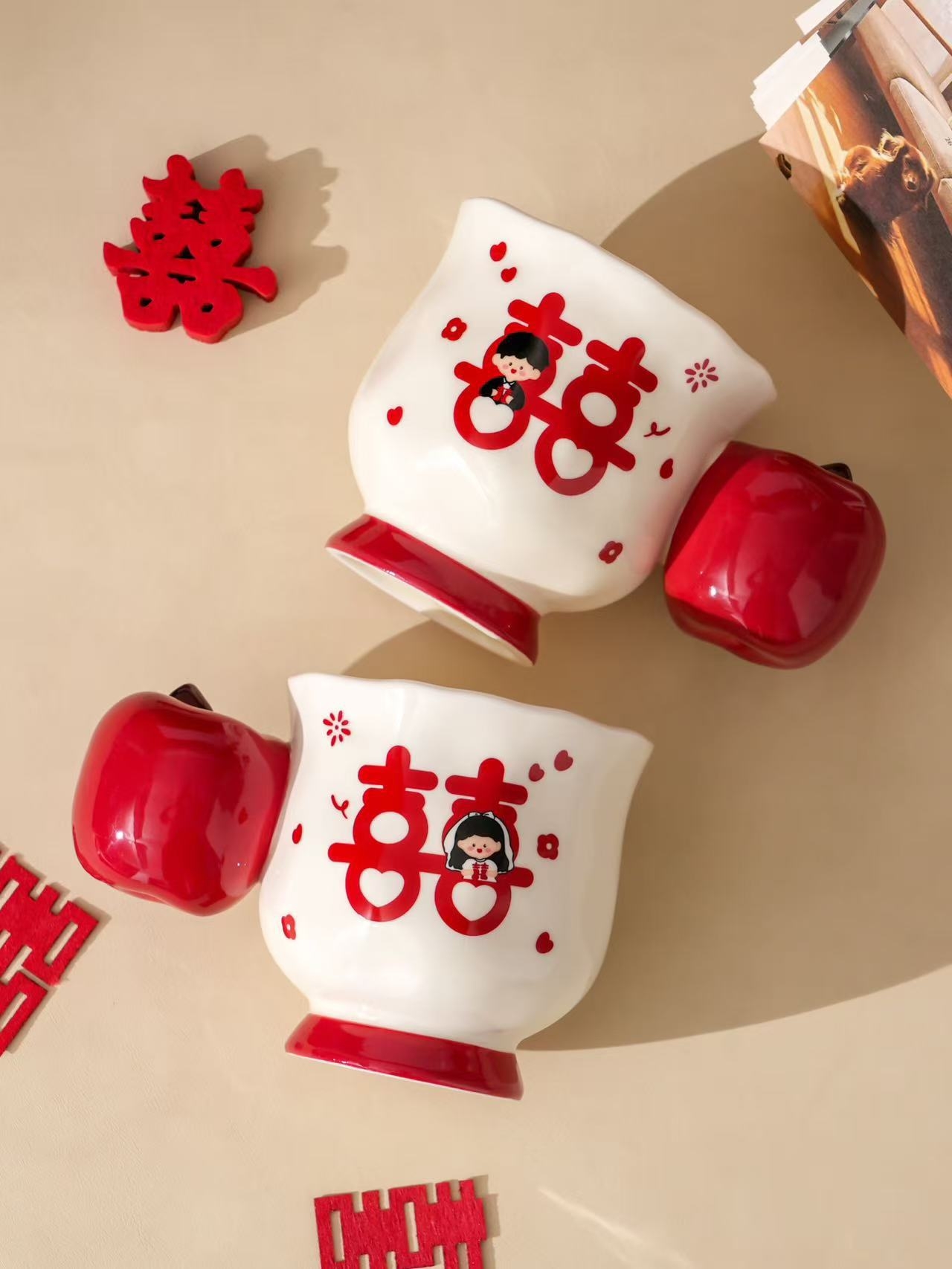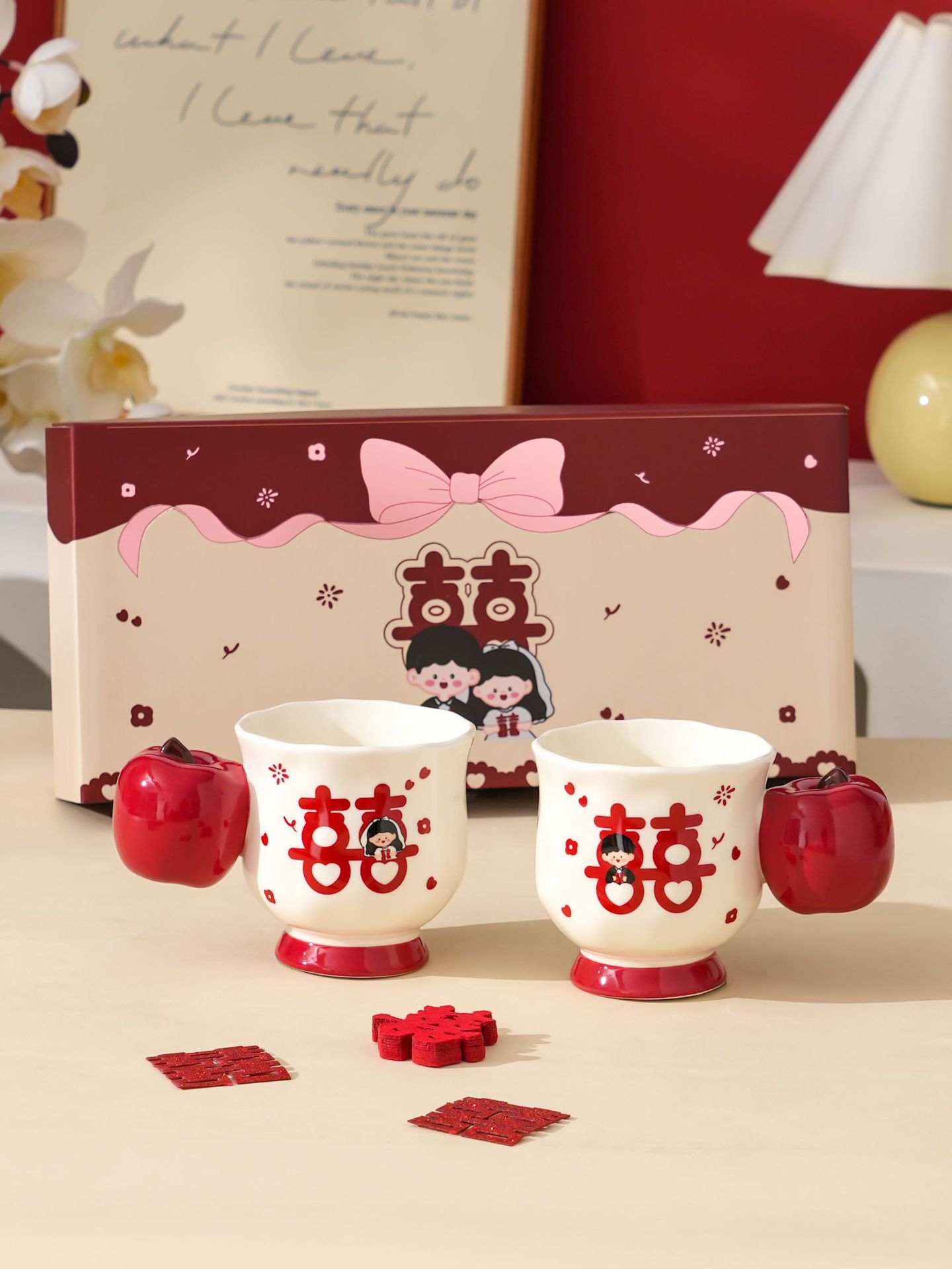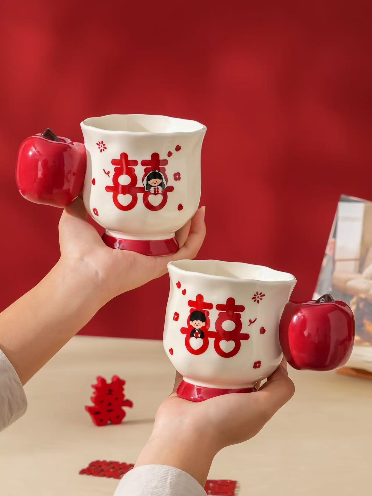 喜结连理喜事对杯;苹果手柄,寓意平安喜乐;单杯,对杯礼盒套装