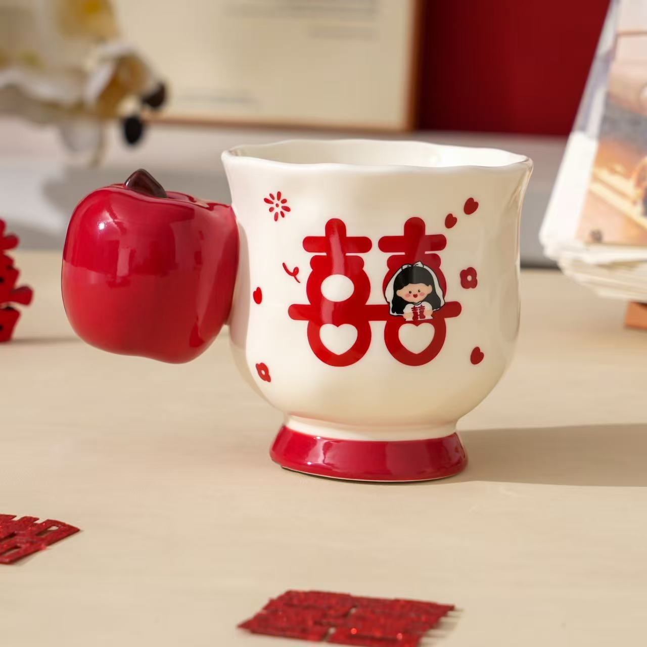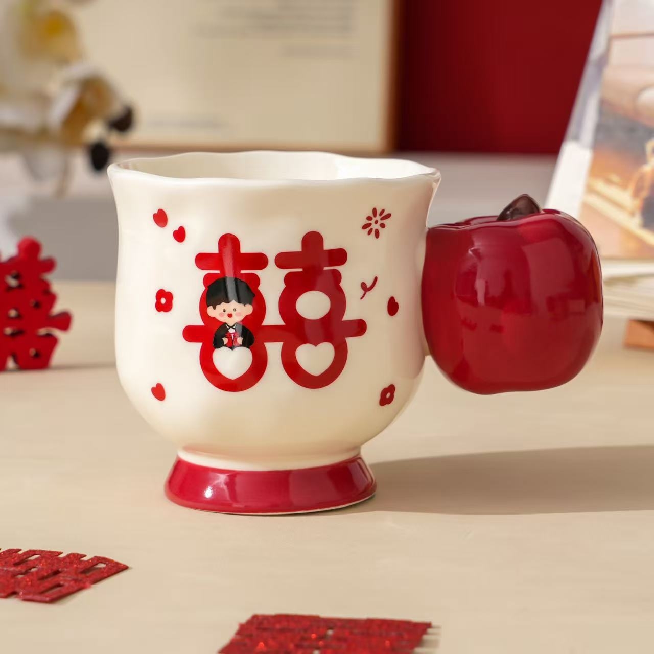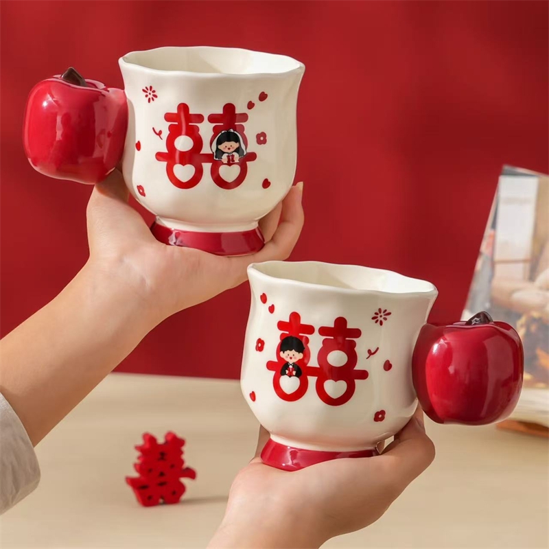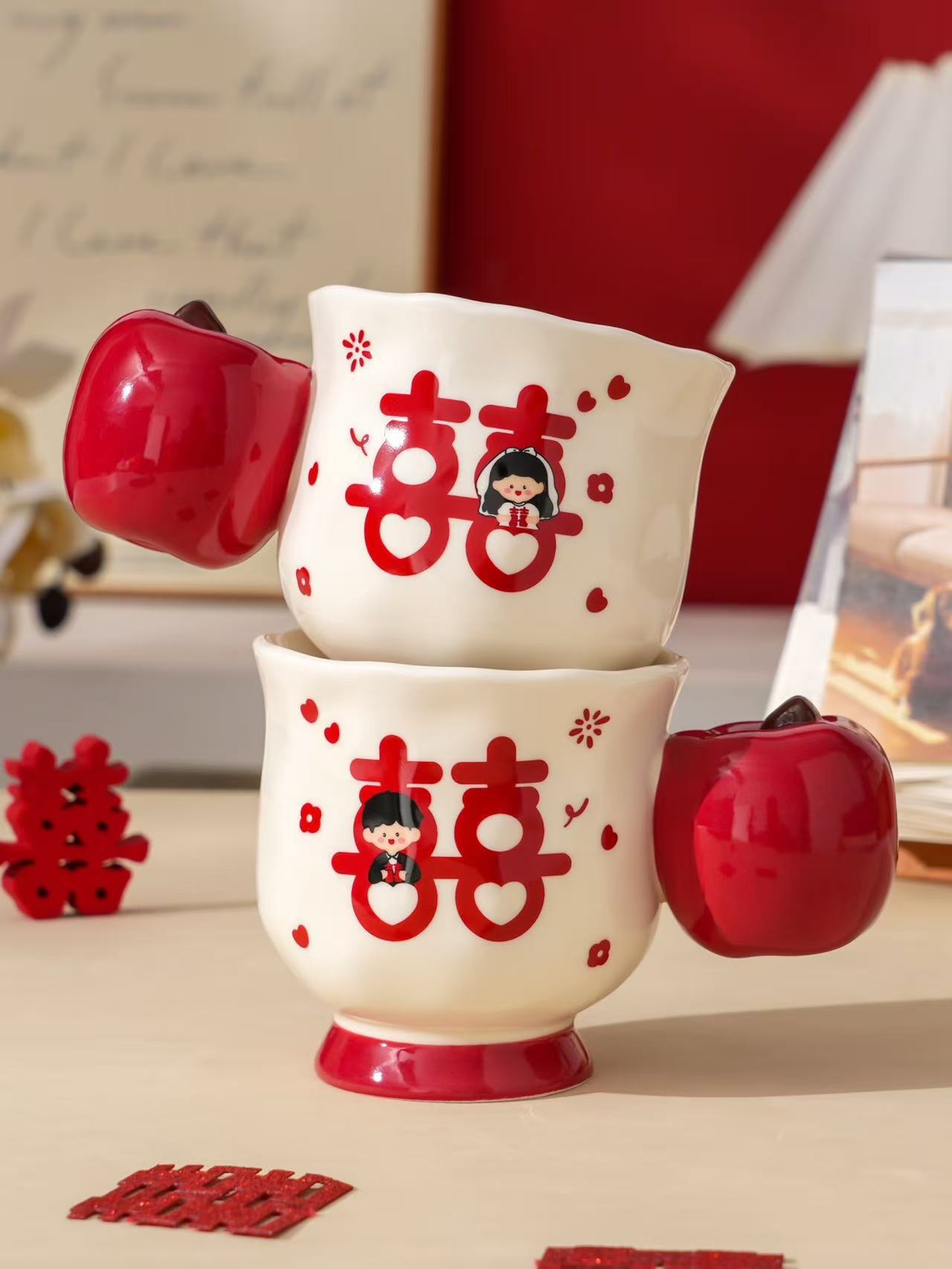 喜结连理喜事对杯;苹果手柄,寓意平安喜乐;单杯,对杯礼盒套装