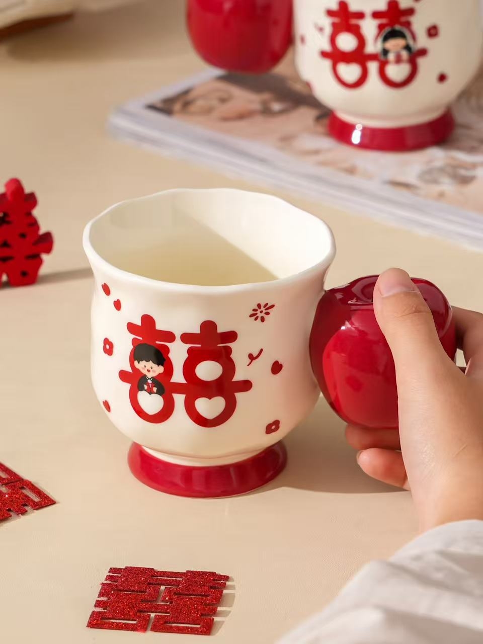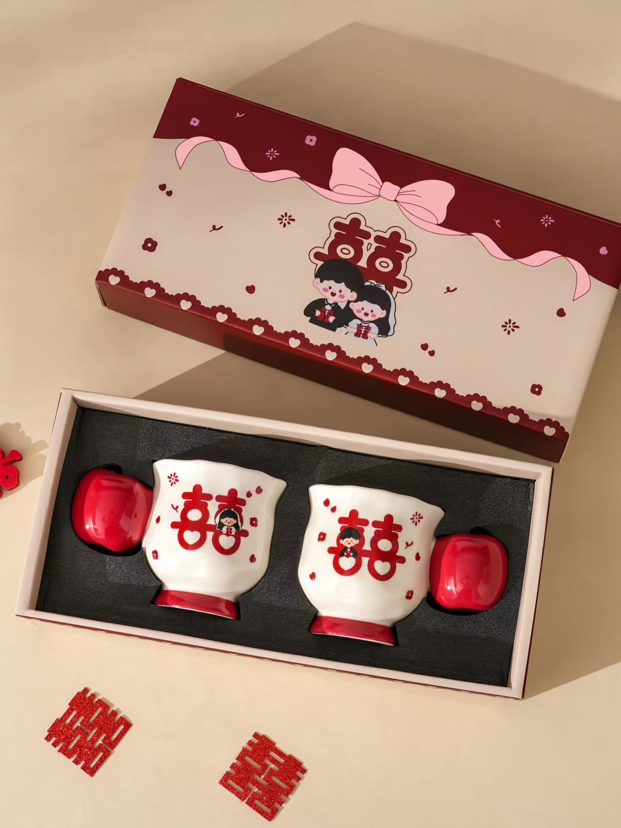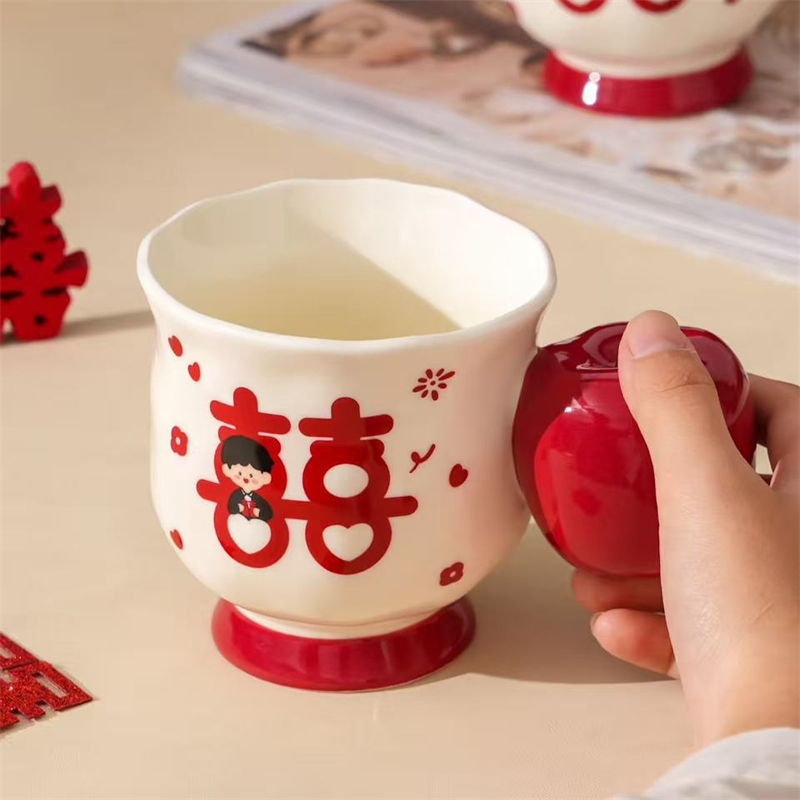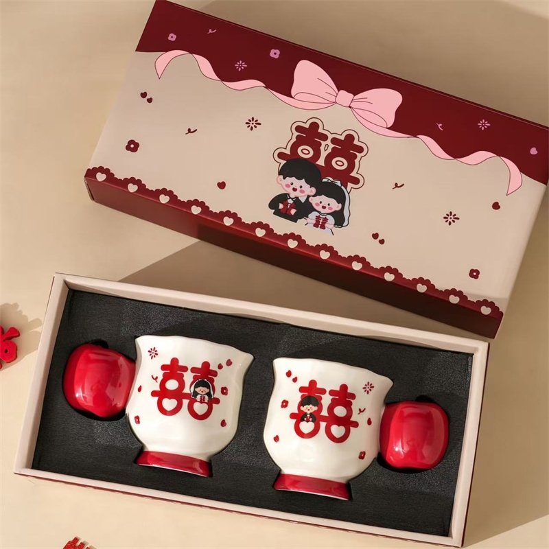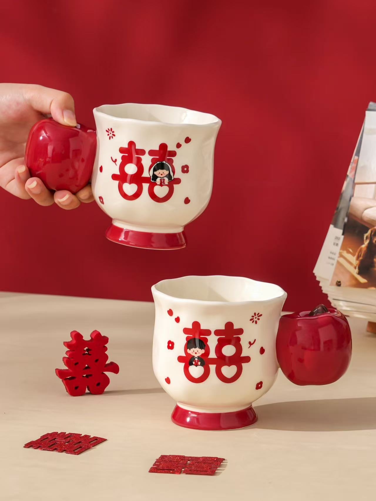 喜结连理喜事对杯;苹果手柄,寓意平安喜乐;单杯,对杯礼盒套装