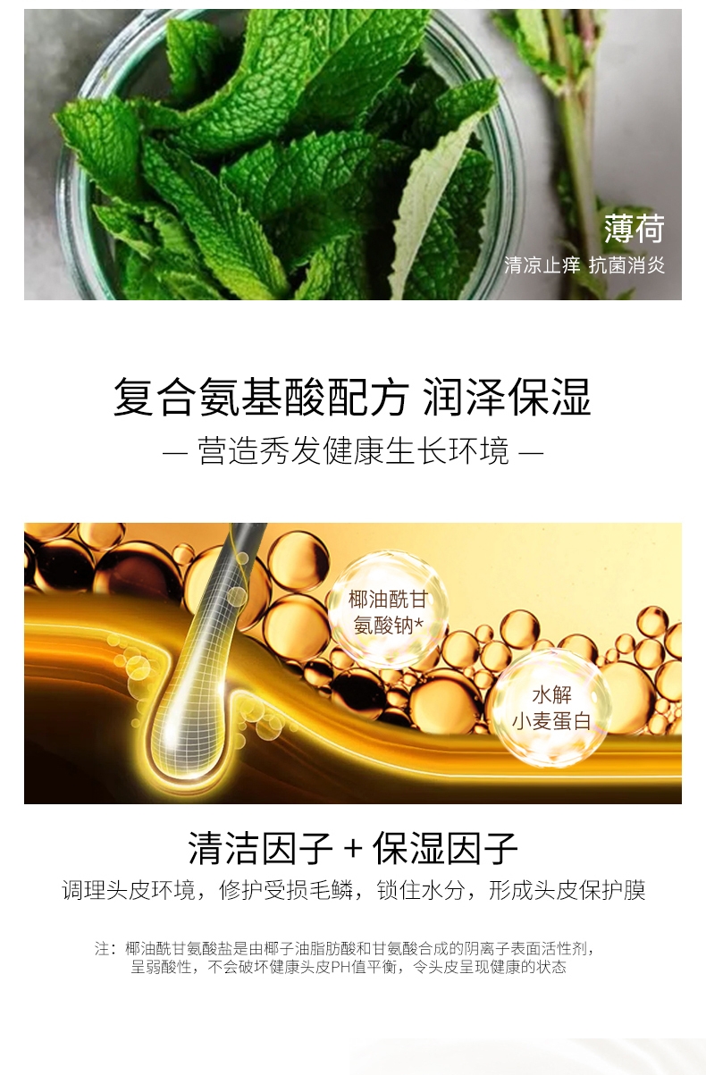 中药护发,甄选生姜、无患子、黄芩、薄荷4味植物精华;复合氨基酸配方,润泽保湿,营造秀发健康生长环境;减少头皮油脂,改善油头