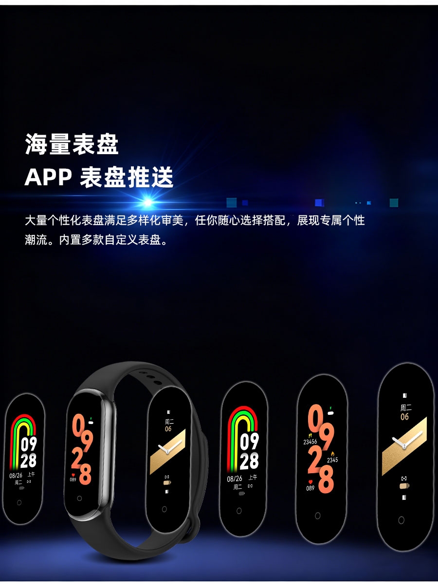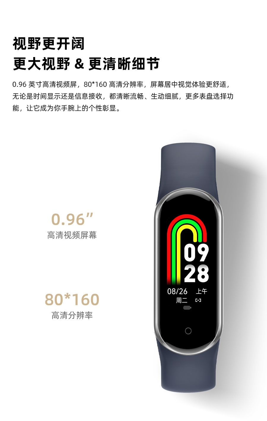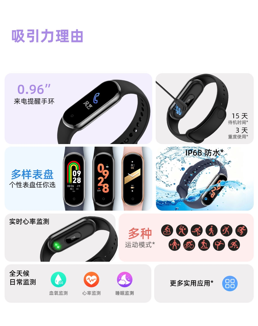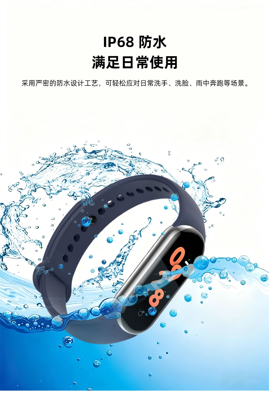 0.95inch高清大屏、80*160分辨率;心率、血压,睡眠监测、多种运动模式;计步器、闹铃、信息提醒、来电提醒、IP68防水