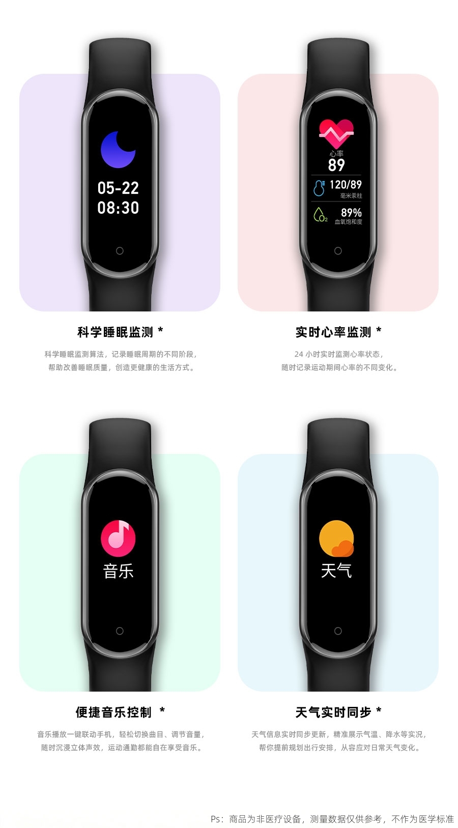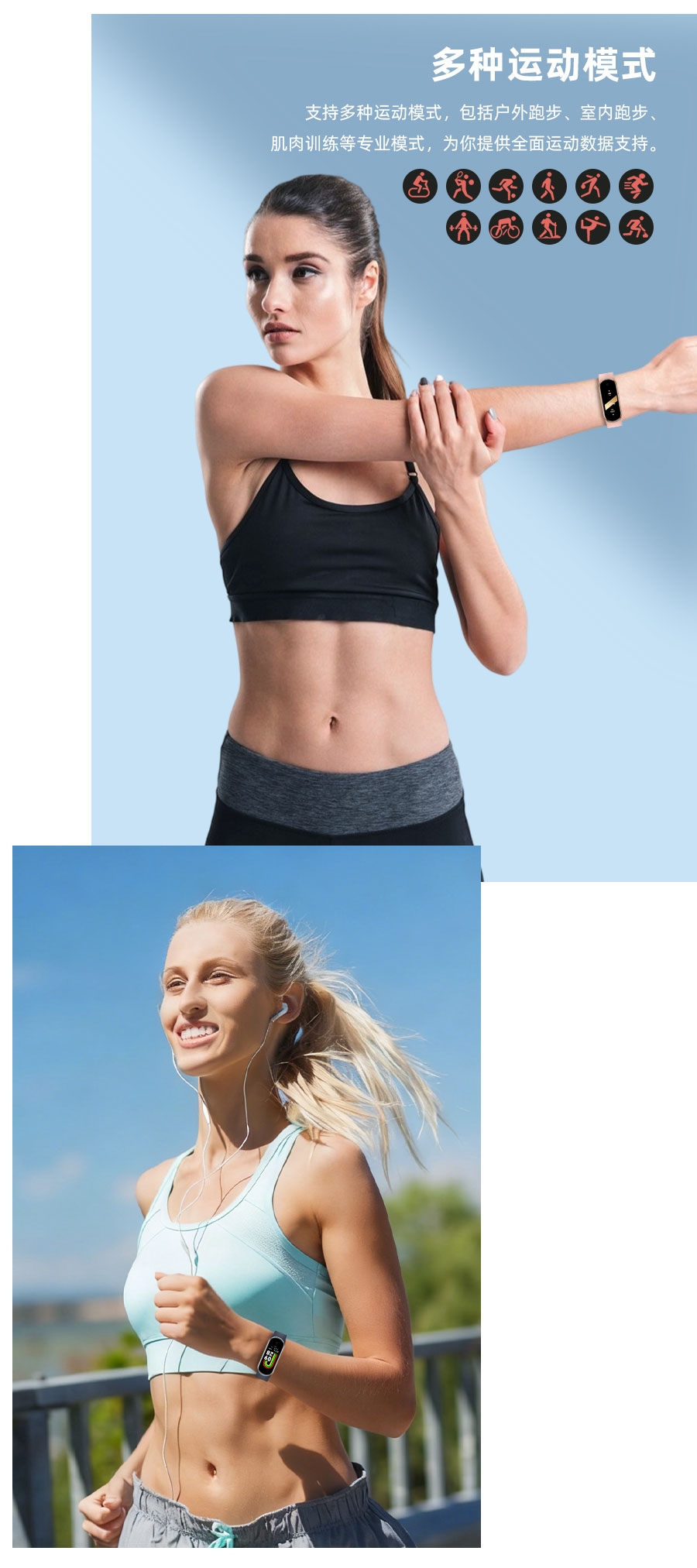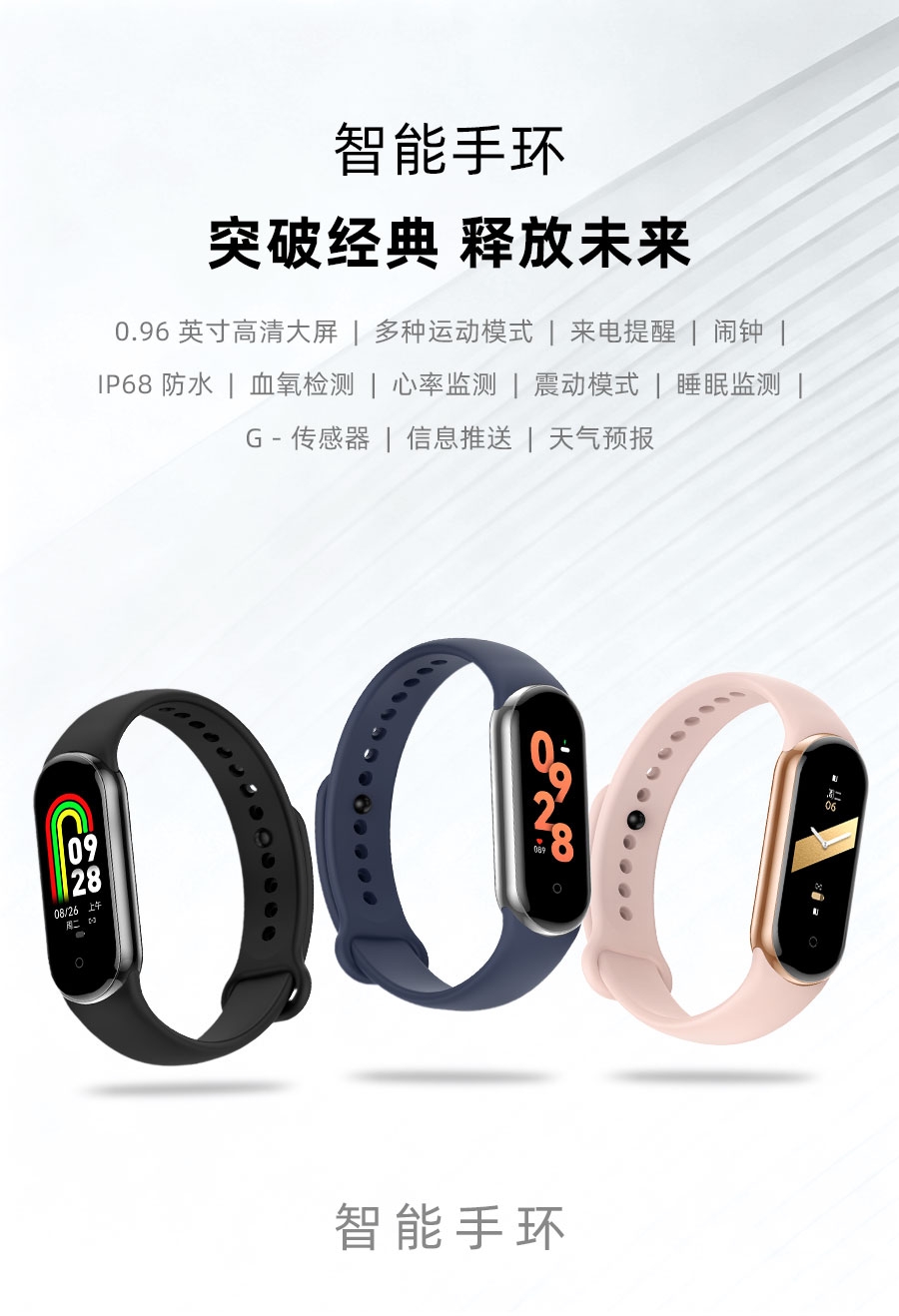 0.95inch高清大屏、80*160分辨率;心率、血压,睡眠监测、多种运动模式;计步器、闹铃、信息提醒、来电提醒、IP68防水