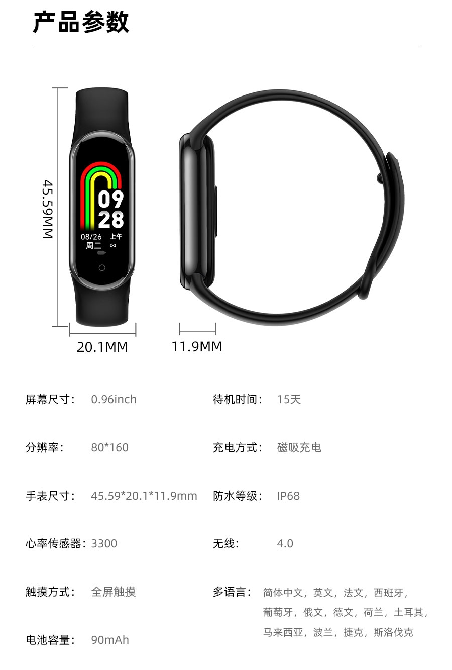心率传感器:3301 屏幕尺寸:0.96寸 80*160分辨率