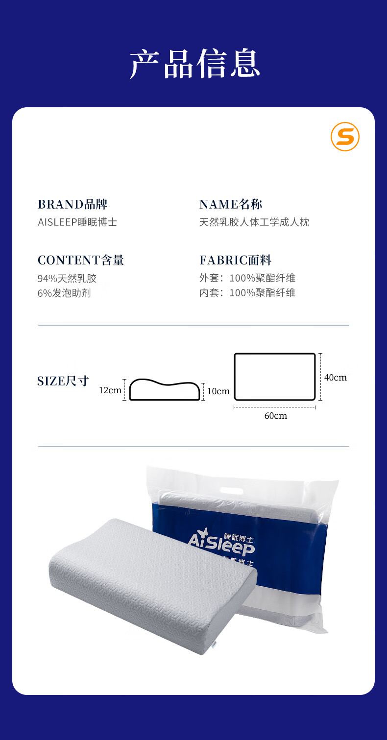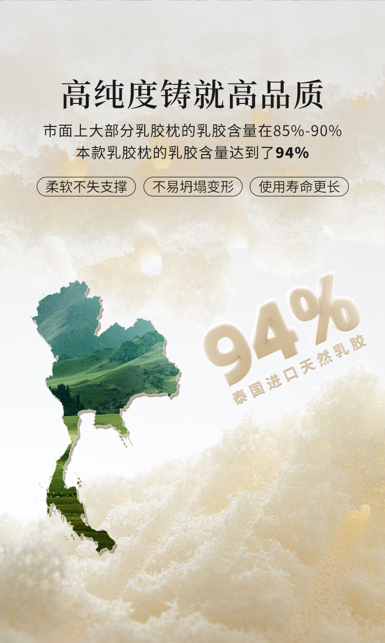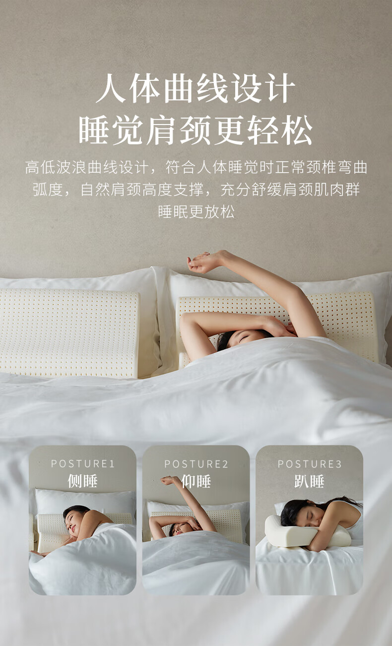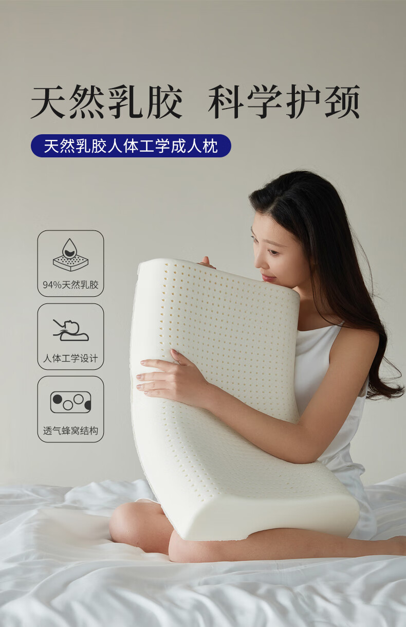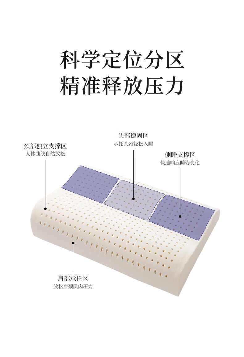 该枕头是由乳胶制成的,有良好的支撑性和舒适性。;高度适中,适合失眠人群;柔软不失支撑,不易坍塌变形