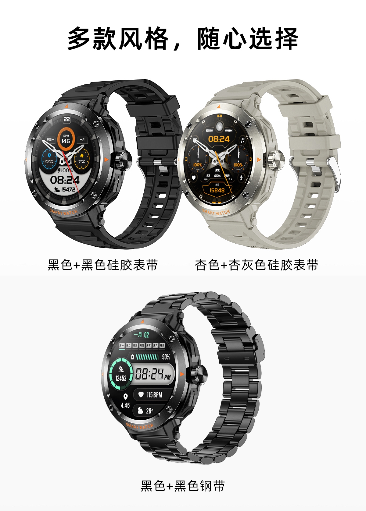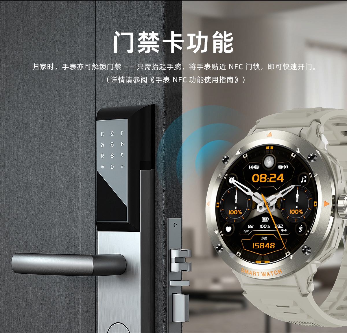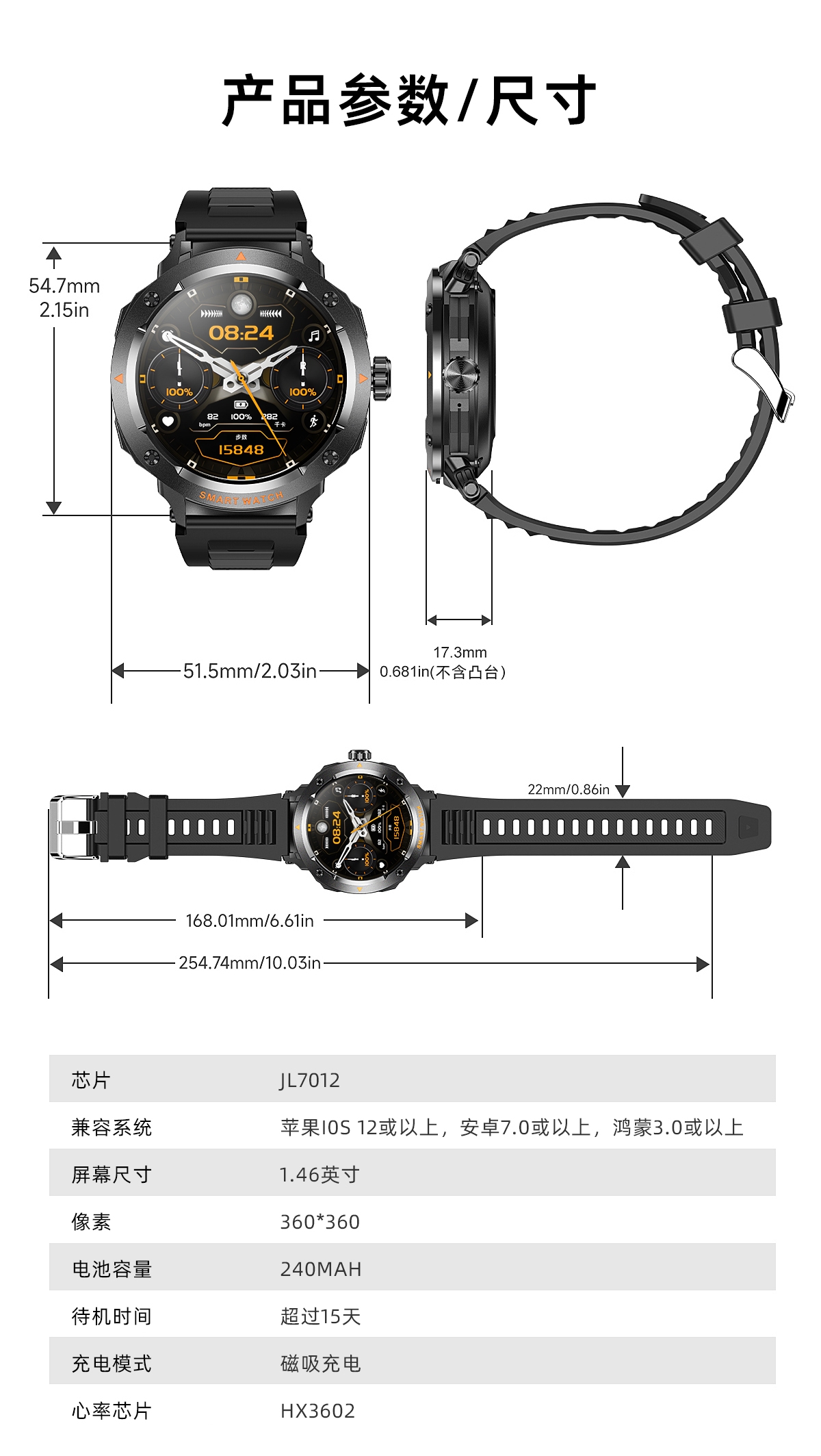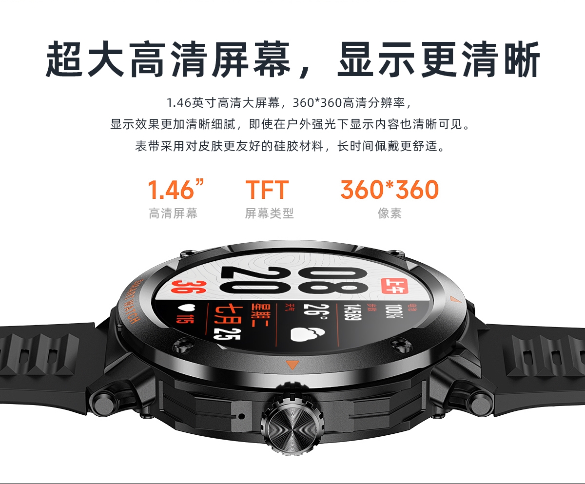 1.46TFT、360*360、充电仓240mAh;NFC、APP个性自定义表盘、手表6种UI界面切换;蓝牙拨号通话、健康监测