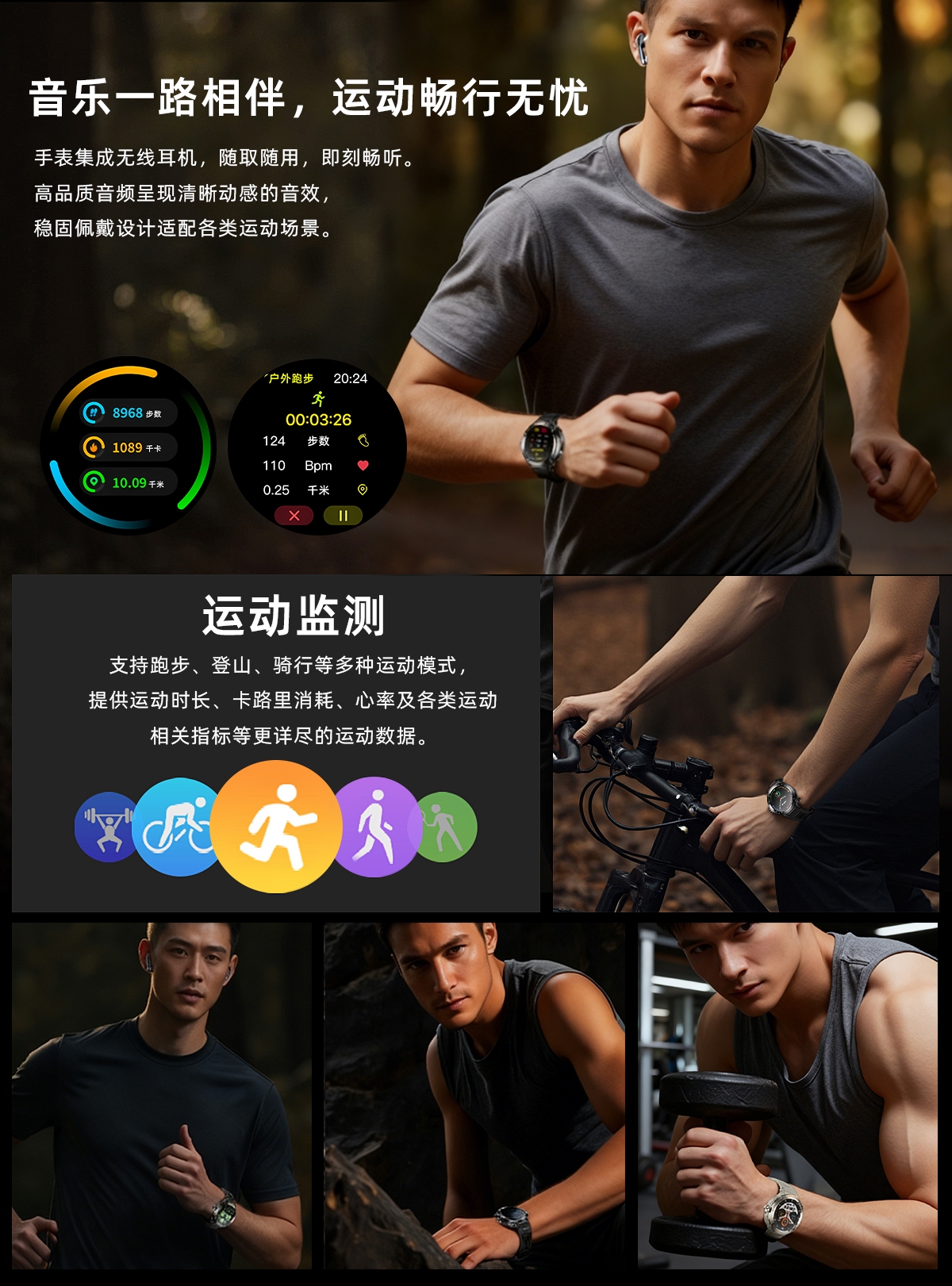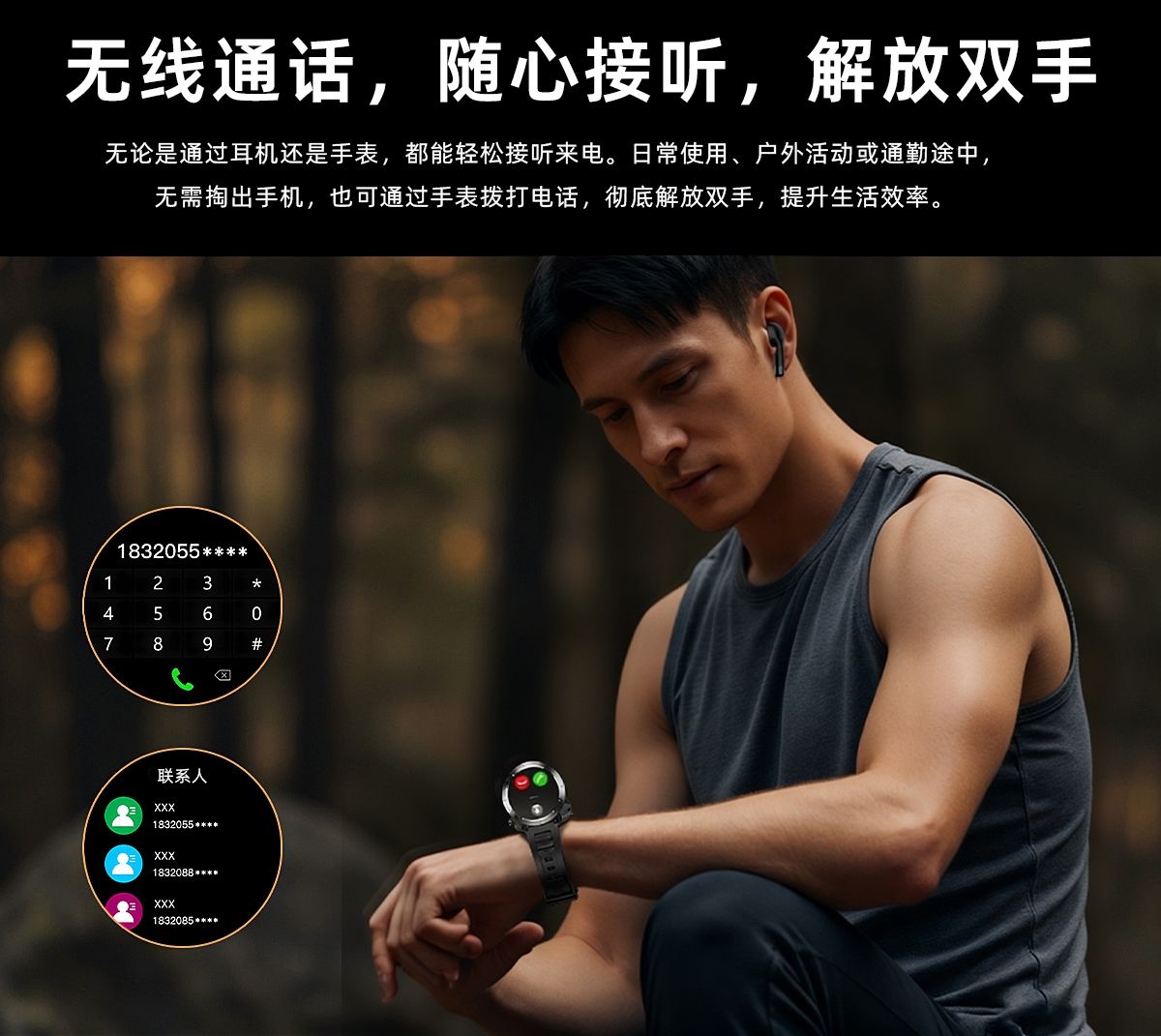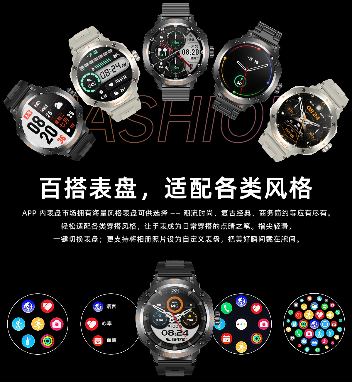 1.46TFT、360*360、充电仓240mAh;NFC、APP个性自定义表盘、手表6种UI界面切换;蓝牙拨号通话、健康监测