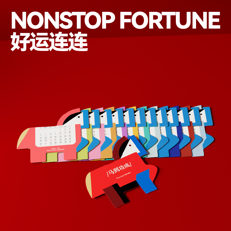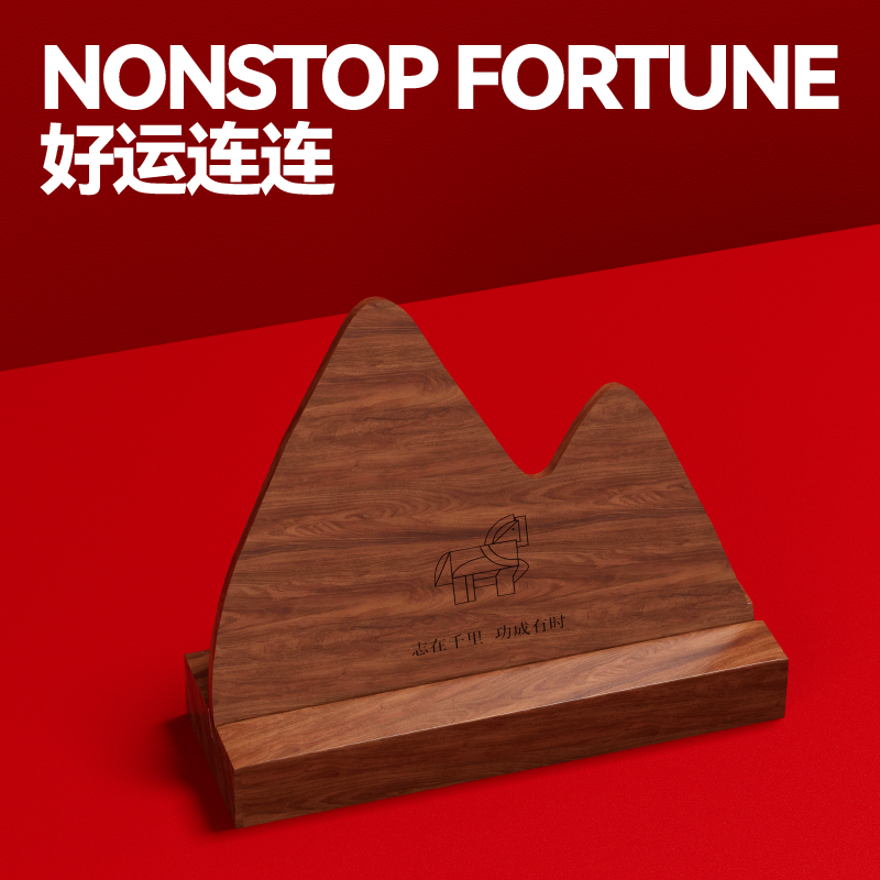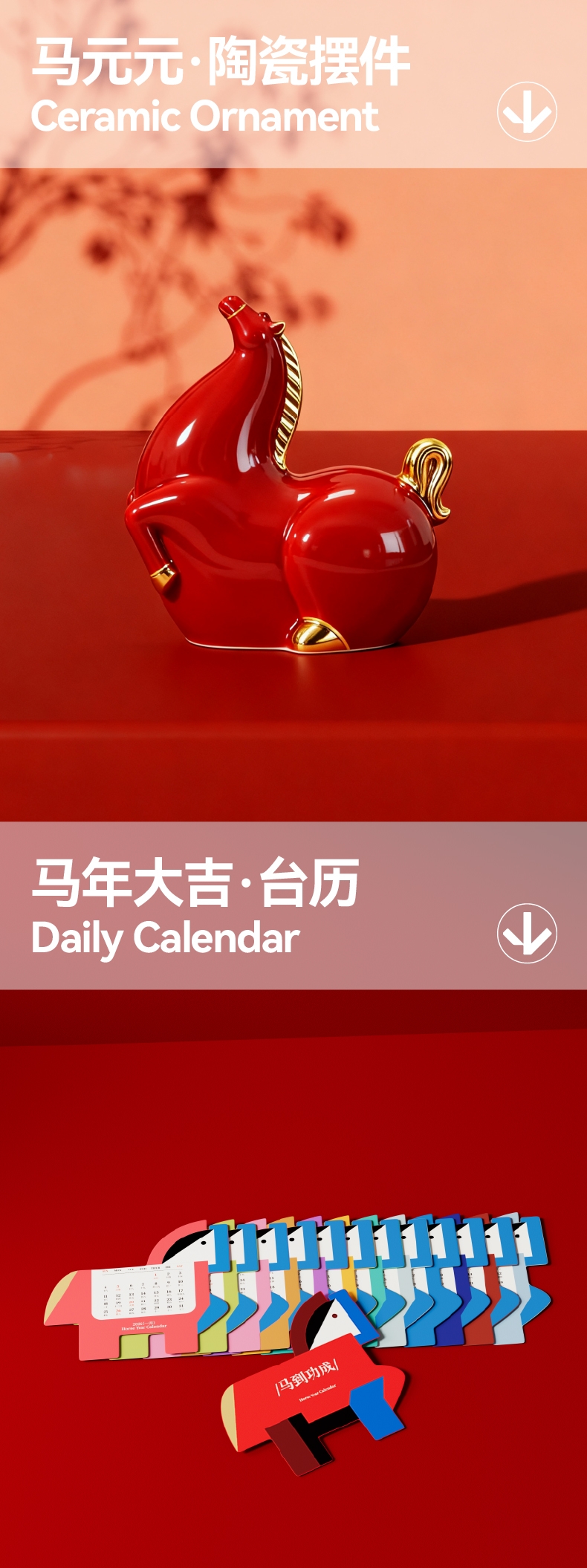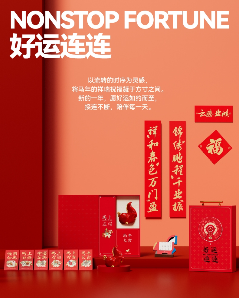 内搭马年摆件——马元元,元,取自“元宝”;礼盒表面巧妙融入可转动圆盘,暗合“时来运转”的巧思;每转动一次就切换一幅精心绘制的插画对应一句马年祝福