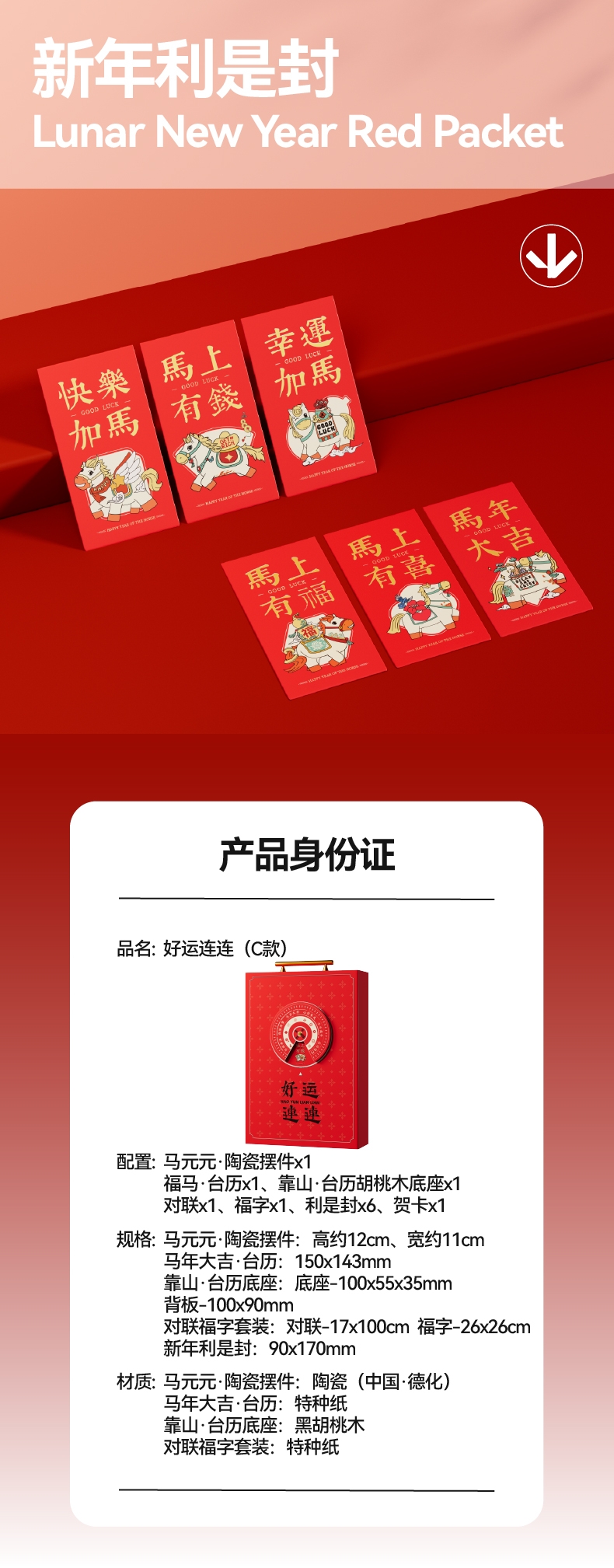配置清单:精装提盒 x1 马元元·陶瓷摆件x1 靠山·台历胡桃木底座(手机支架)x1 福马·台历x1、对联x1、福字x1 利是封x6、贺卡x1