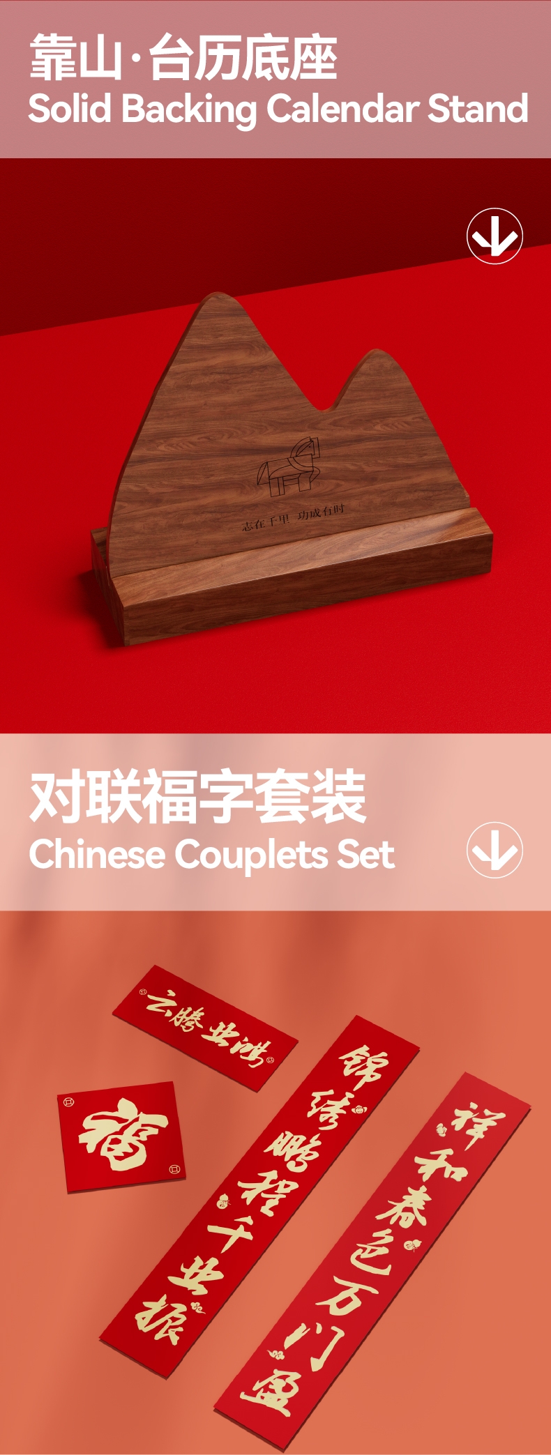马年大吉·台历:尺寸:150x143mm 材质:特种纸;尺寸:底座-100x55x35mm 背板-100x90mm 材质:黑胡桃木