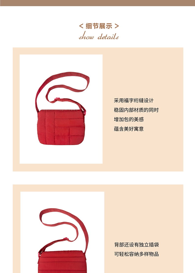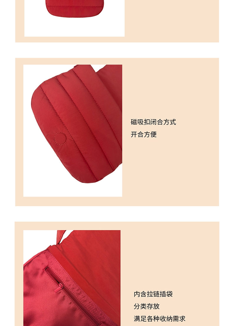 软糥轻便,一挎轻享。多个分仓设计;主仓+内部拉链袋+插袋,背部还设有独立插袋;可轻松容纳多样物品、满足各种收纳需求。分类存放