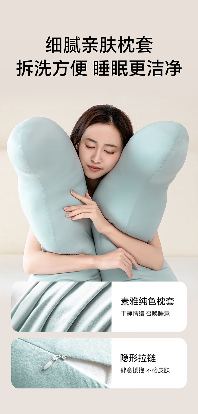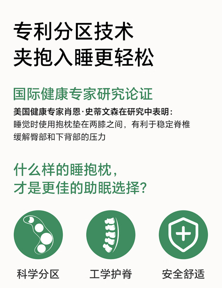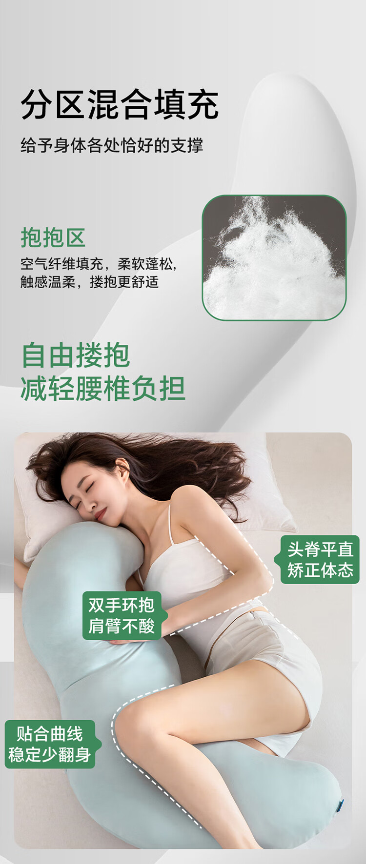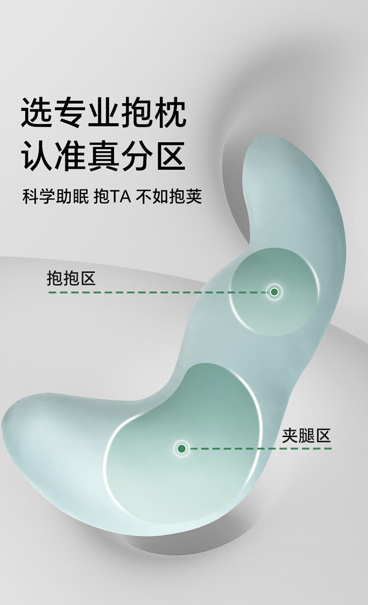 科学助眠,呵护健康睡姿体态;分区混合填充,给予身体各处恰好的支撑;自由搂抱,减轻腰椎负担