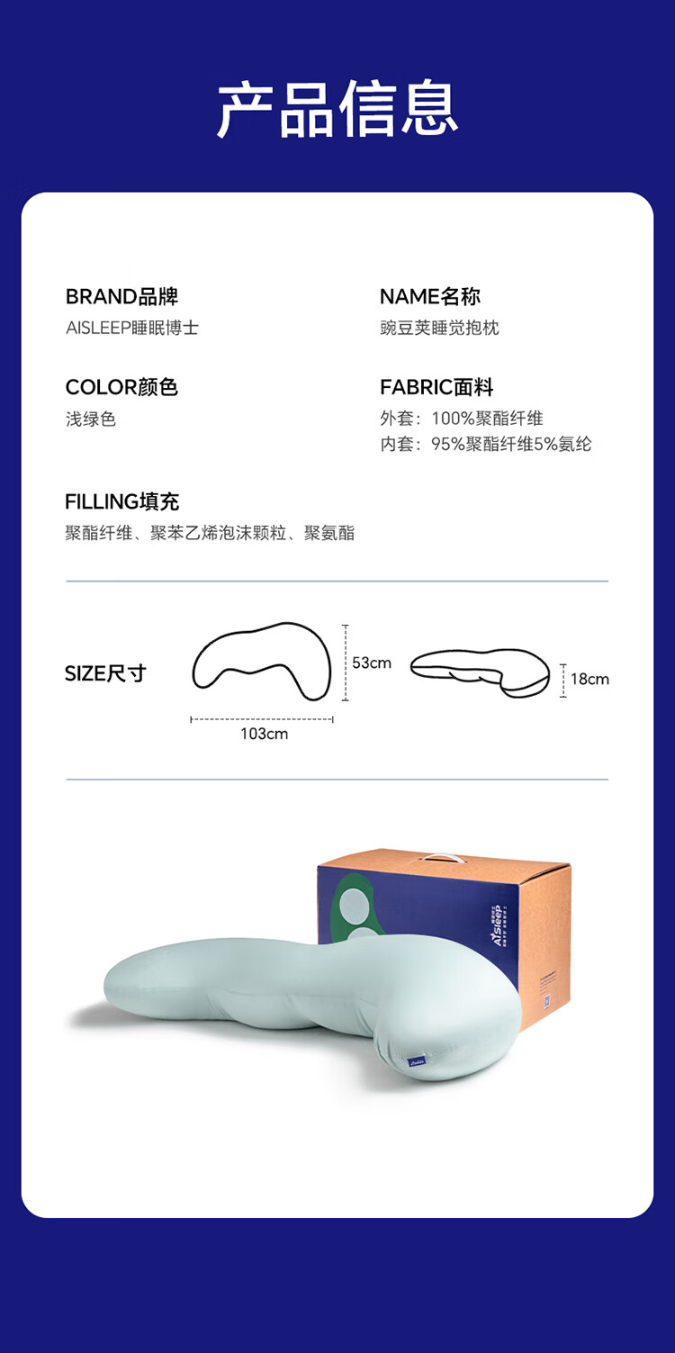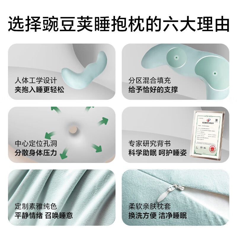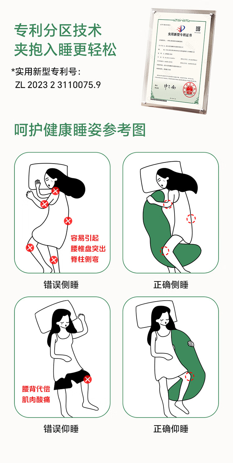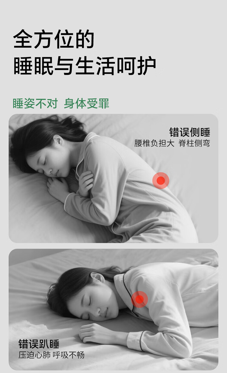 科学助眠,呵护健康睡姿体态;分区混合填充,给予身体各处恰好的支撑;自由搂抱,减轻腰椎负担