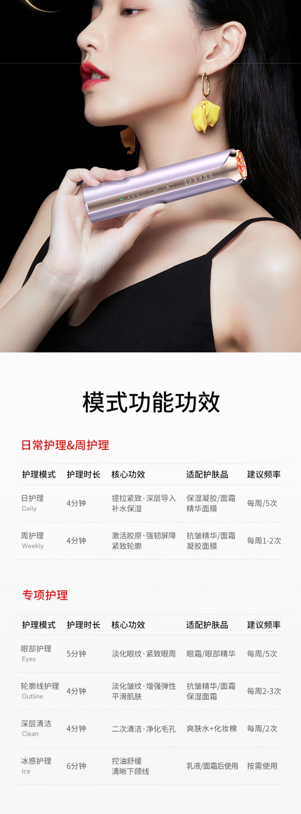 透皮导入,热敷模式,震动按摩,冰敷模式;颈部,眼部,面部多部位可用;导入促渗,提拉瘦脸,家用,宿舍,户外便携