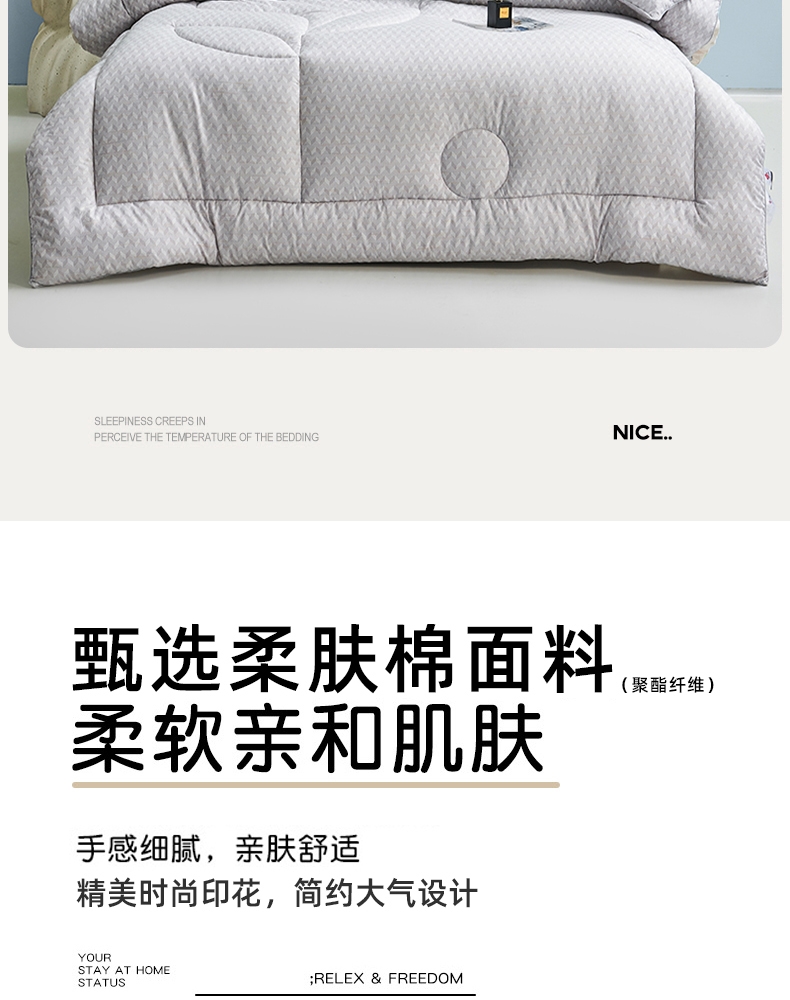 柔肤棉面料,告别冷被窝;整张羽丝棉填充,不易跑绒起坨;彩盒、无纺布两种包装,满足集采、代发需求。