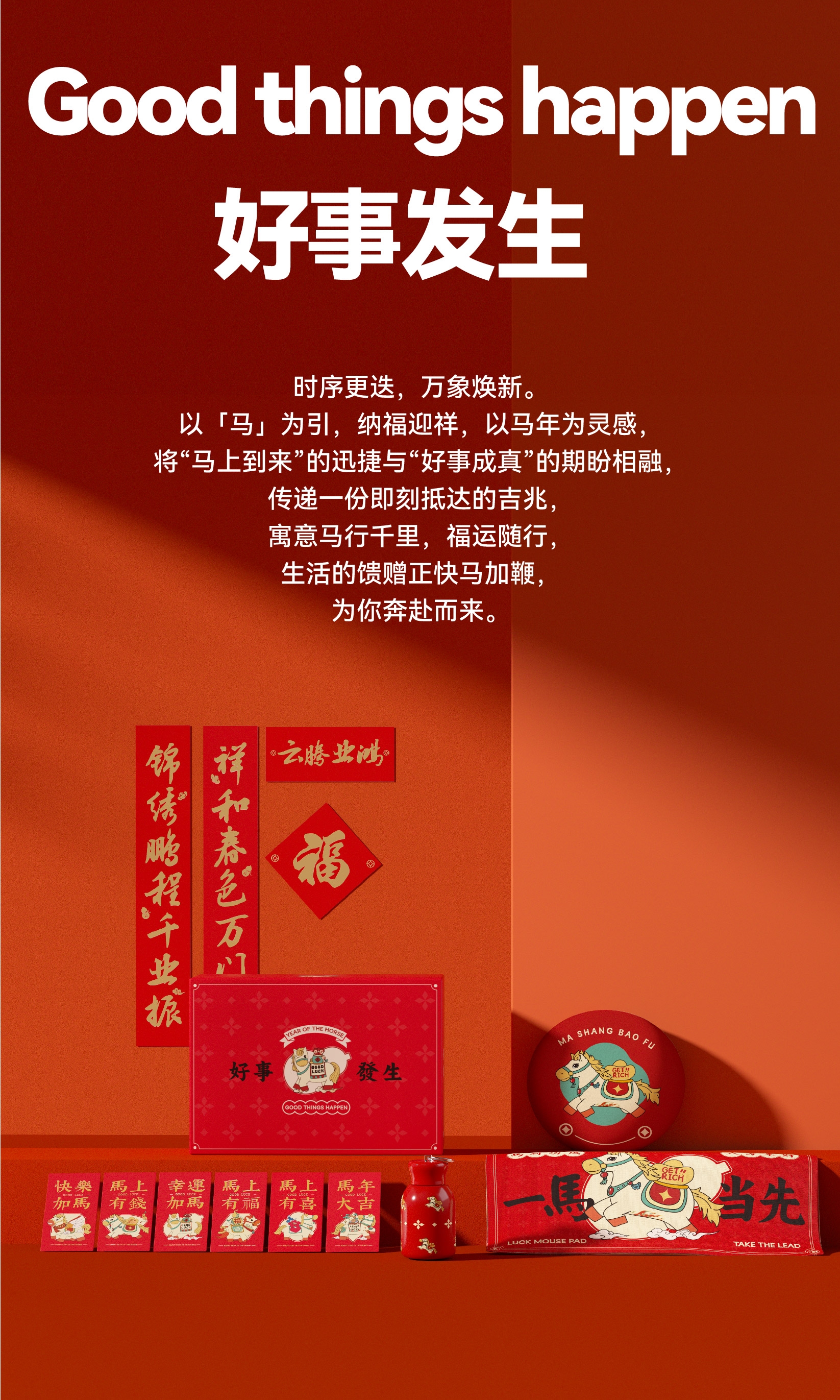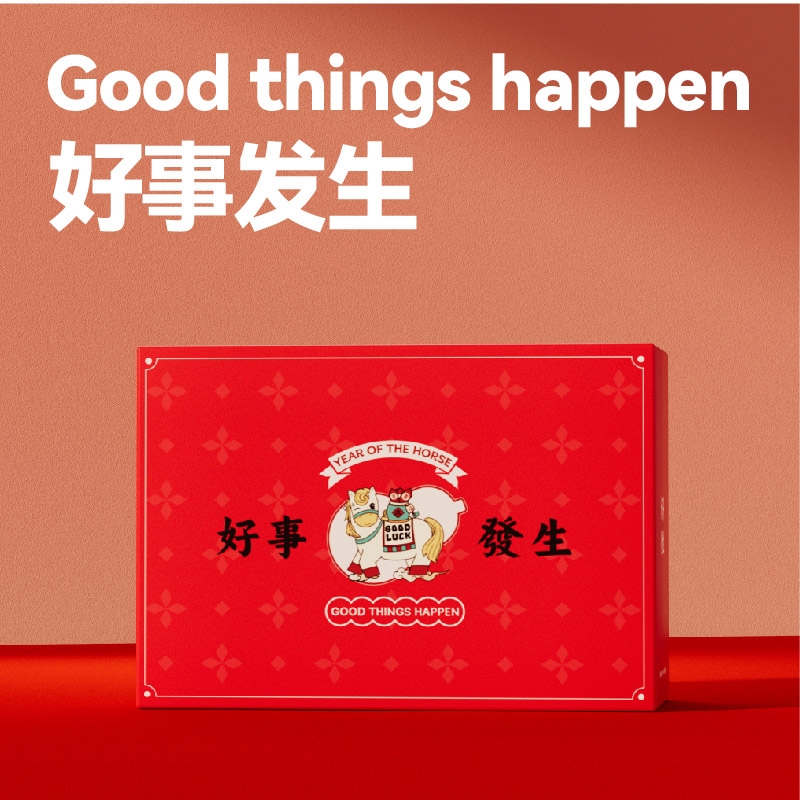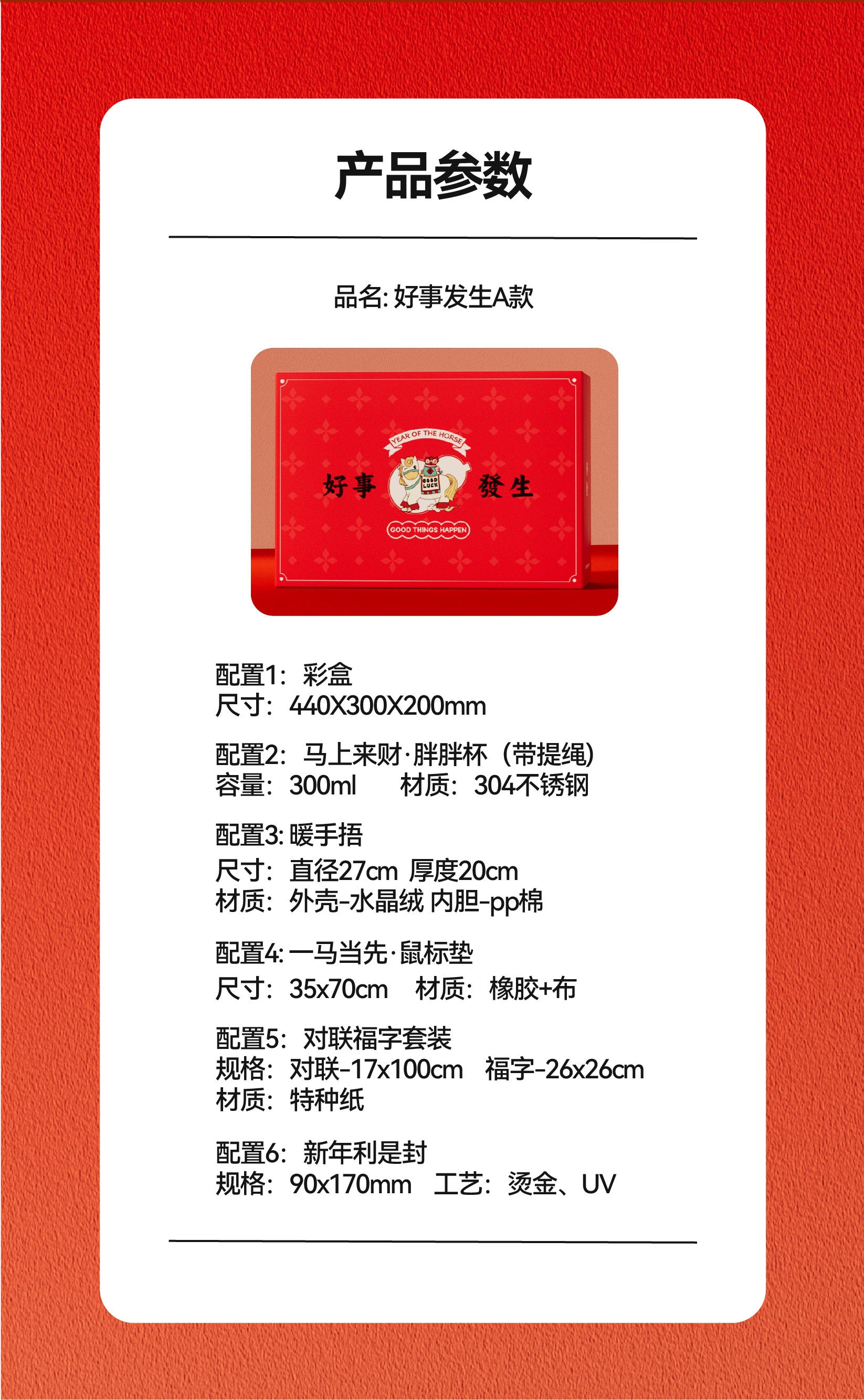 配置清单:提盒x1、马上抱富·暖手捂x1 马上来财·胖胖杯x1 一马当先·鼠标垫x1 对联福字x1、红包x6、贺卡x1
