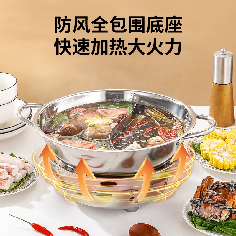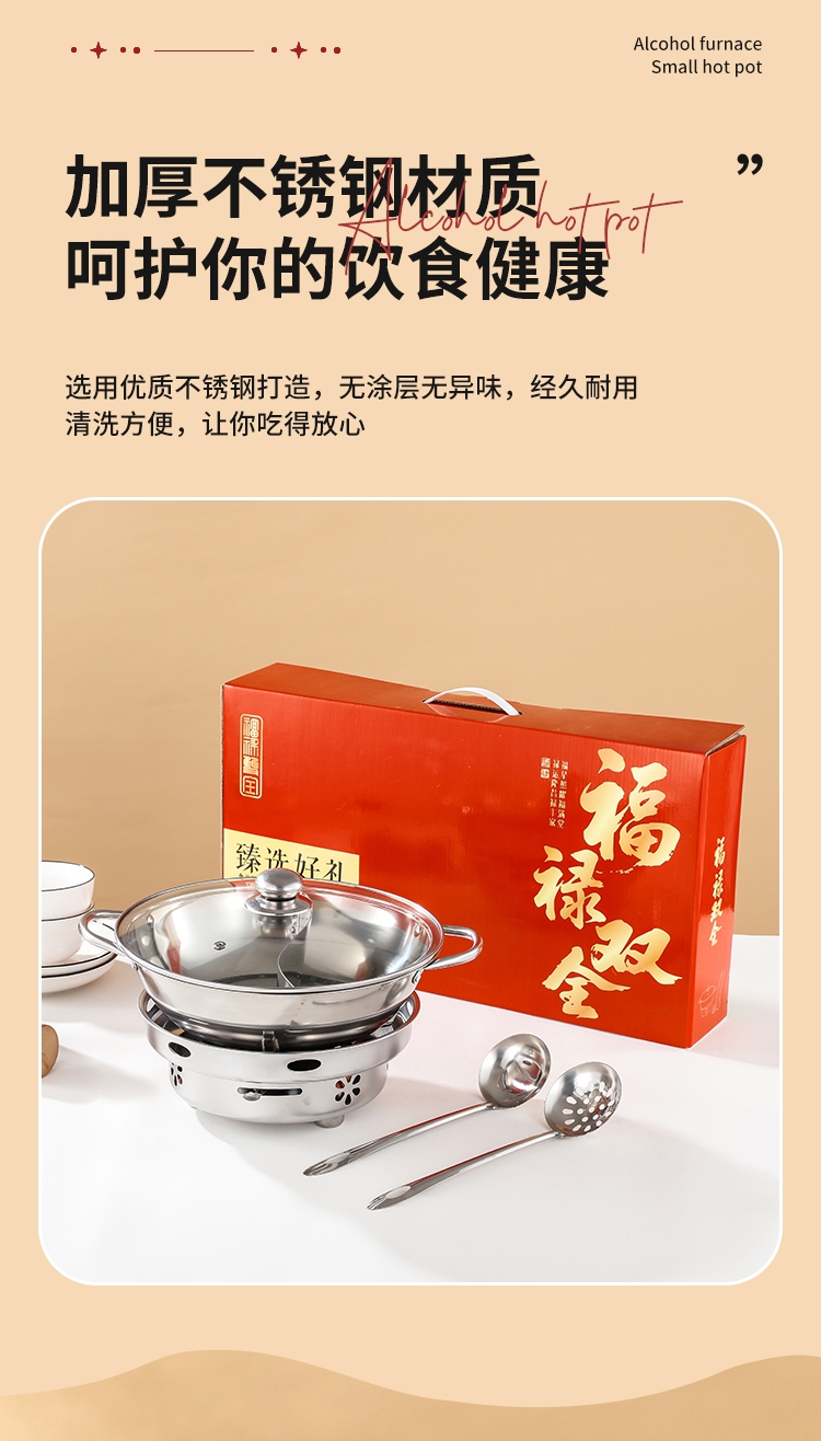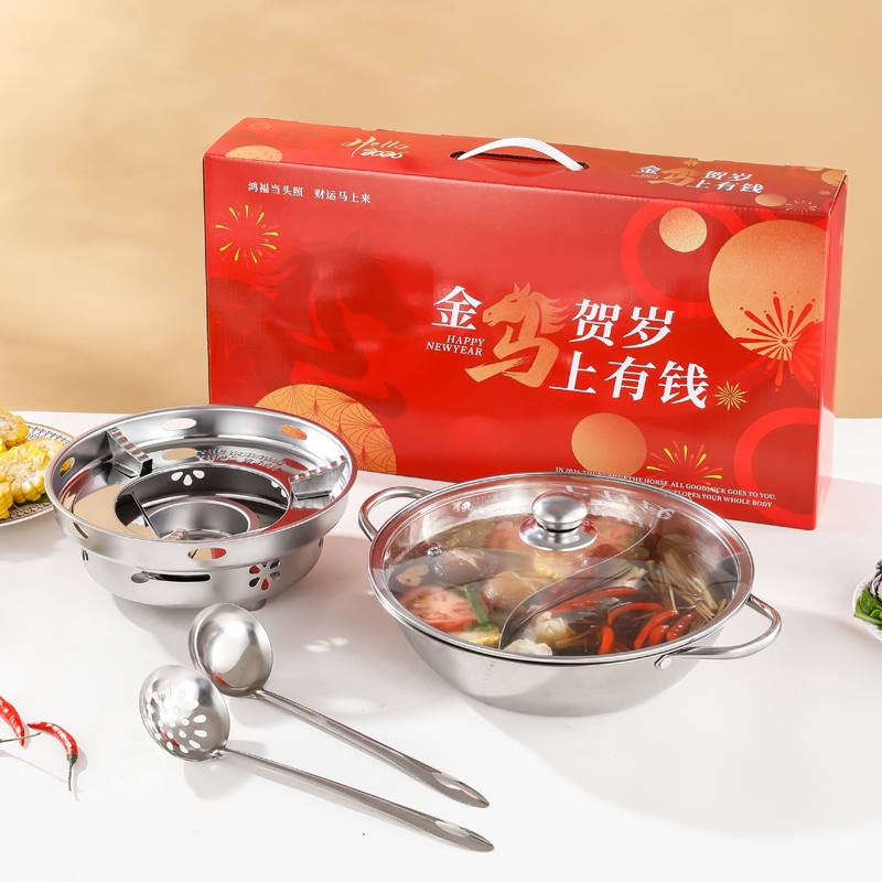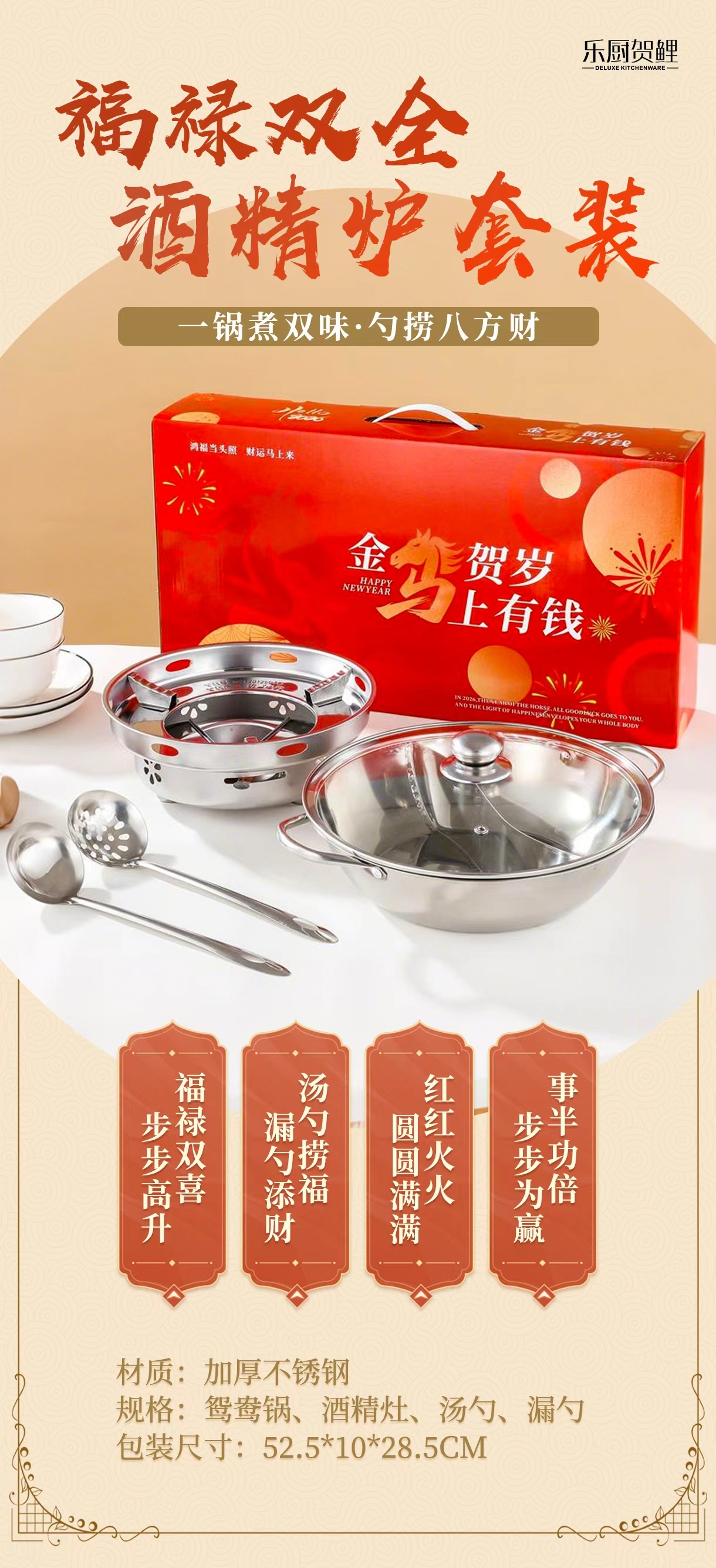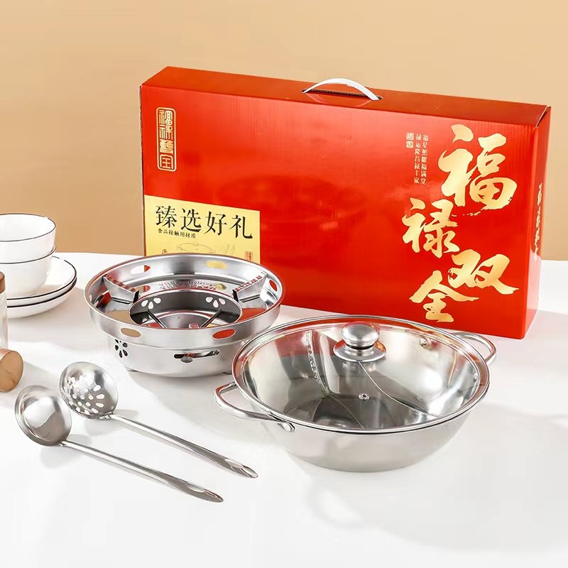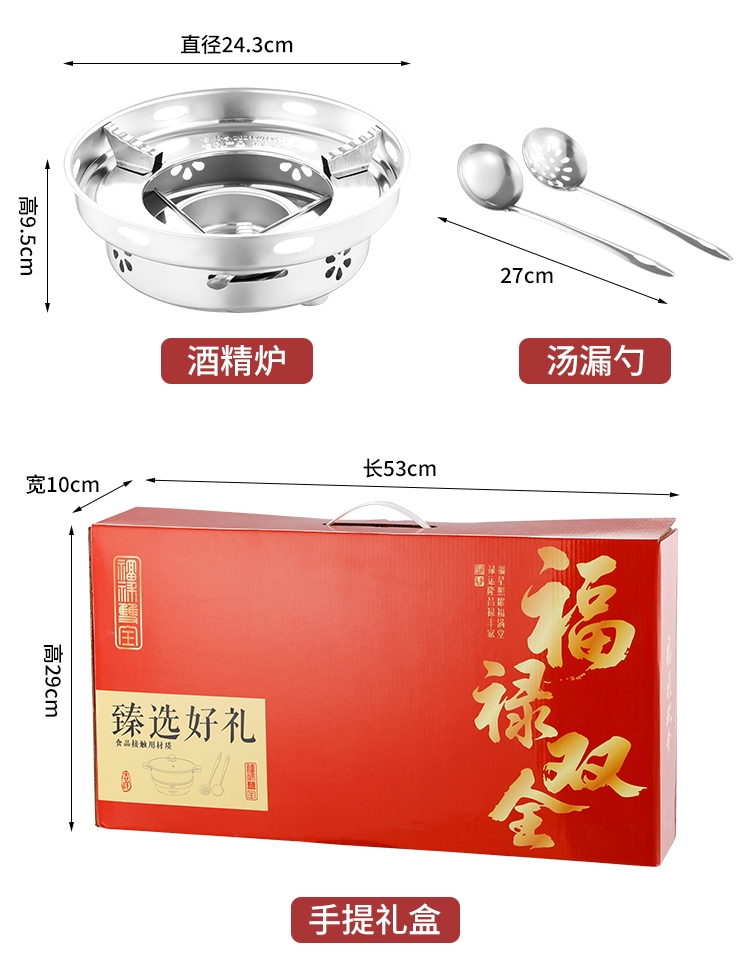 福禄双喜,汤勺捞福,漏勺添财,红红火火团团圆圆;火锅二味分隔设计满足不同口味需求冬天涮火锅实用美味;超大礼盒包装,客情维护,促销储值礼品,低成本高价值