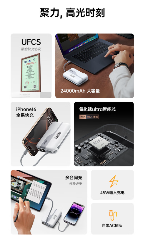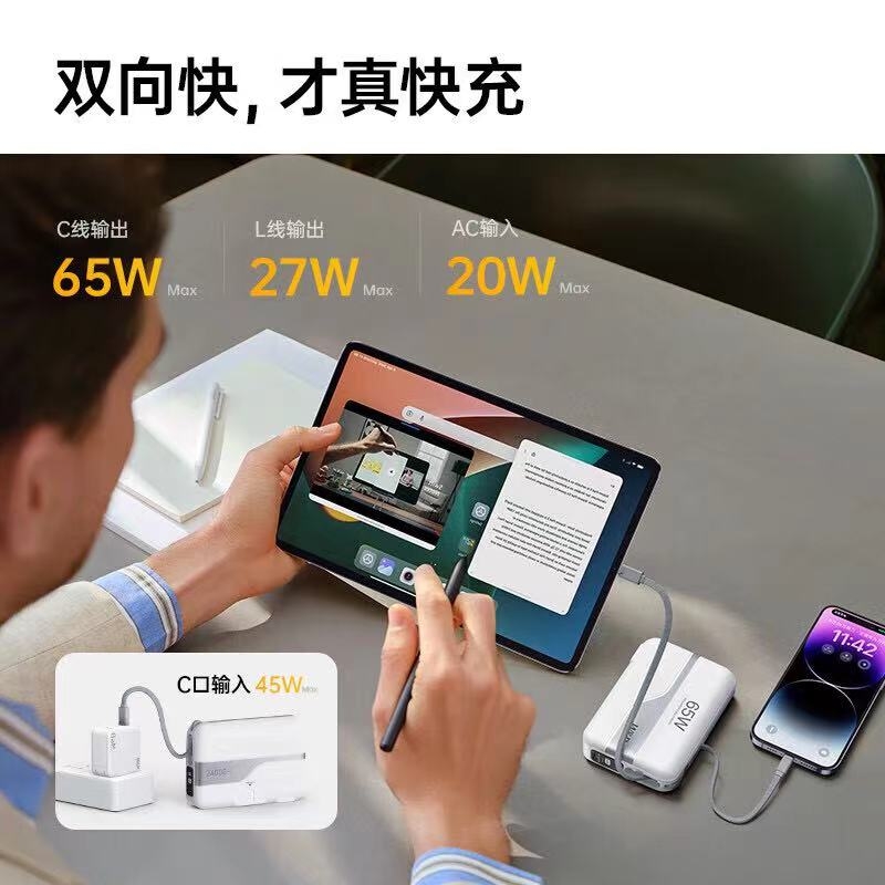 自带隐藏式AC插头和双快充线;65W双快充,LED数码显示;国家3C认证,放心上飞机