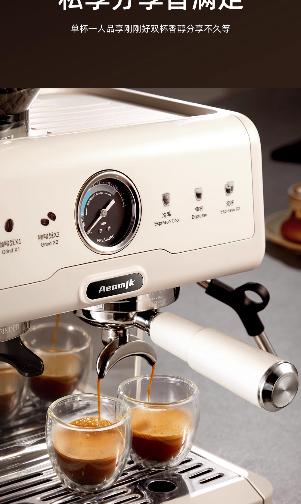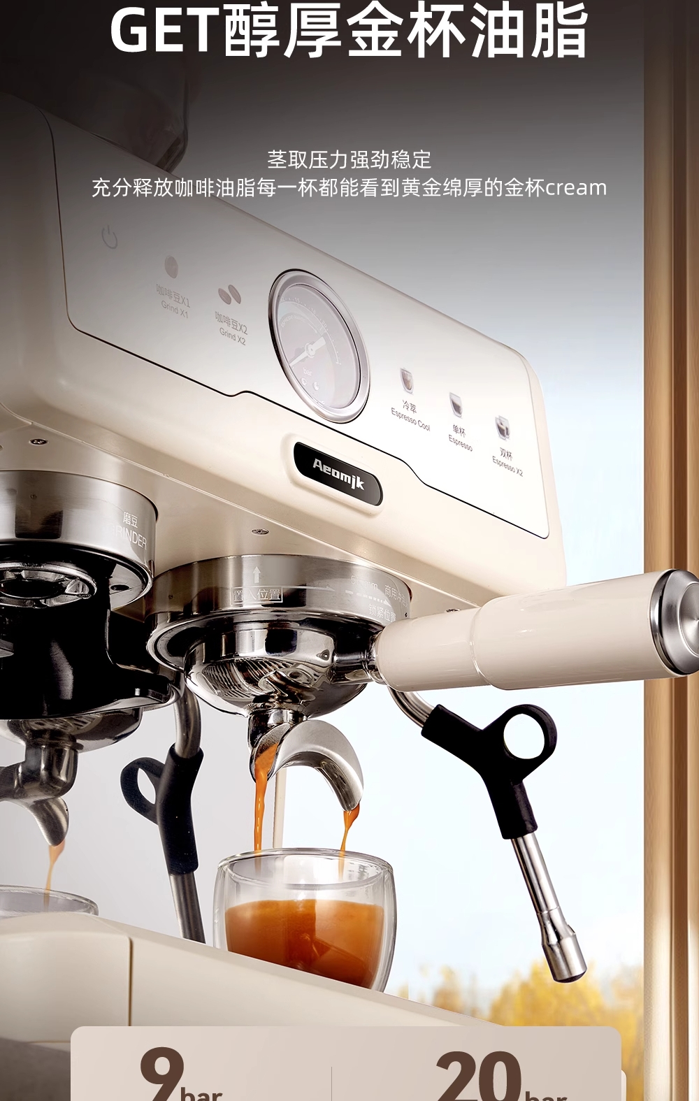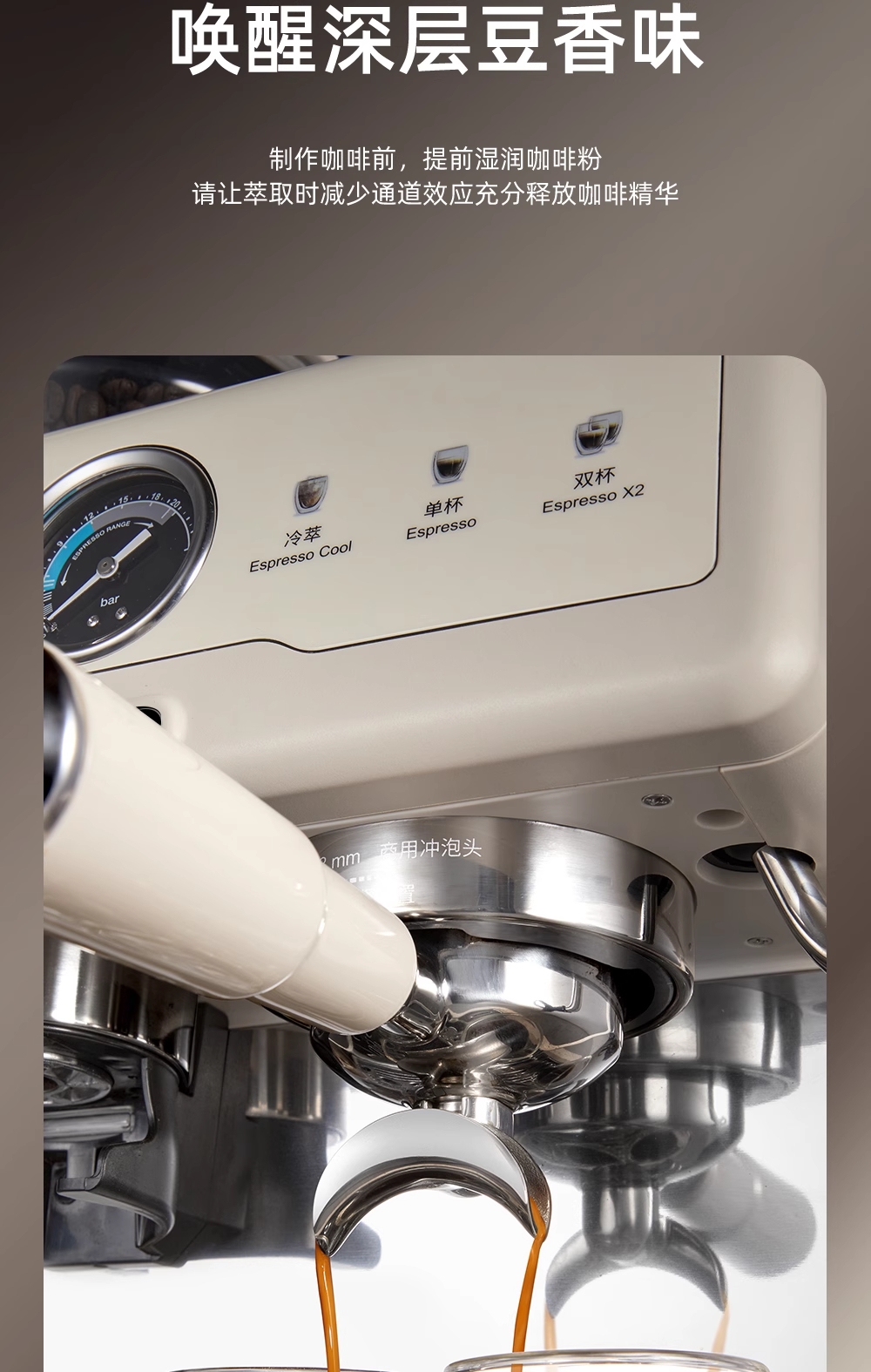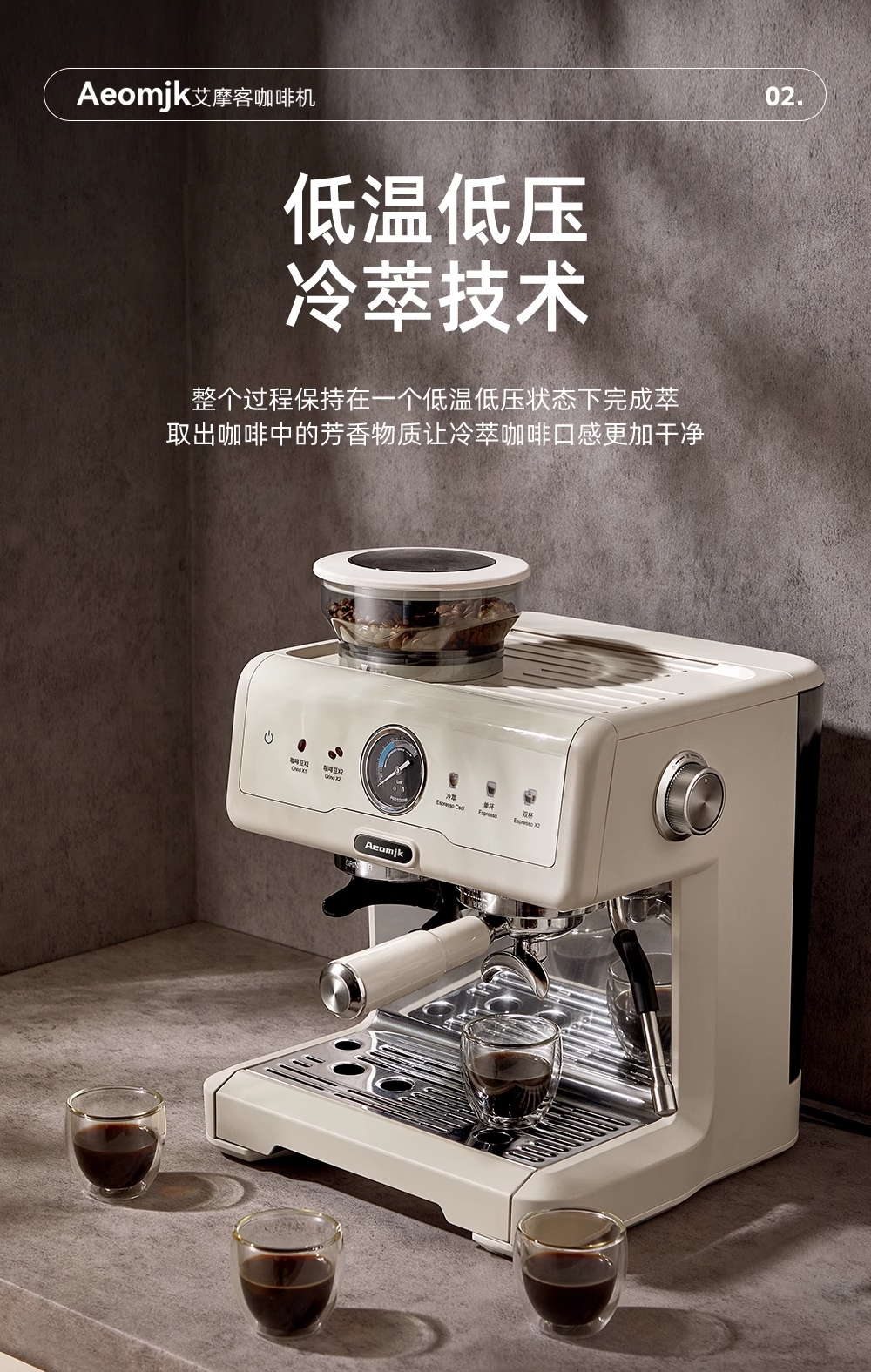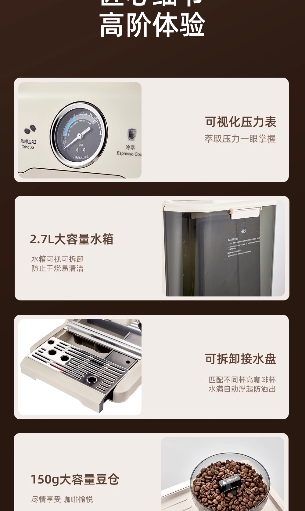 高级磨砂质感,复古压力表设计 ;20档精研磨系统设计,自调研磨粗细度;采用预浸泡功能,萃取更均匀,不宜翻车