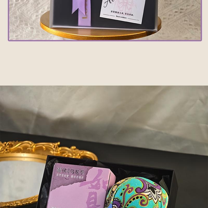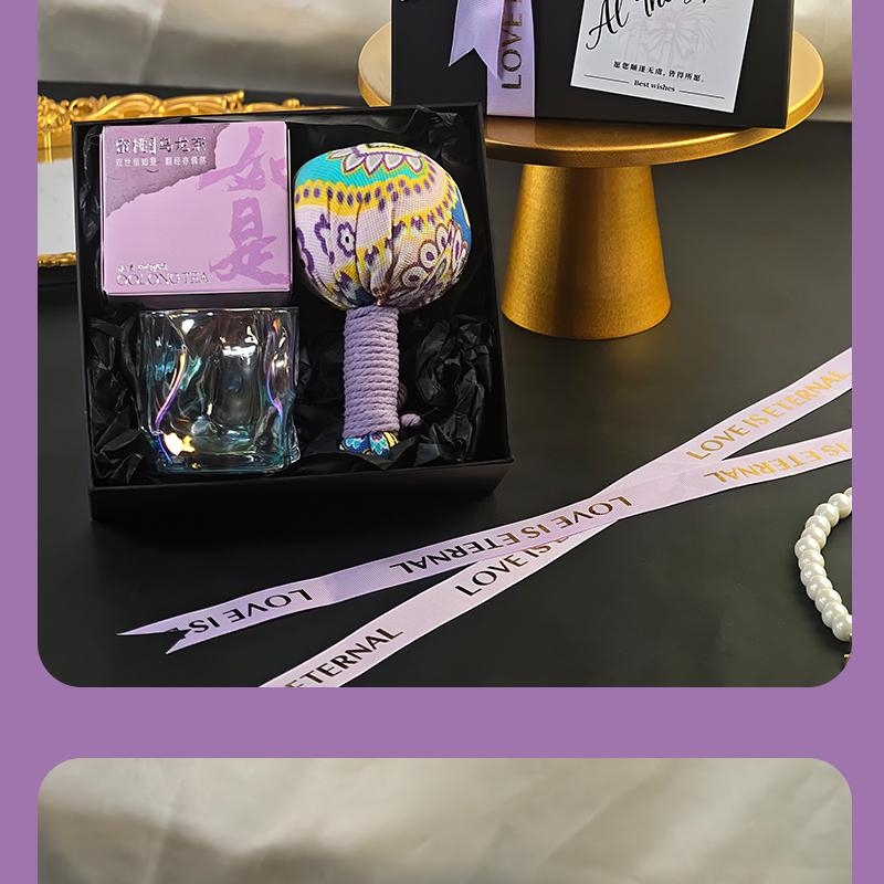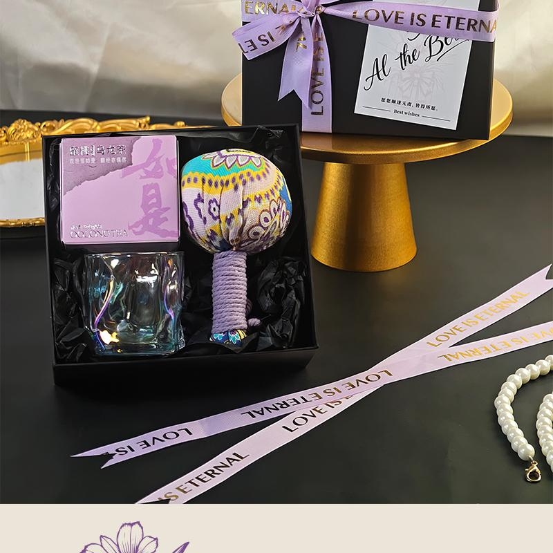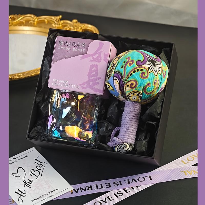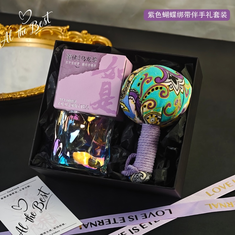 组合:扭扭玻璃杯、艾草养生锤、晚鲤蜜桃乌龙茶(3g*6袋)、紫色蝴蝶绑带礼盒+贺卡