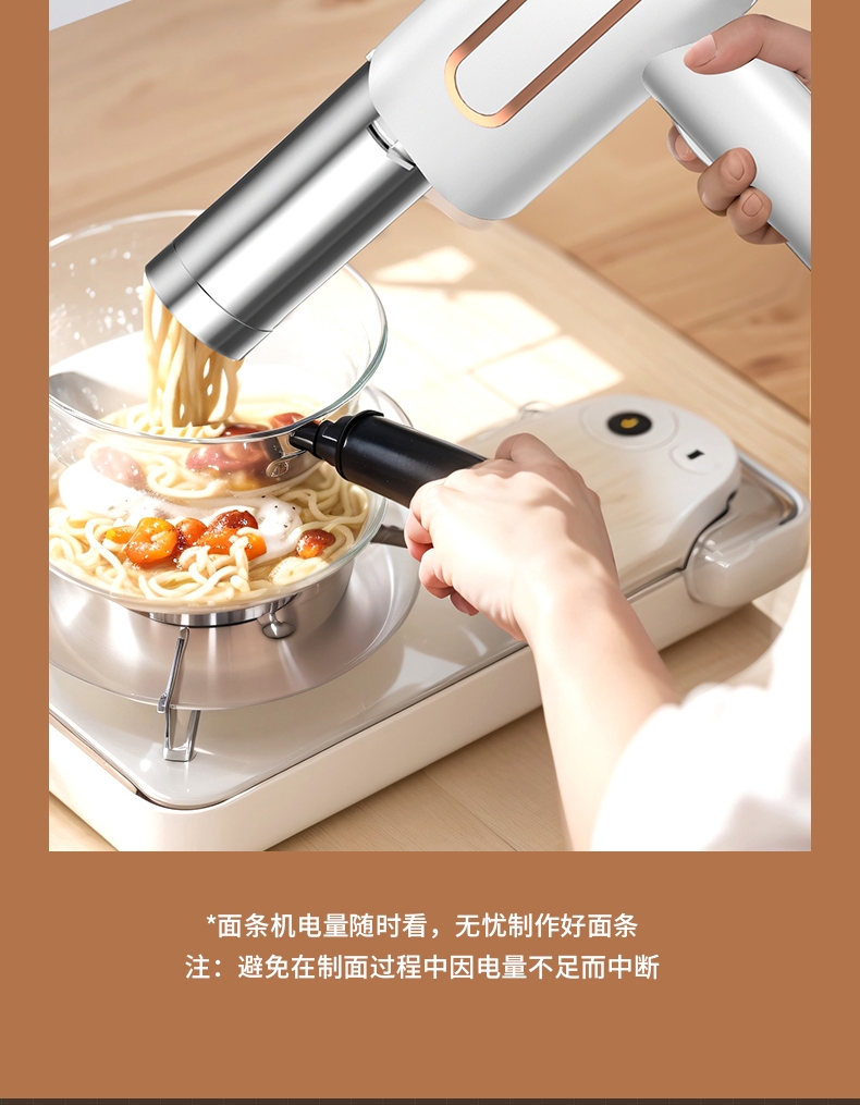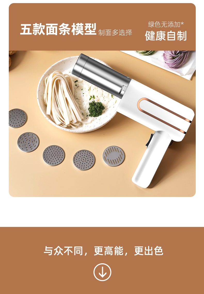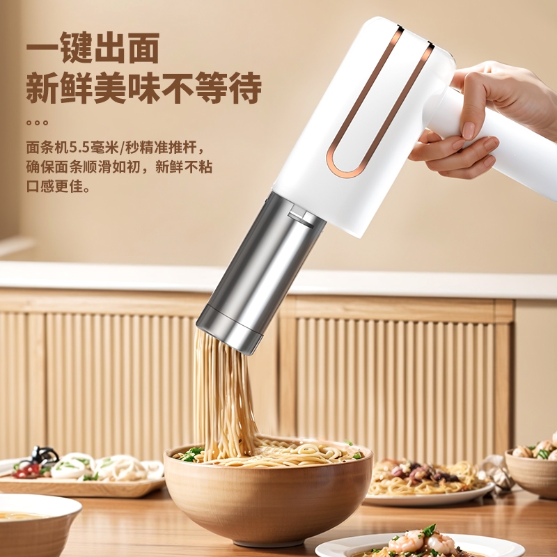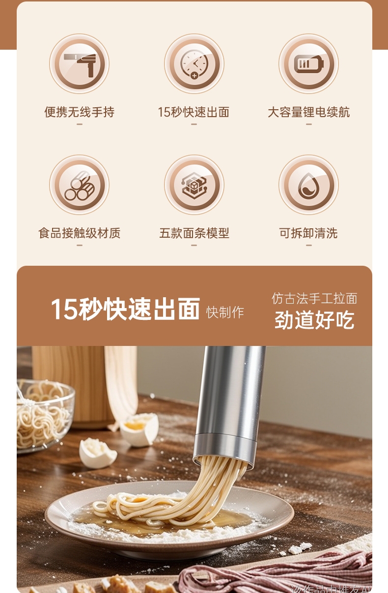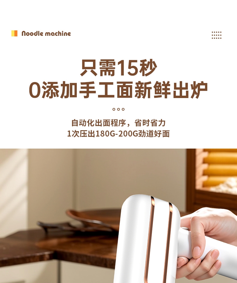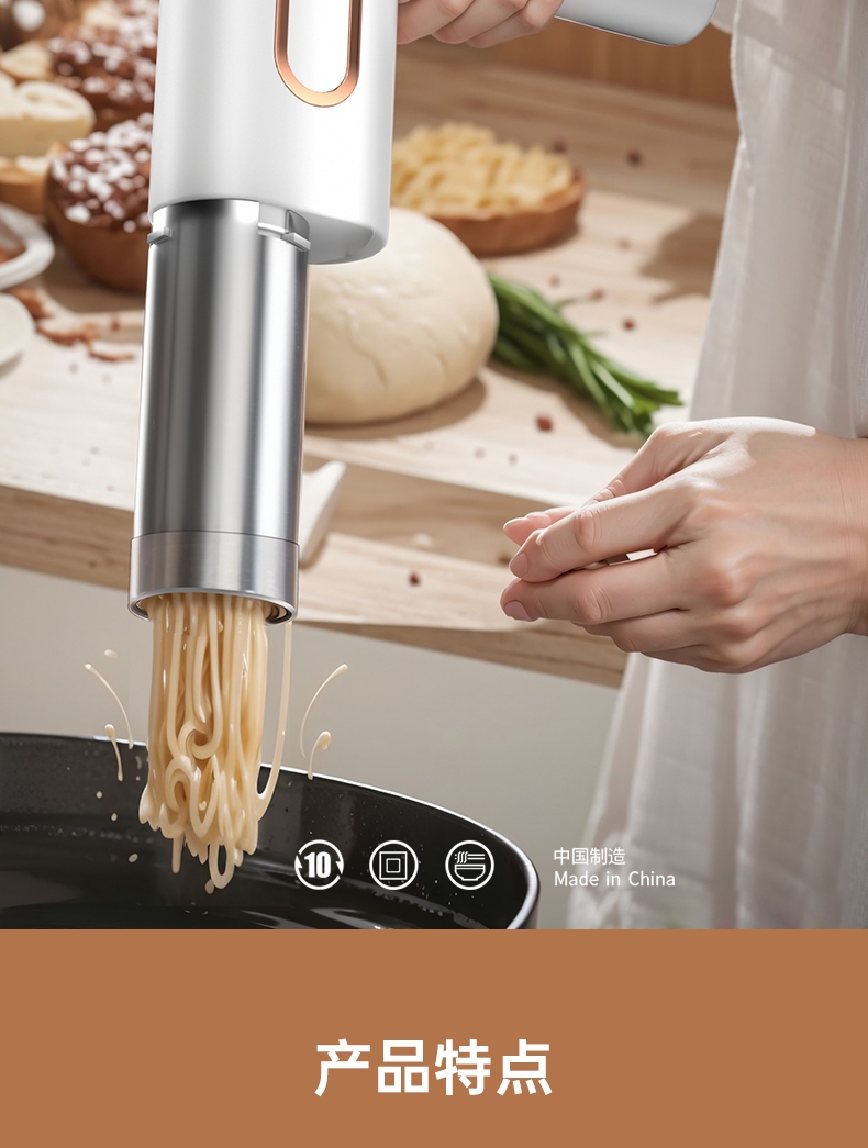便携无线手持,全自动出面;智能电量显示,轻松掌握工作状态;15秒快速出面,一次压出180g-200g劲道好面;五款面条模型:扁面/方面/宽面/粗面/细面;可拆卸设计,轻松收纳,方便清洗