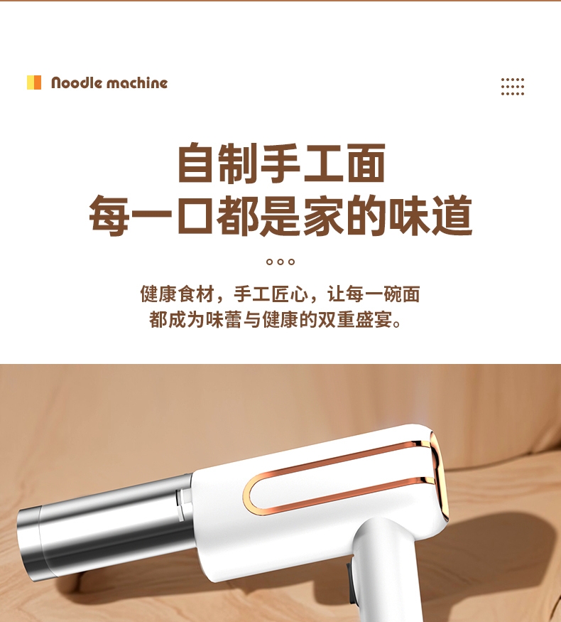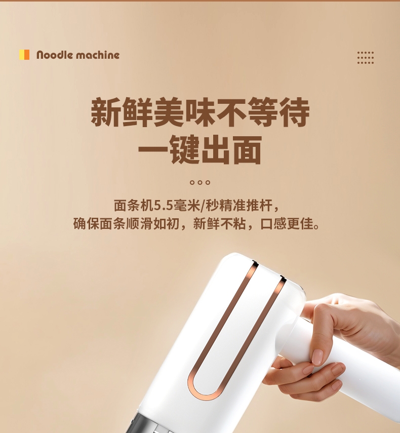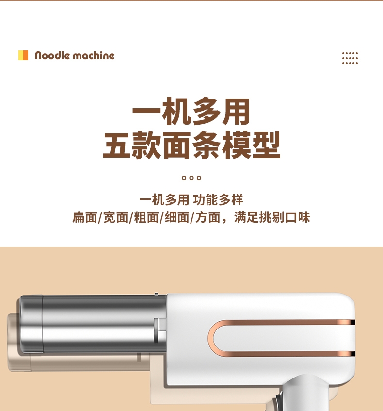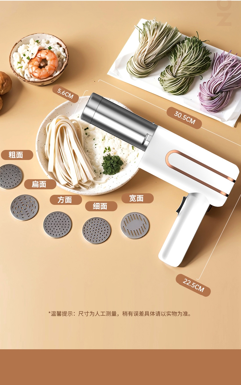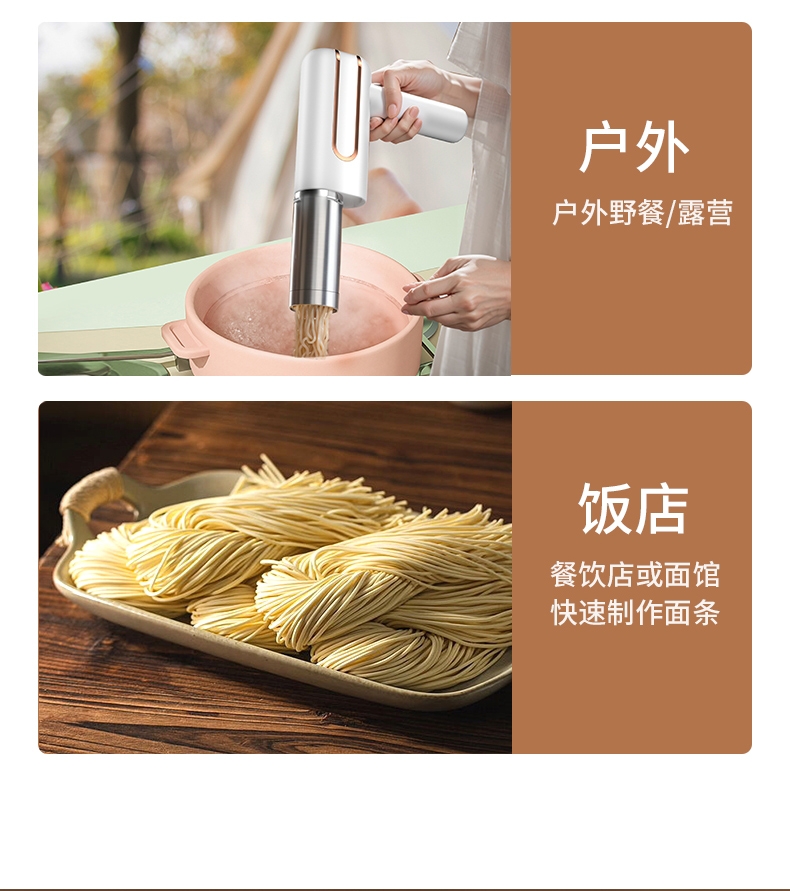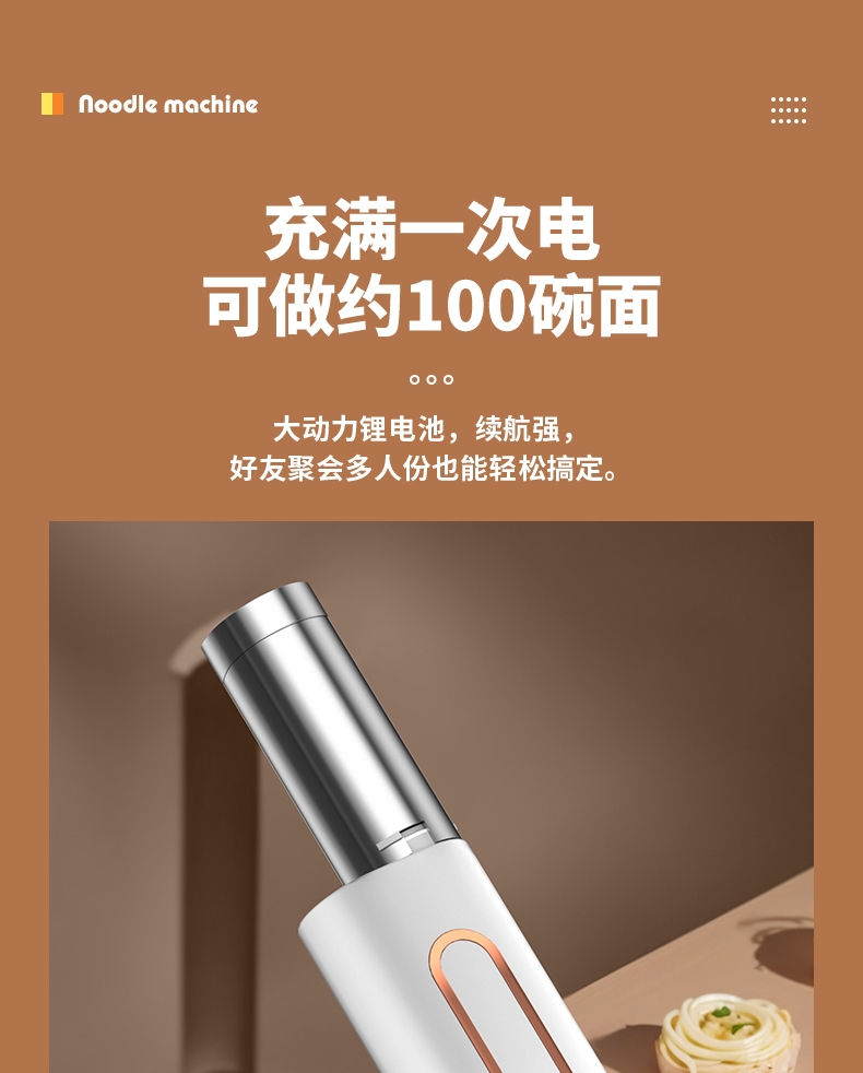 便携无线手持,全自动出面;智能电量显示,轻松掌握工作状态;15秒快速出面,一次压出180g-200g劲道好面;五款面条模型:扁面/方面/宽面/粗面/细面;可拆卸设计,轻松收纳,方便清洗