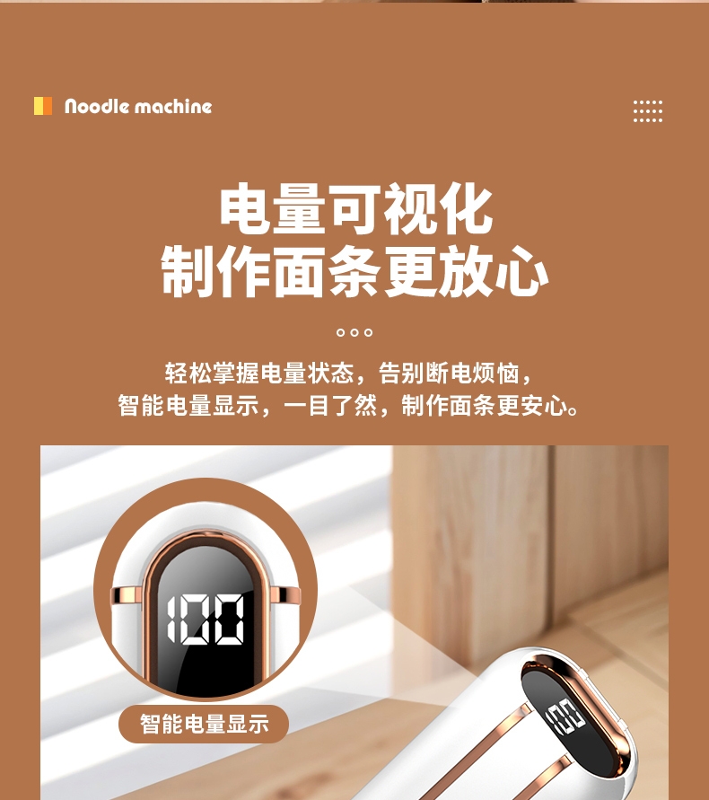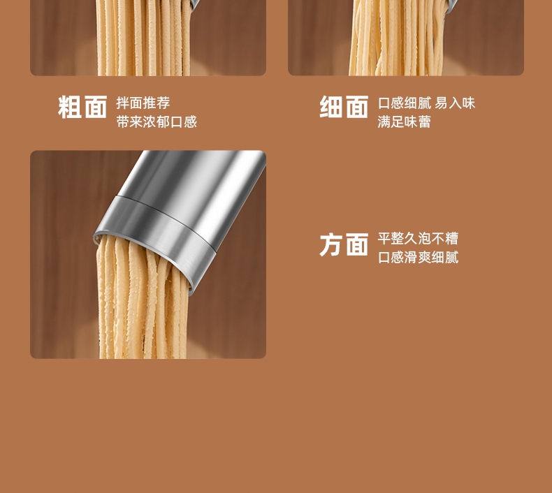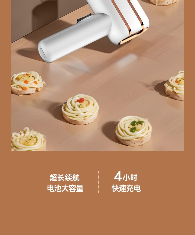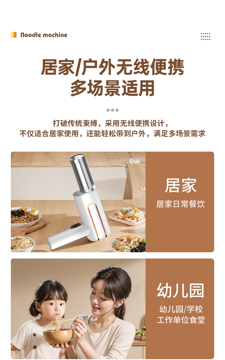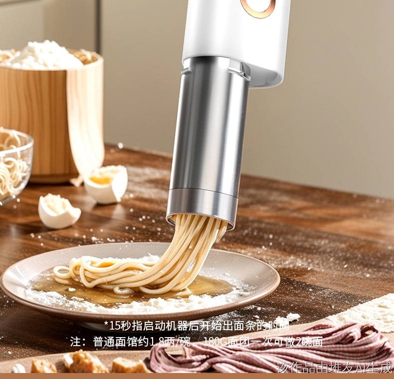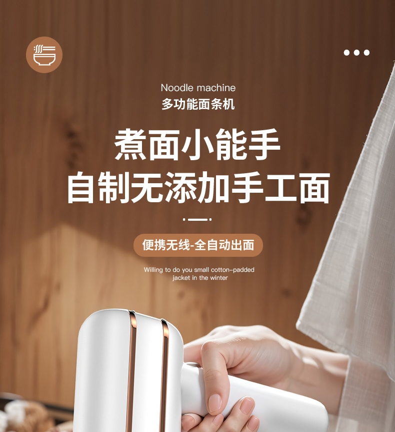 便携无线手持,全自动出面;智能电量显示,轻松掌握工作状态;15秒快速出面,一次压出180g-200g劲道好面;五款面条模型:扁面/方面/宽面/粗面/细面;可拆卸设计,轻松收纳,方便清洗