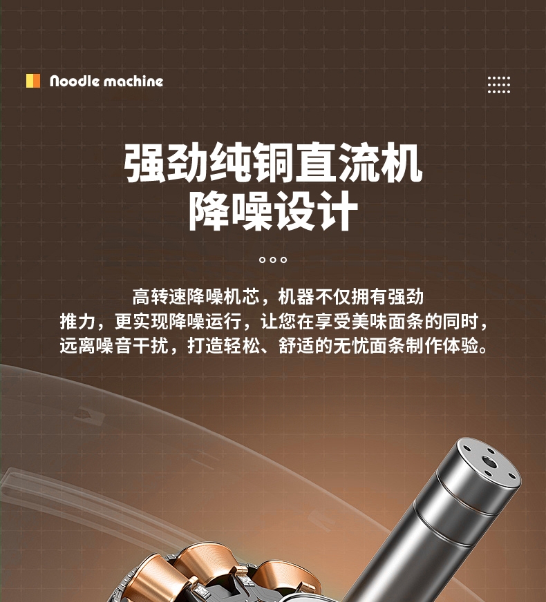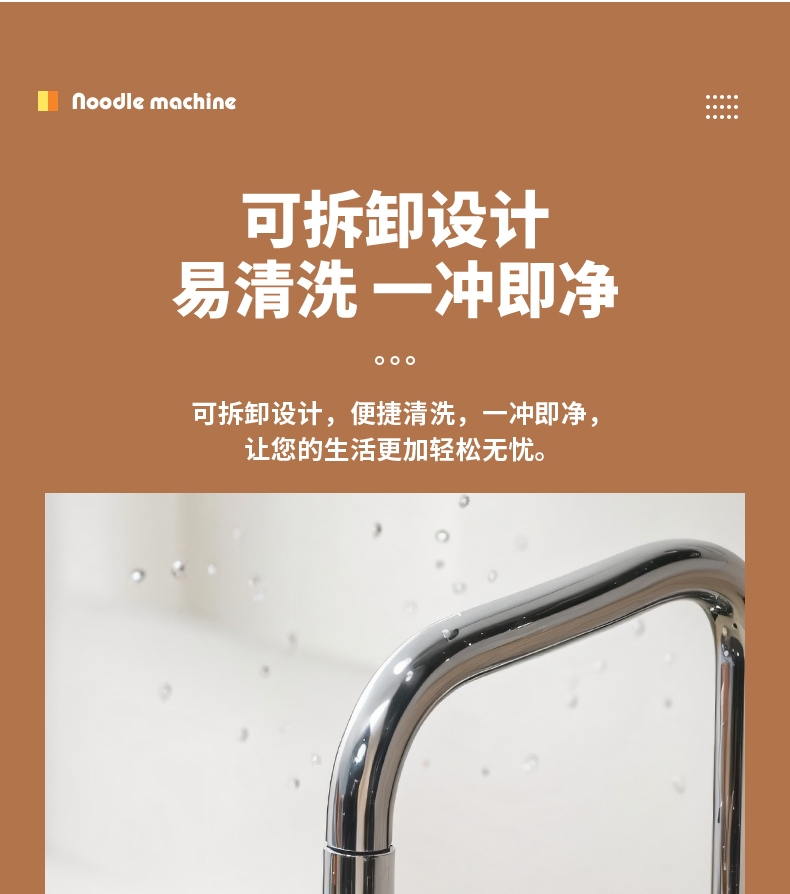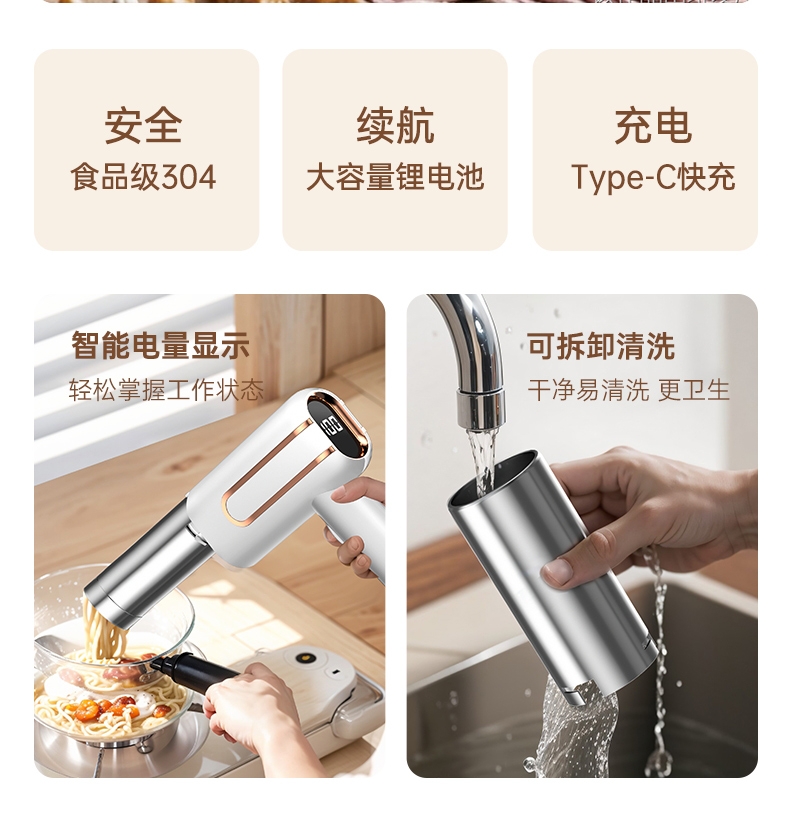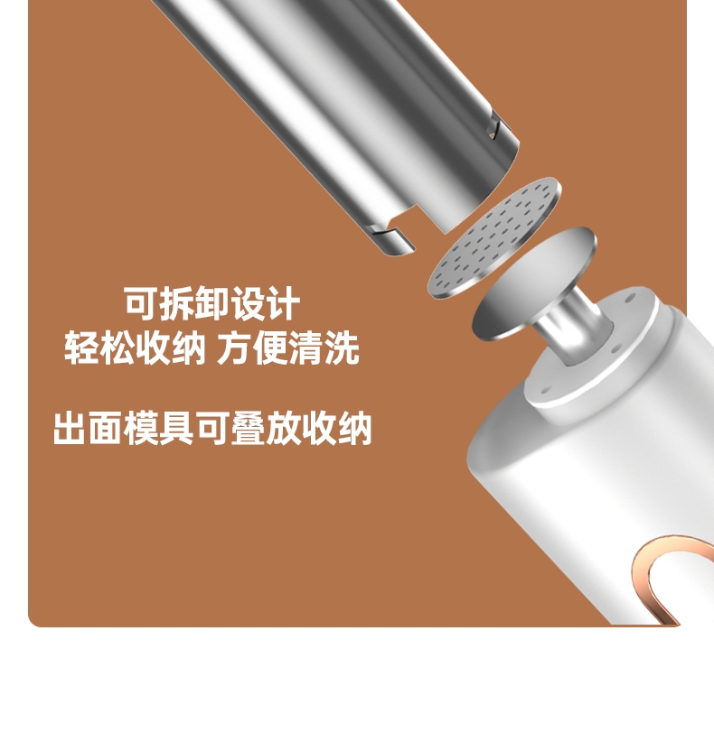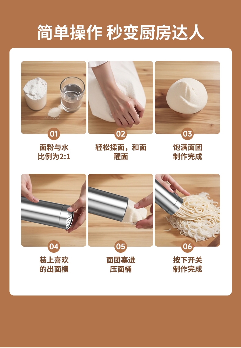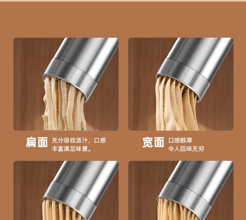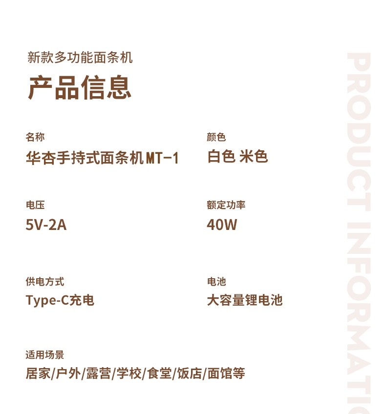 便携无线手持,全自动出面;智能电量显示,轻松掌握工作状态;15秒快速出面,一次压出180g-200g劲道好面;五款面条模型:扁面/方面/宽面/粗面/细面;可拆卸设计,轻松收纳,方便清洗