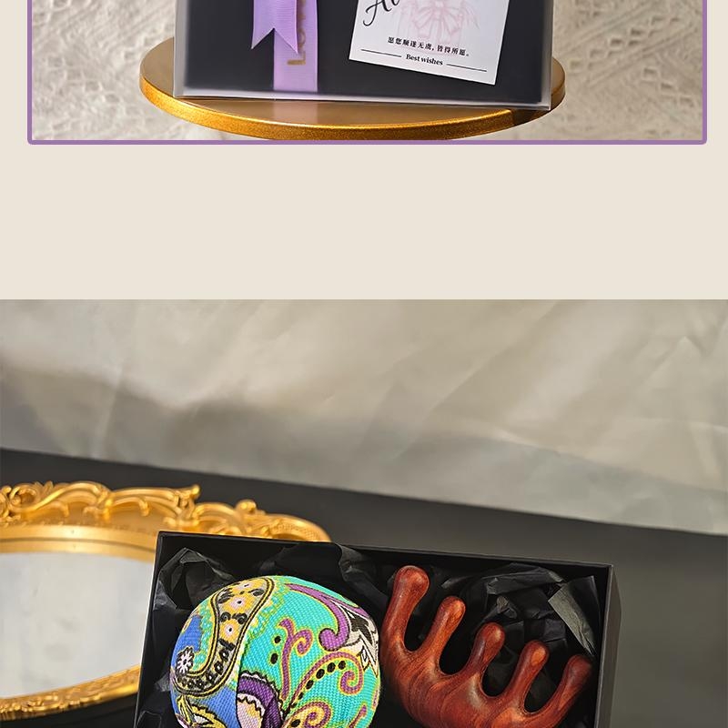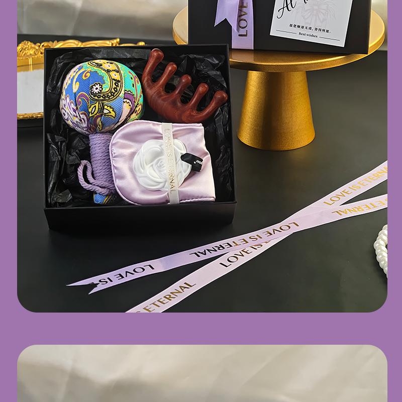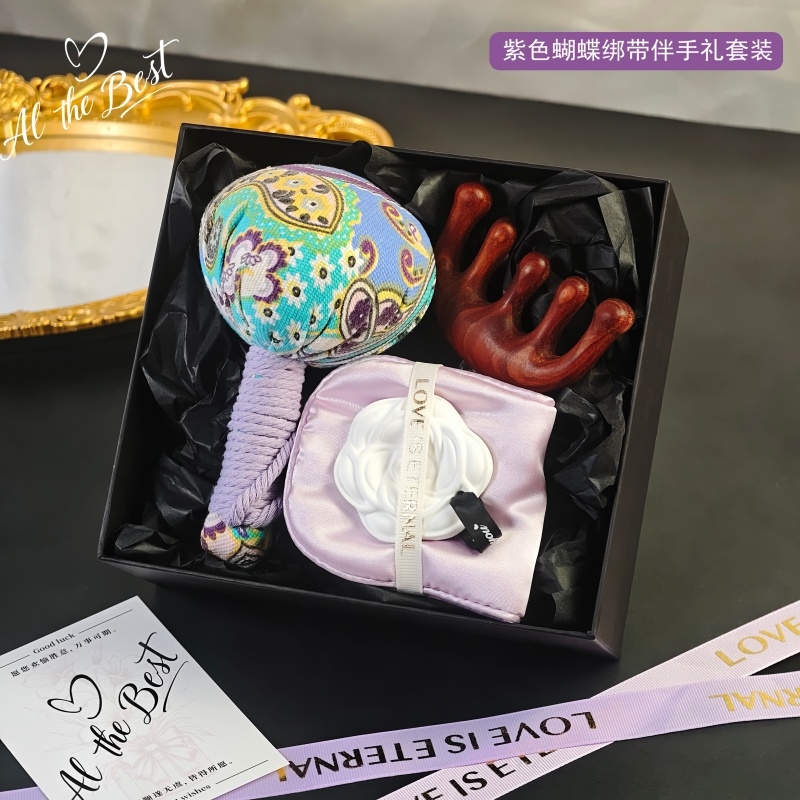 组合:按摩梳、香挂眼罩、艾草养生锤、紫色蝴蝶绑带礼盒+贺卡