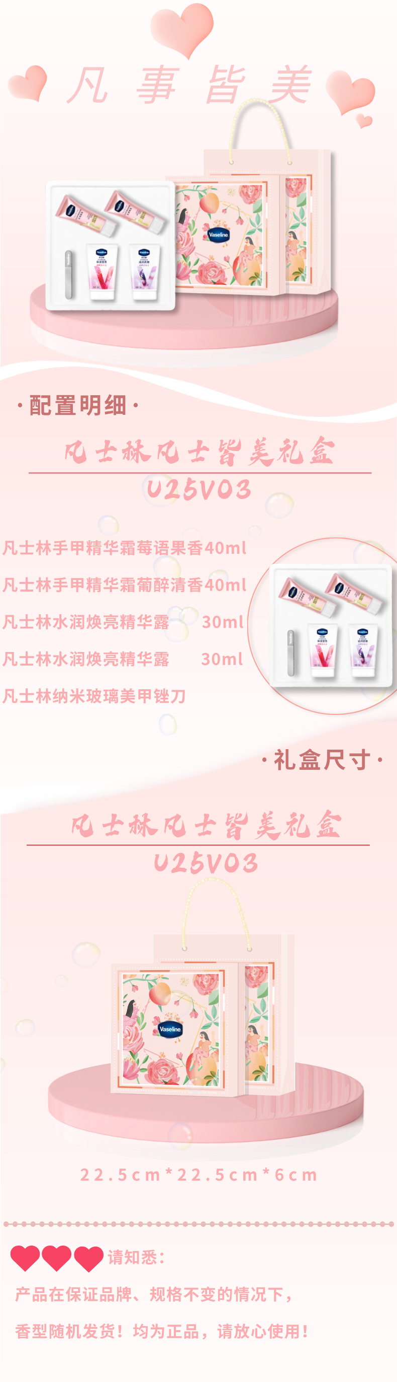 配置清单:凡士林保湿莹亮手甲精华霜莓语果香 40ml 凡士林滋润柔嫩手甲精华霜葡醉清香 40ml 凡士林水润焕亮精华露 30ml*2 凡士林纳米玻璃美甲锉刀