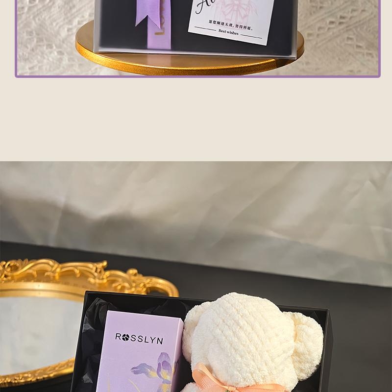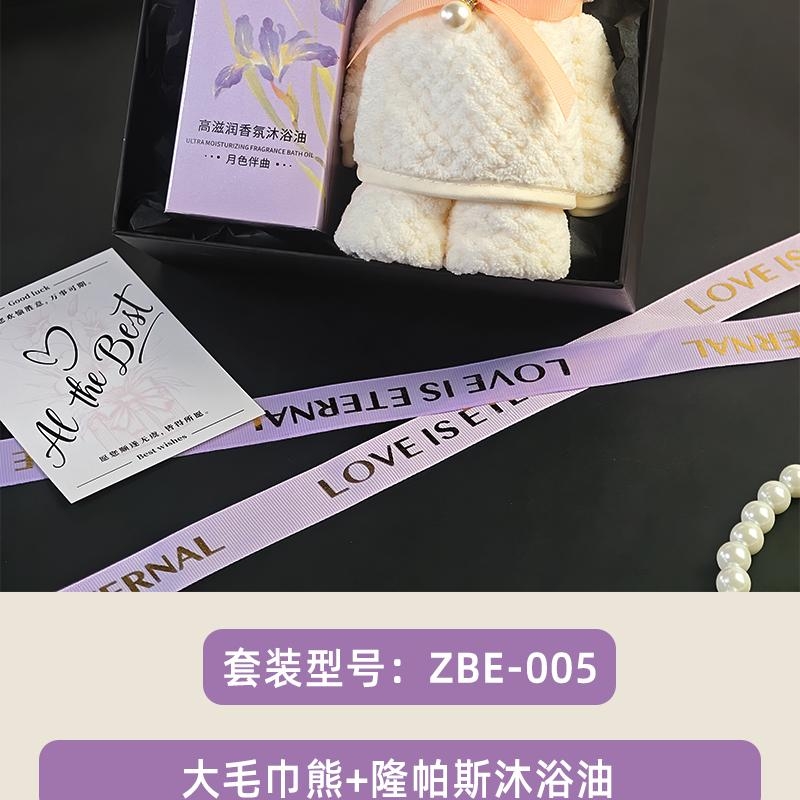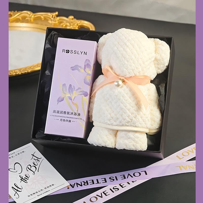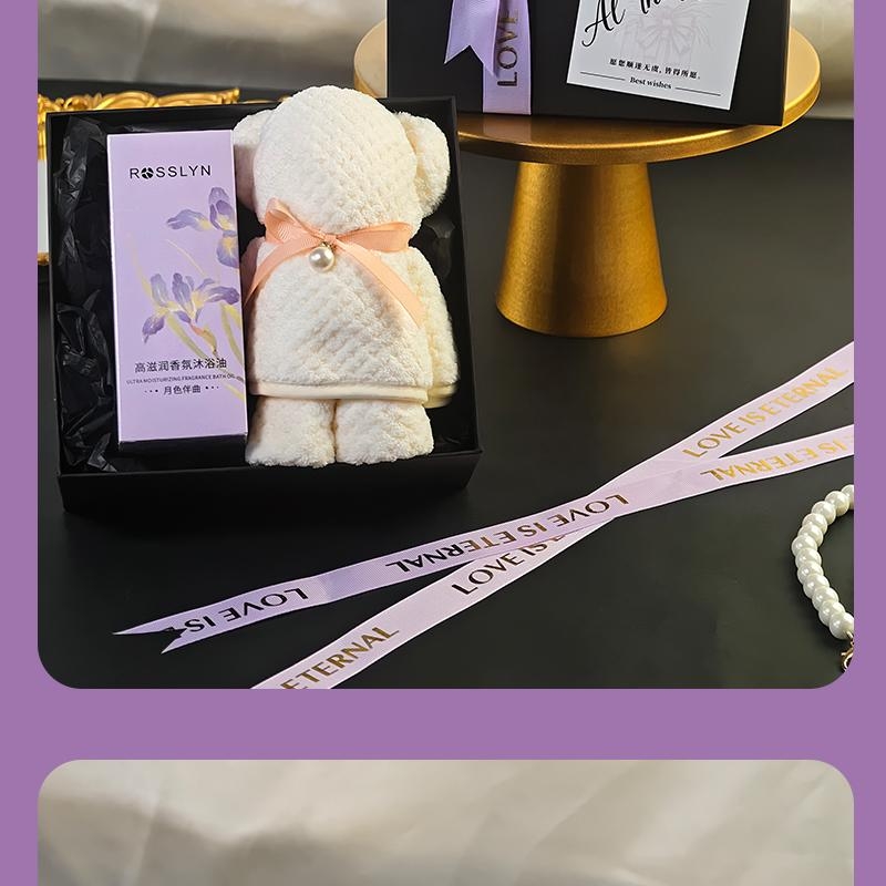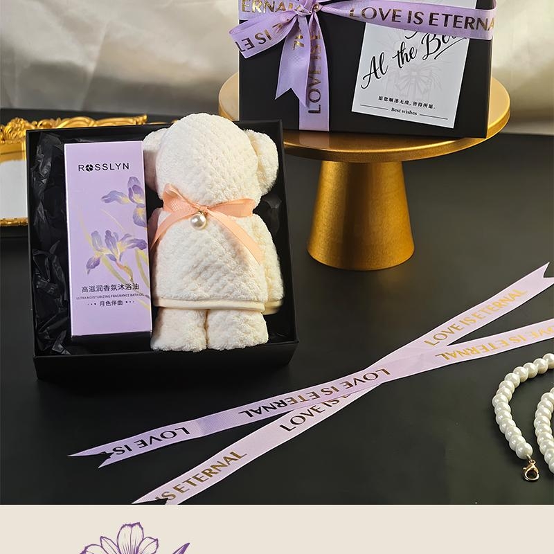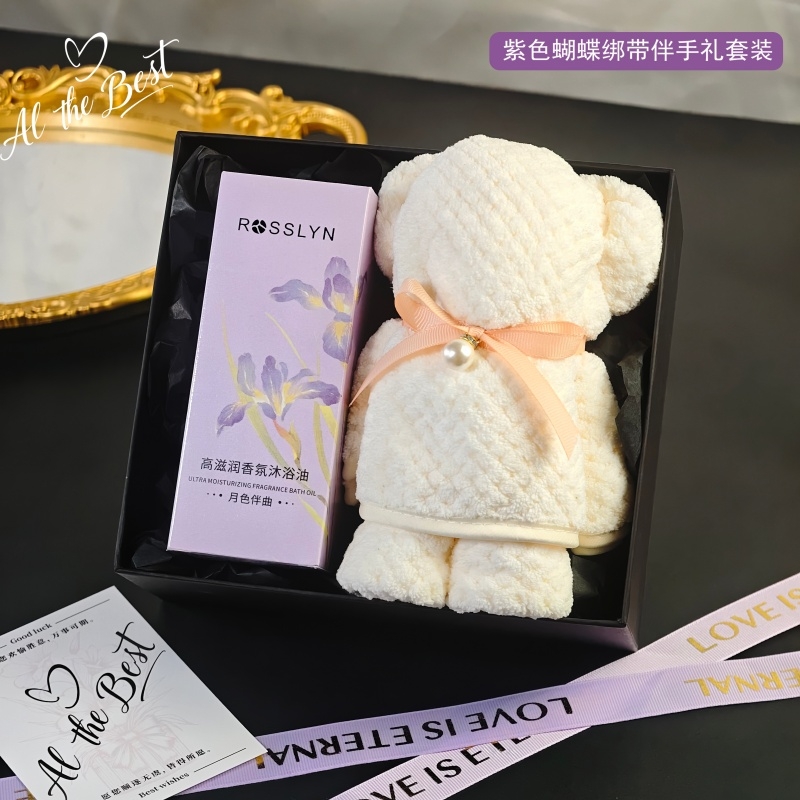 组合:罗斯琳沐浴油158ml、大毛巾熊75*34cm、紫色蝴蝶绑带礼盒+贺卡
