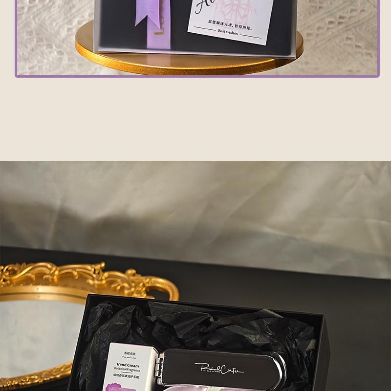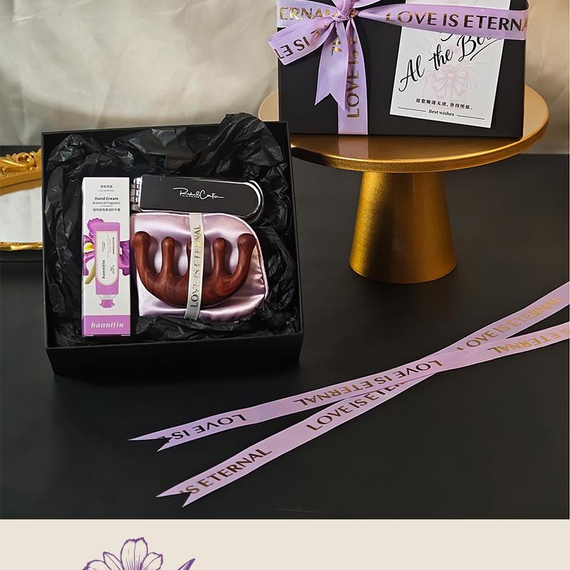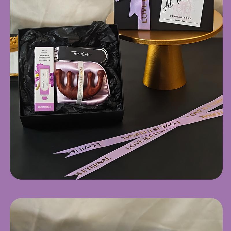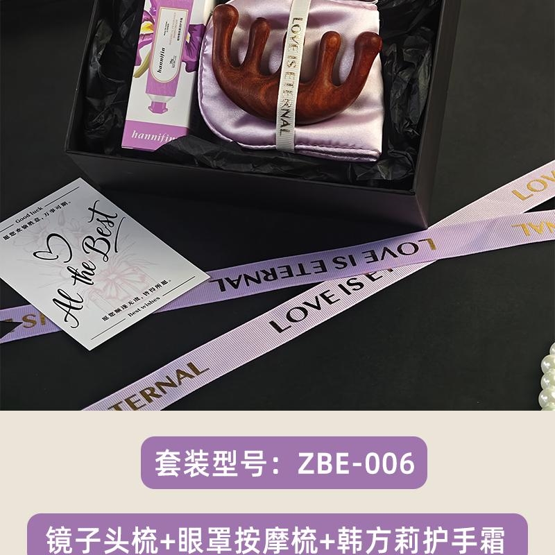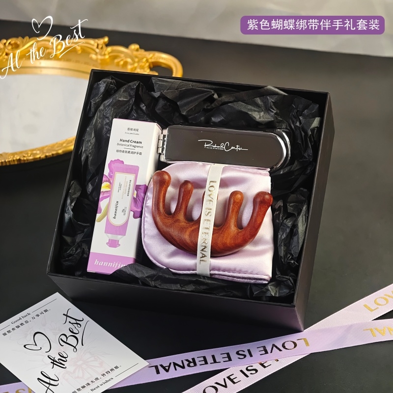 组合:镜子头梳、眼罩按摩梳、韩方莉护手霜35g、紫色蝴蝶绑带礼盒+贺卡