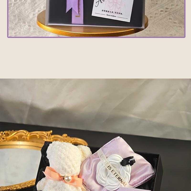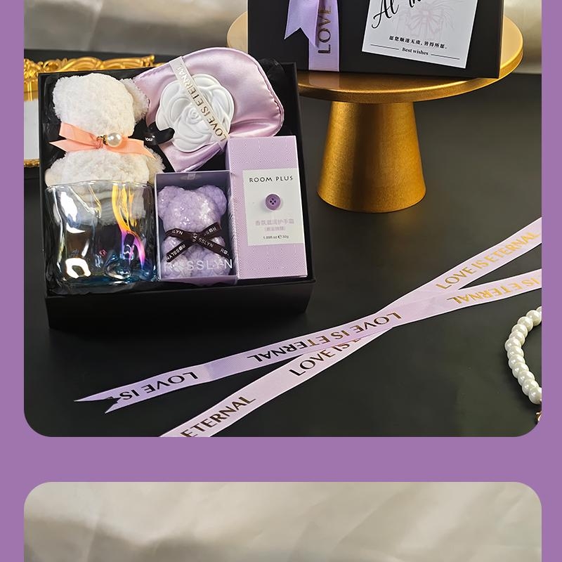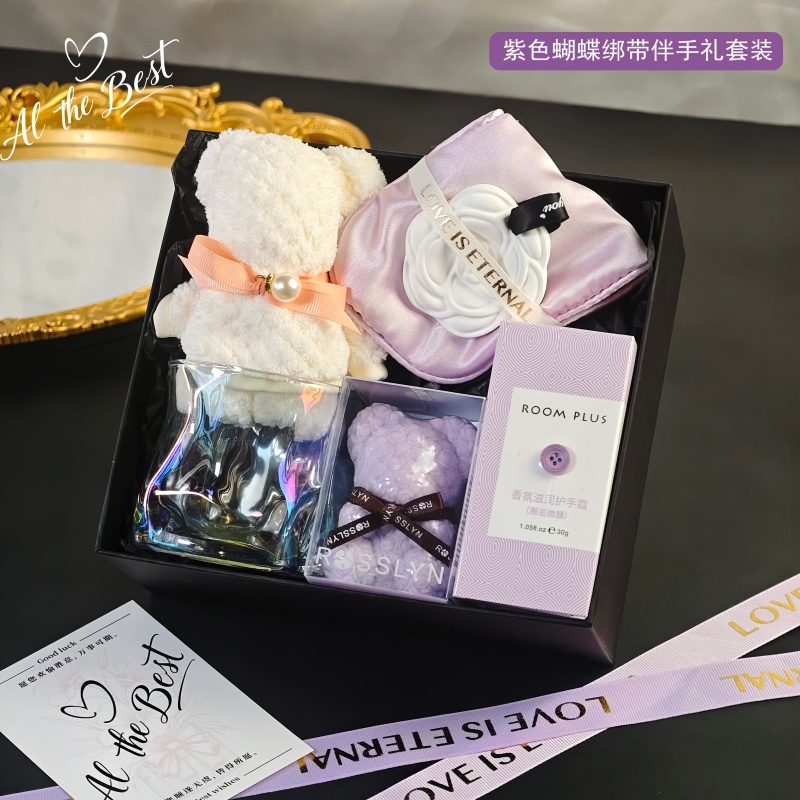 组合:香挂眼罩、扭扭玻璃杯、隆帕斯护手霜30g、罗斯琳小熊皂100g、小毛巾熊30*30cm、紫色蝴蝶绑带礼盒+贺卡
