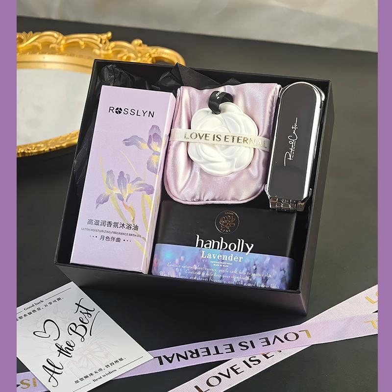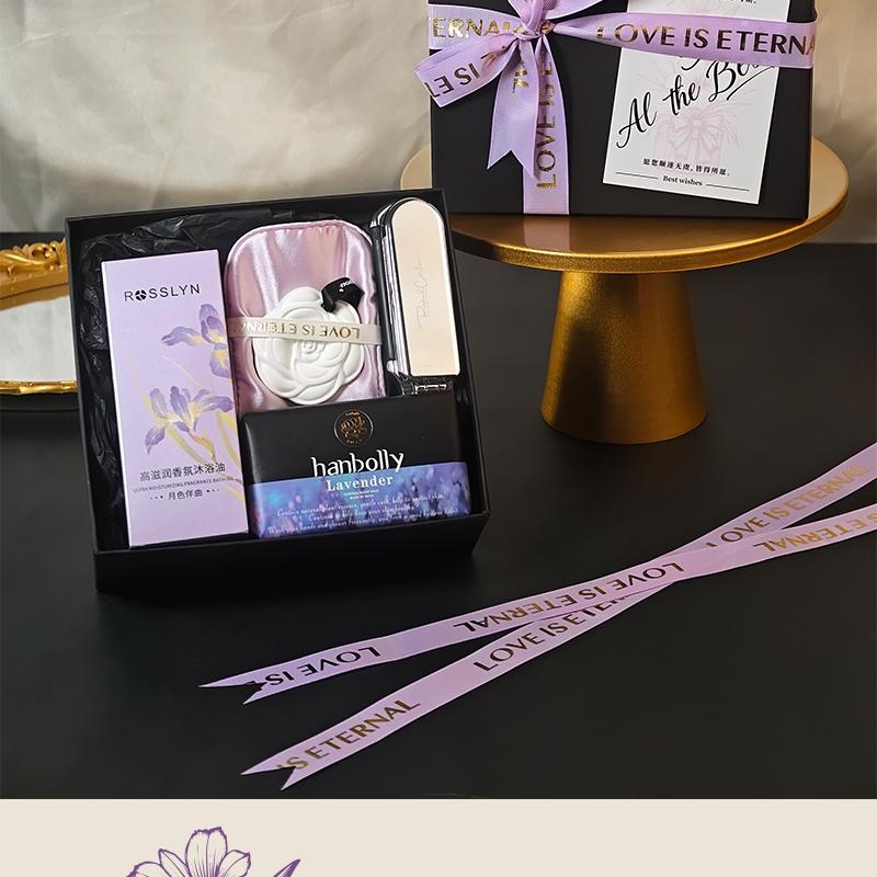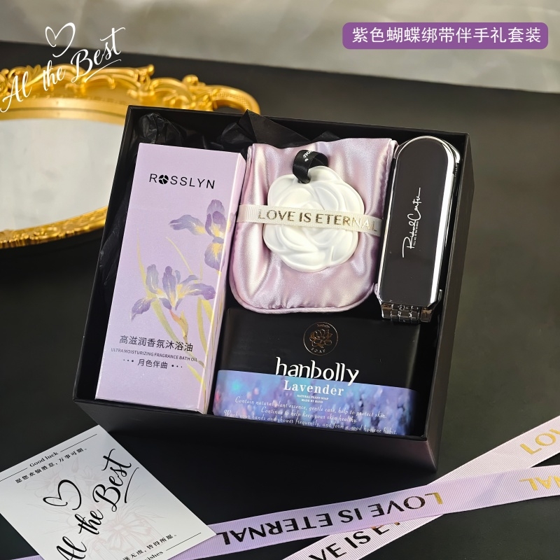 组合:头梳镜子、香挂眼罩、韩宝莉香氛皂250g、罗斯琳沐浴油158ml、紫色蝴蝶绑带礼盒+贺卡