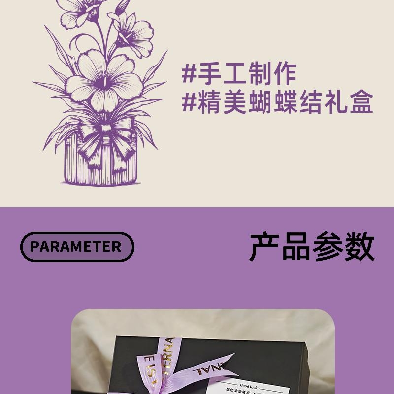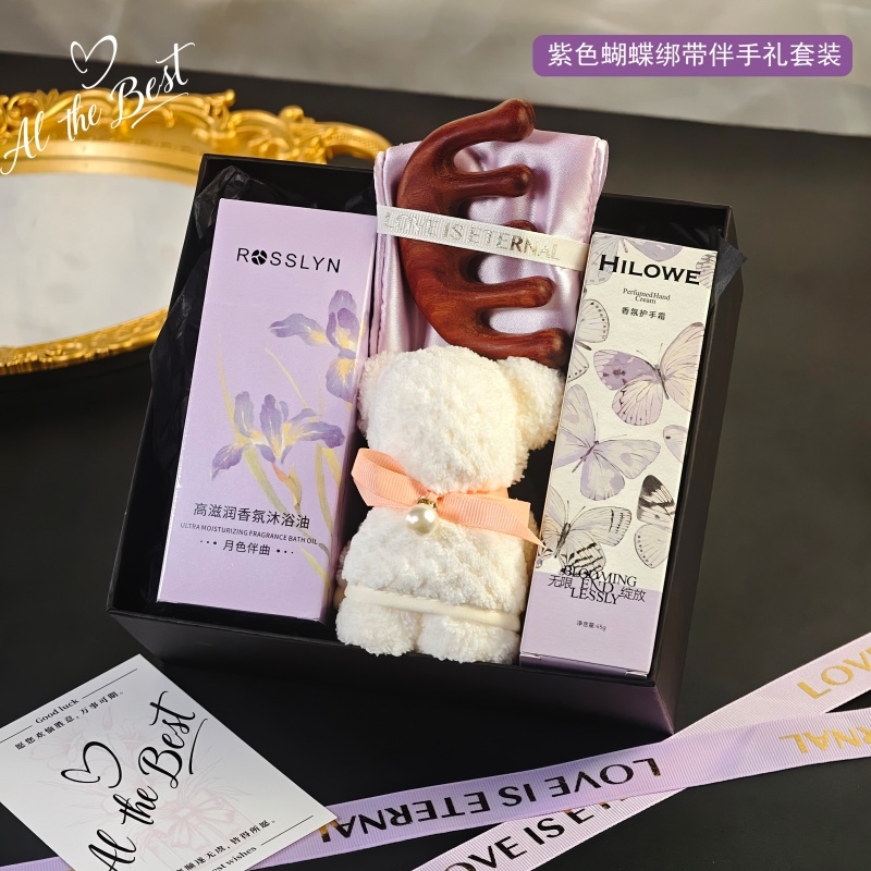 组合:眼罩按摩梳、小毛巾熊30*30cm、希罗韦护手霜45g、罗斯琳沐浴油158ml、紫色蝴蝶绑带礼盒+贺卡