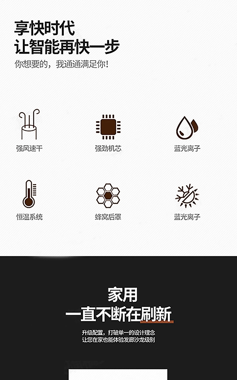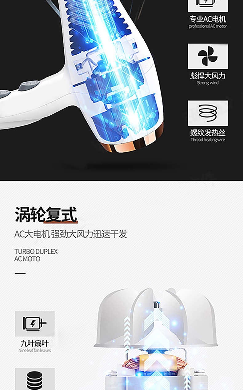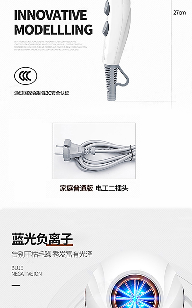 强风速干 ,强劲电芯;蓝光离子;蜂窝后罩